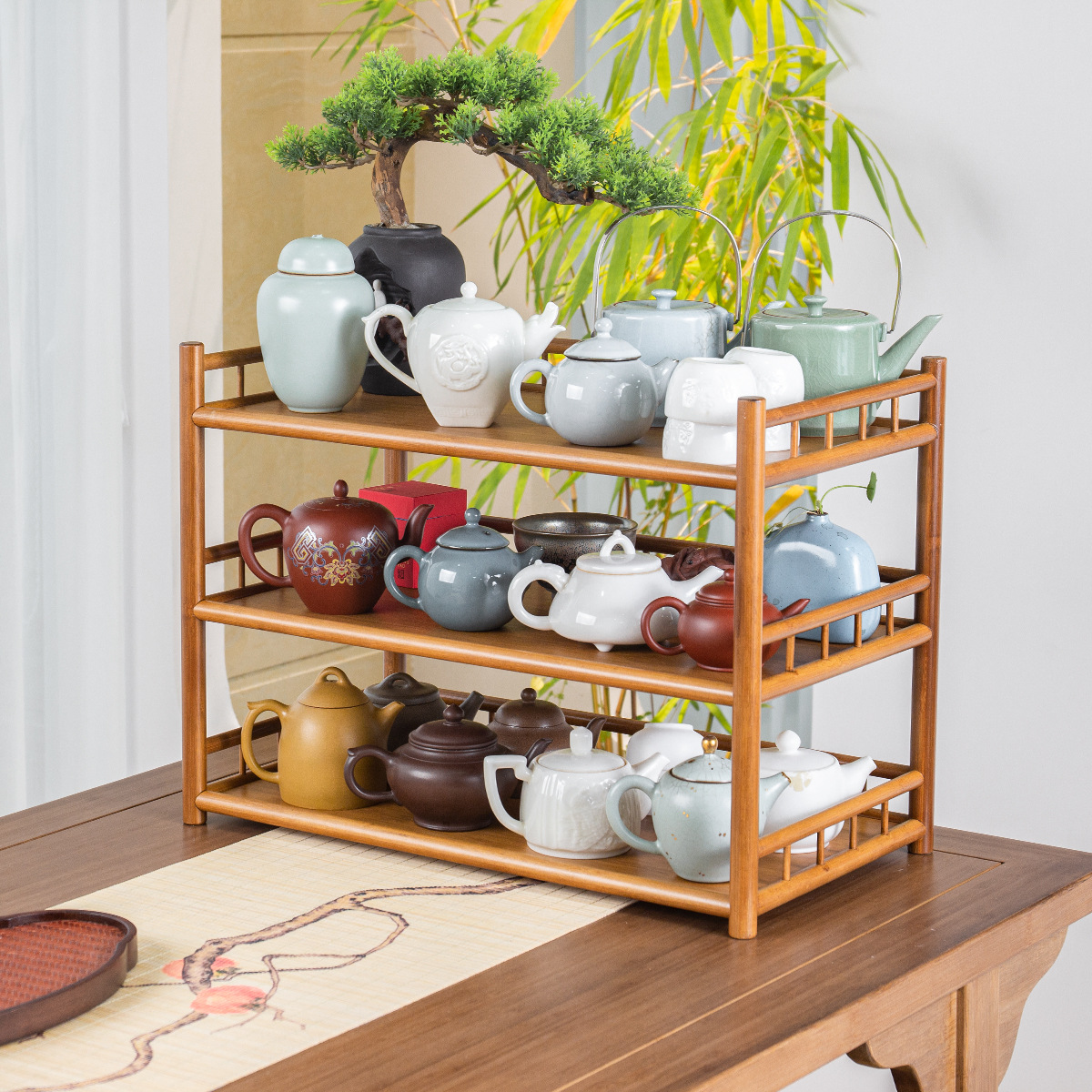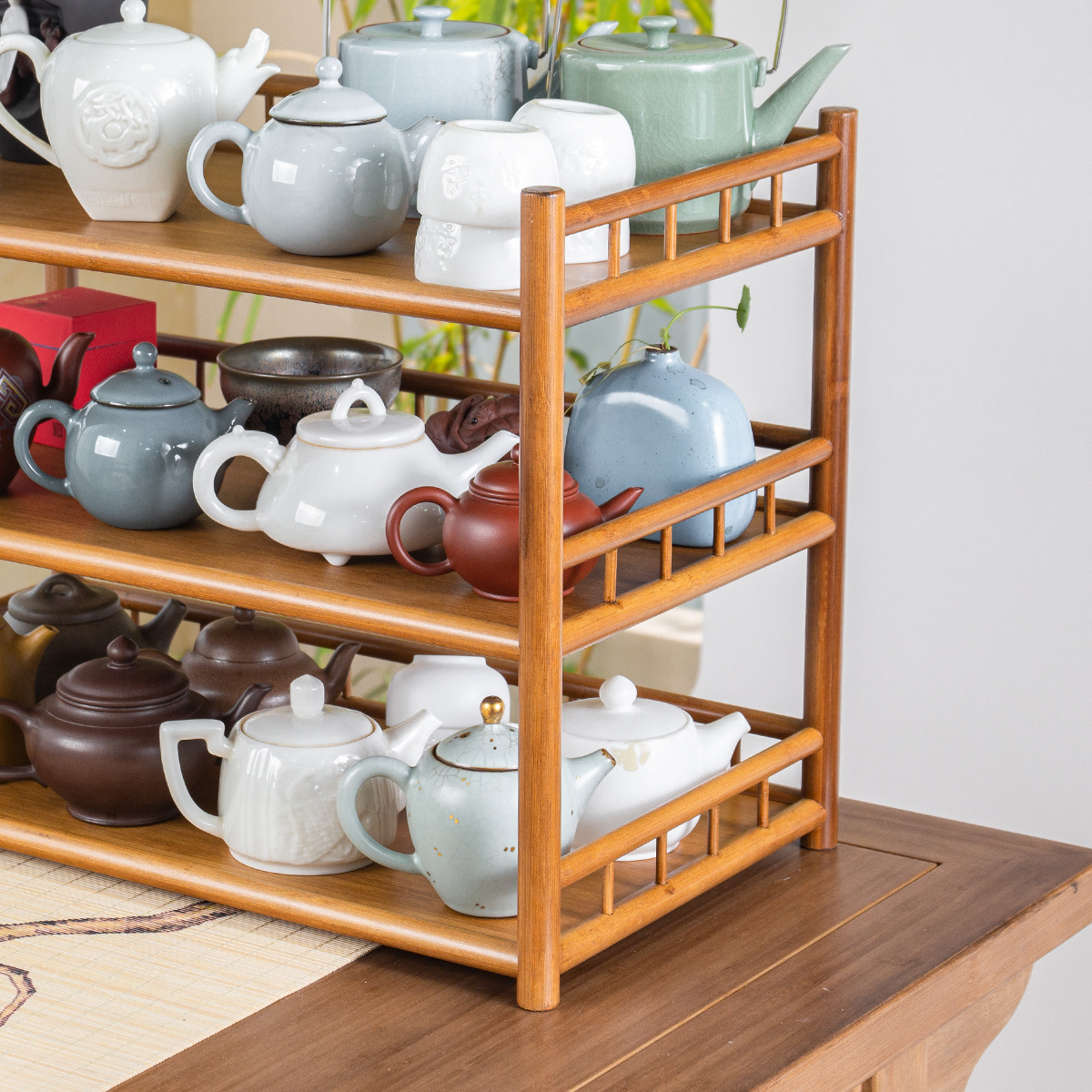 Bán buôn giá đỡ trà ba tầng bằng tre có hàng rào ấm trà để bàn ấm trà tử sa Giá đựng cốc trà giá đựng đồ Bộ trà