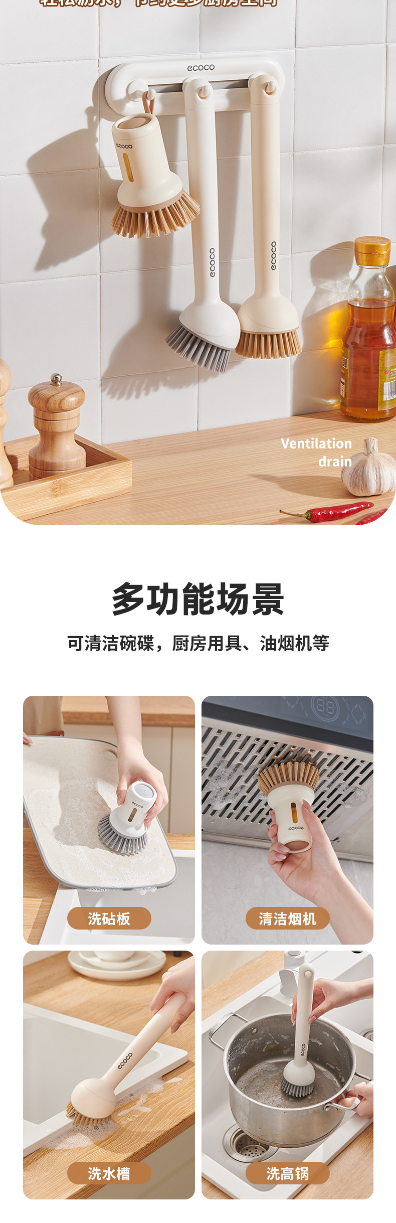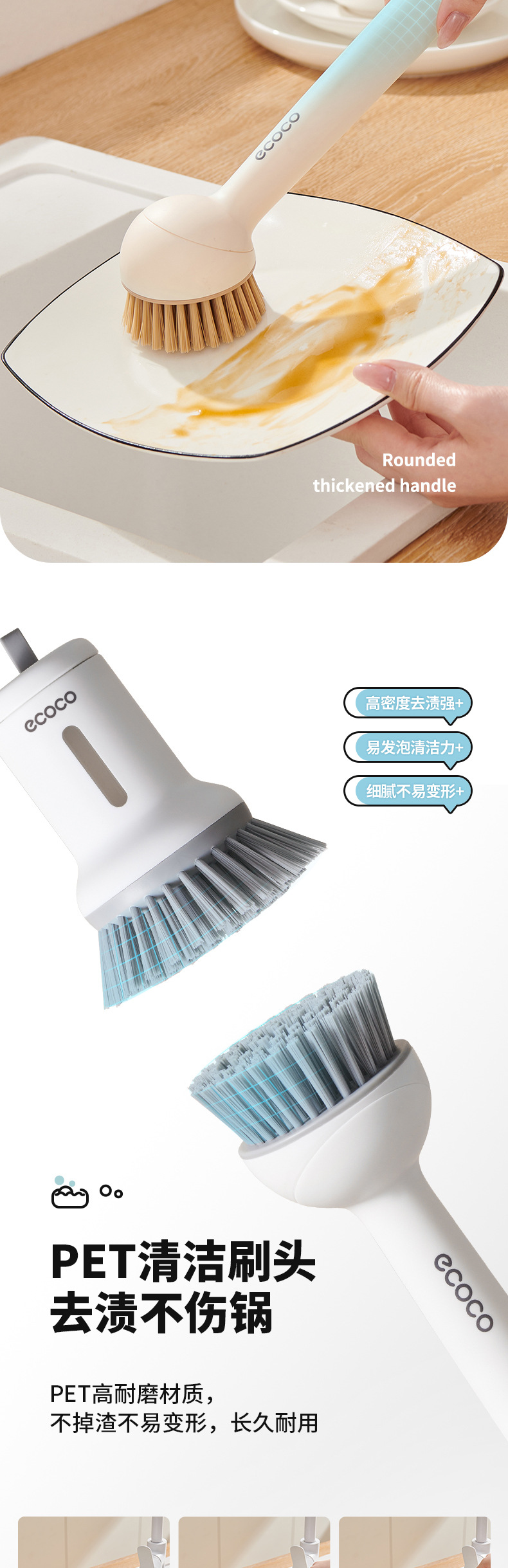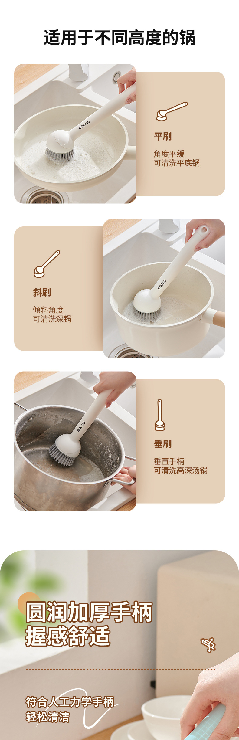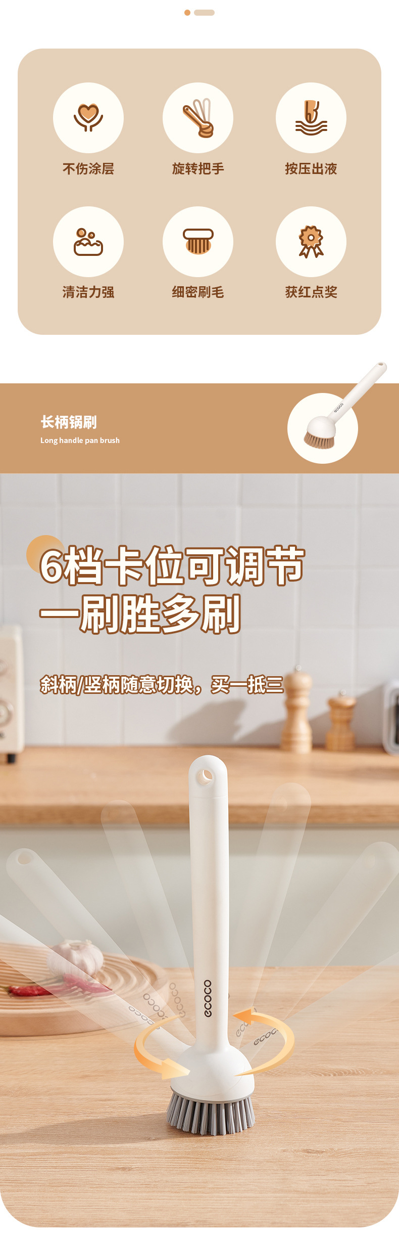 - Bàn chải nồi có thể ép đùn sáng tạo có tay cầm, bàn chải dùng để rửa bát gia đình, tay cầm dài có thể xoay