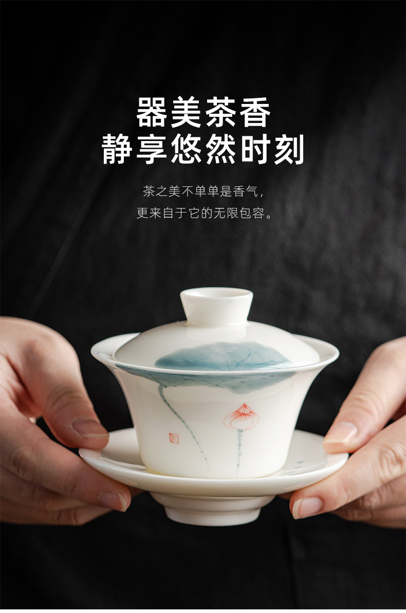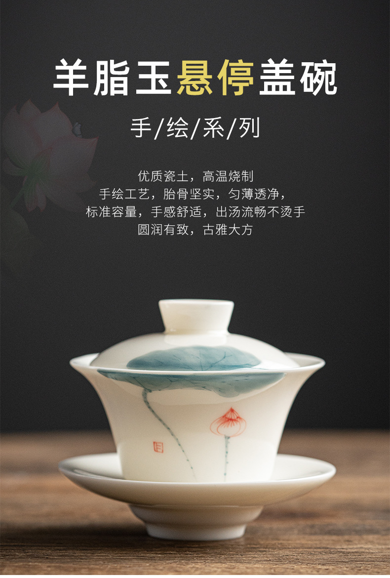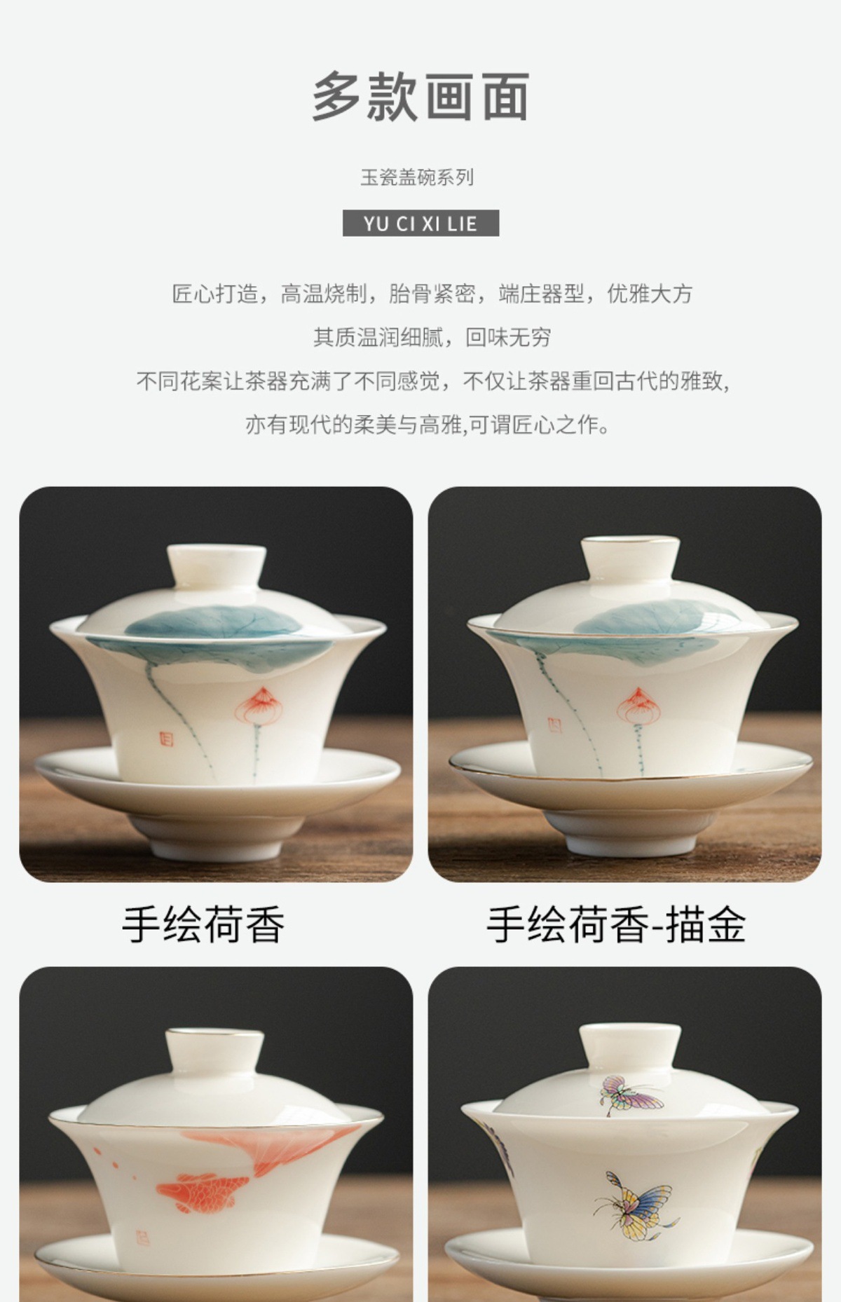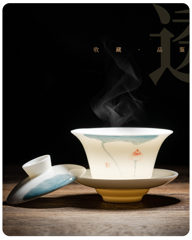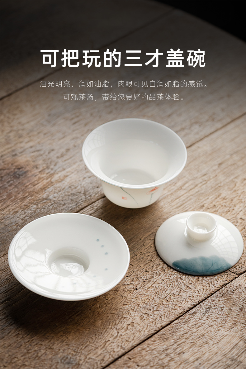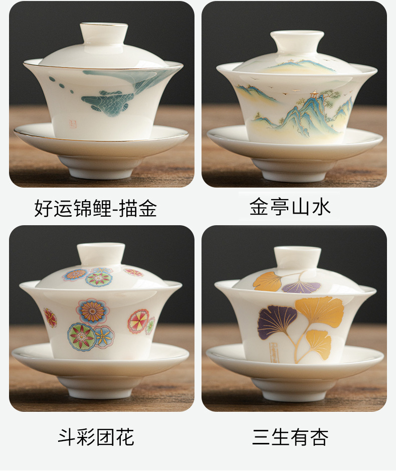 - Bát có nắp ba tài bằng ngọc trắng vẽ tay để pha trà, tách trà nổi đơn bằng sứ trắng, bộ trà kung fu bằng gốm.