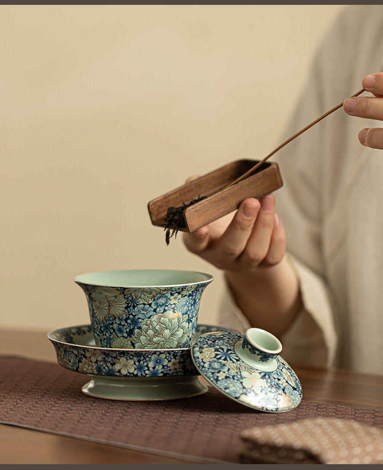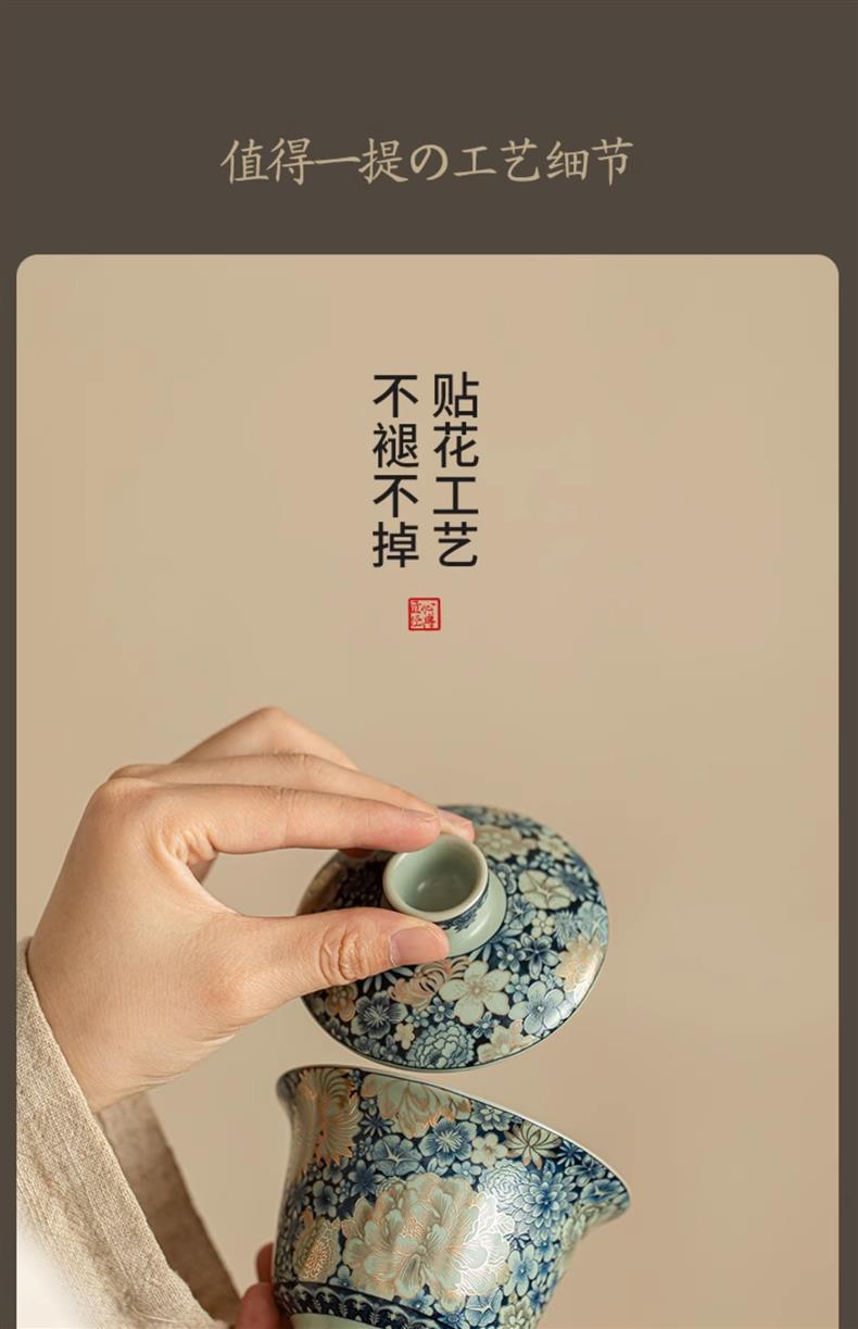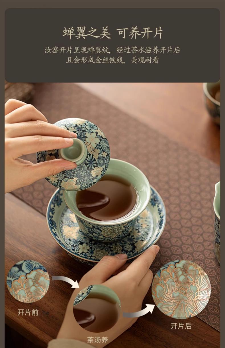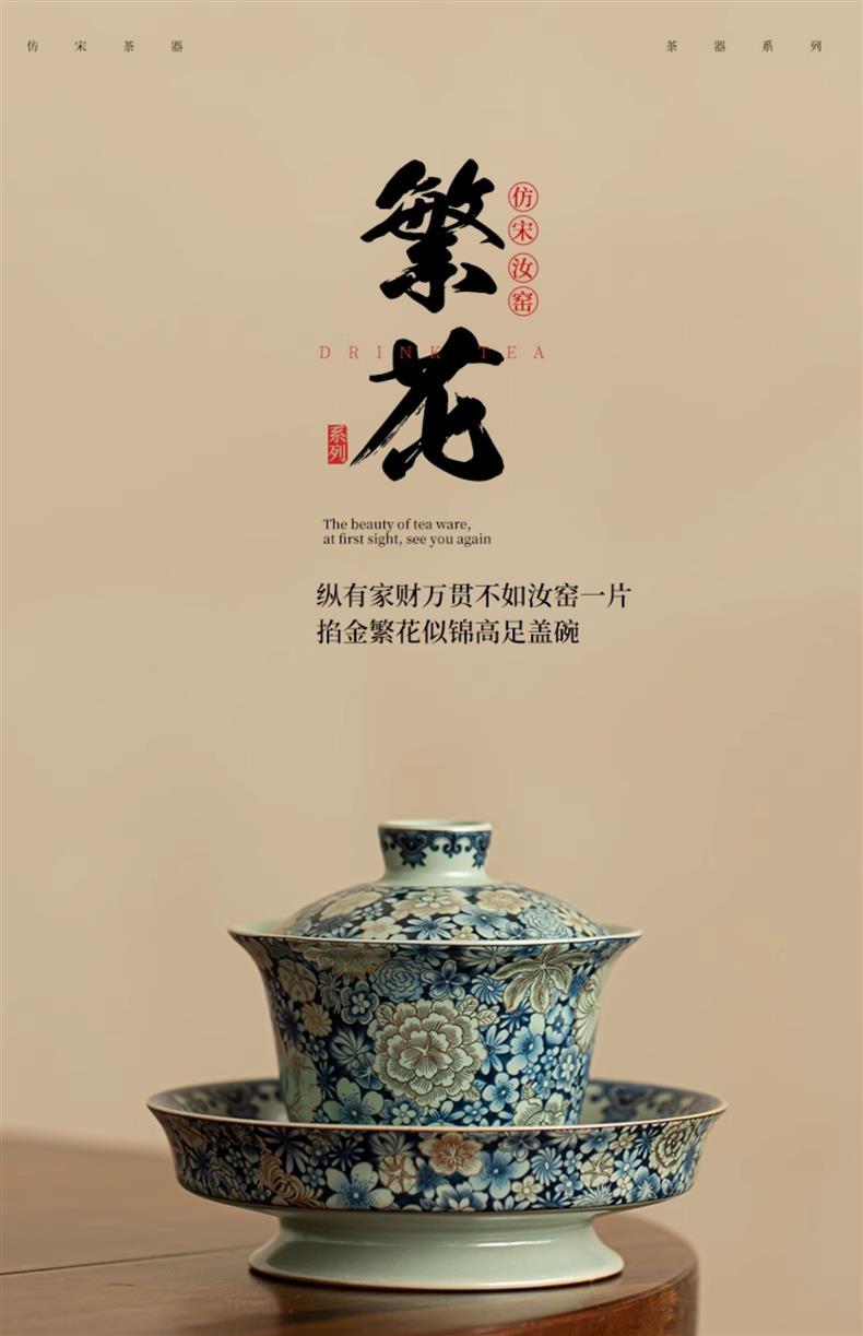 Bát có nắp ba tài hoa Ru Lò gốm gia dụng cao chân kiểu Trung Quốc cổ điển bàn pha trà phục vụ bát trà Kung Fu bộ trà bán buôn