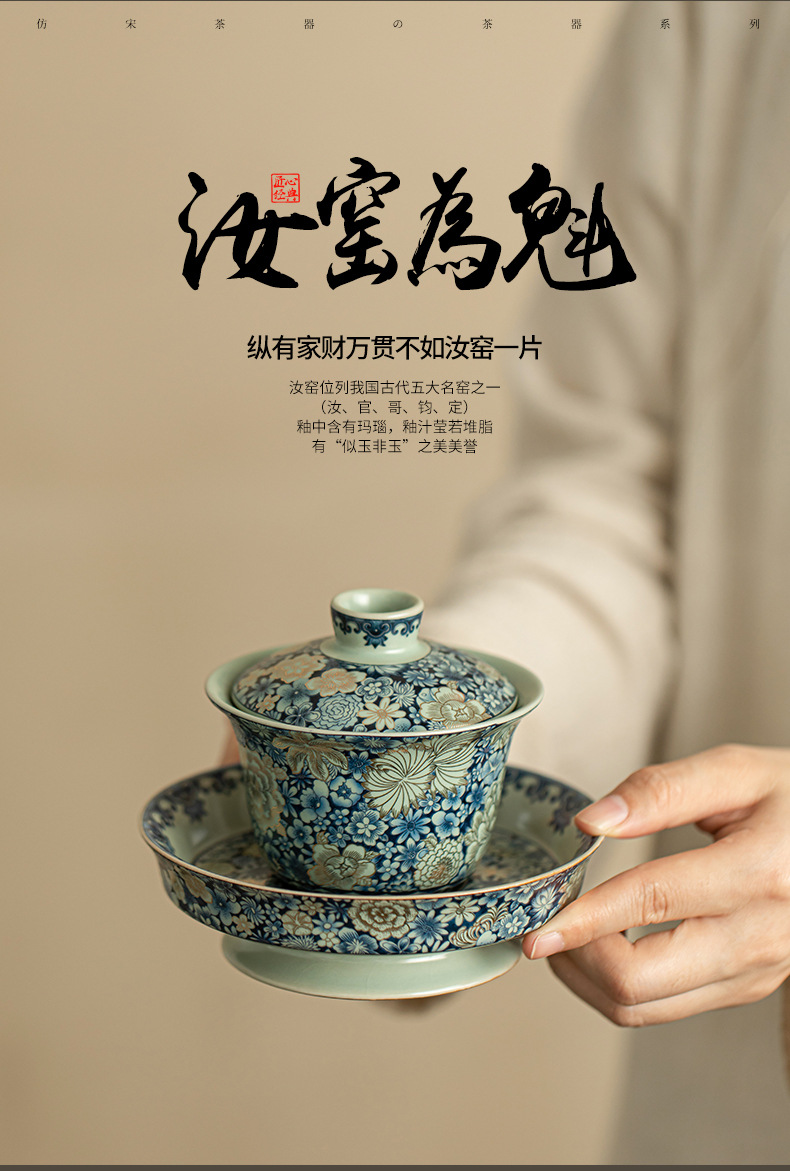 - Bát có nắp ba tài hoa Ru Lò gốm gia dụng cao chân kiểu Trung Quốc cổ điển bàn pha trà phục vụ bát trà Kung Fu bộ trà bán buôn