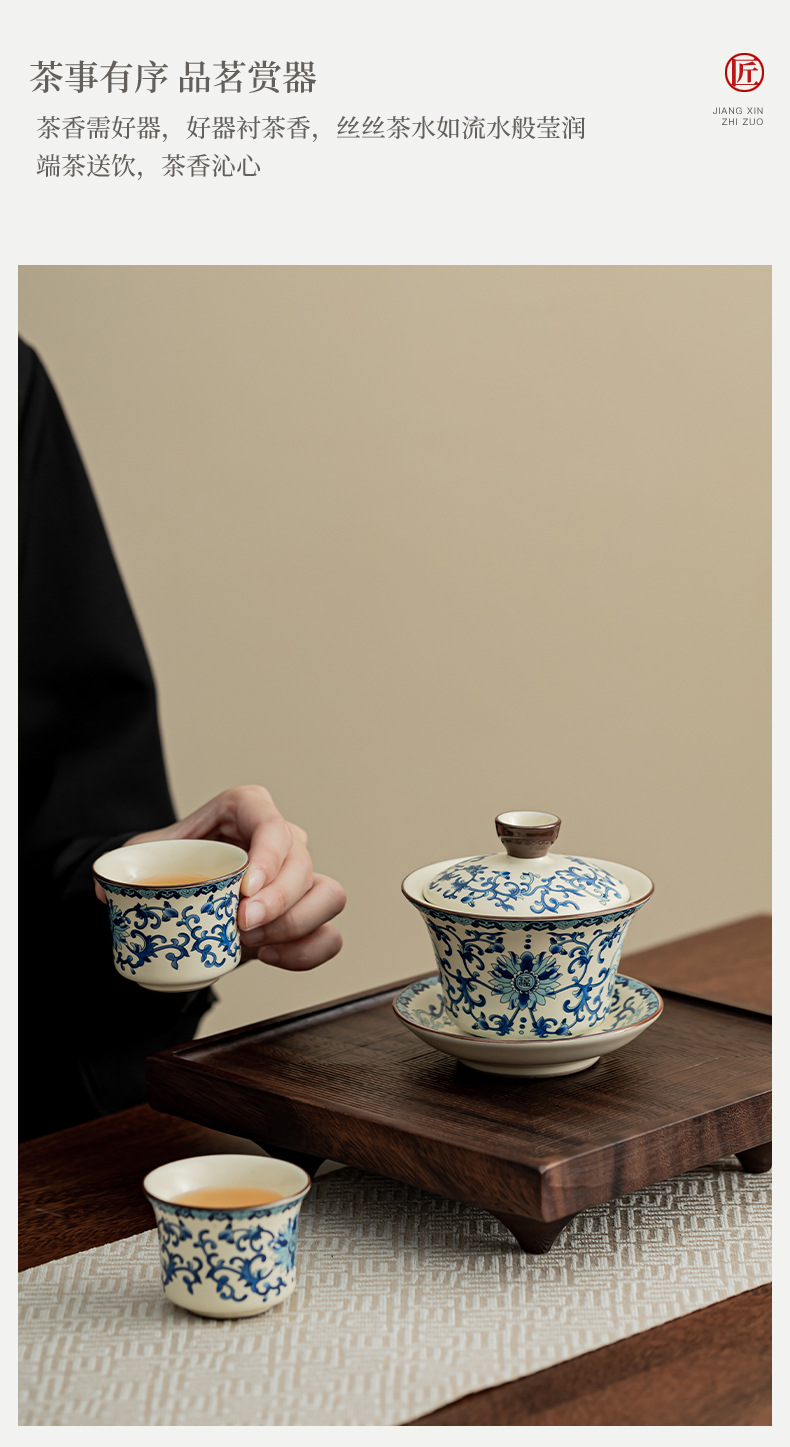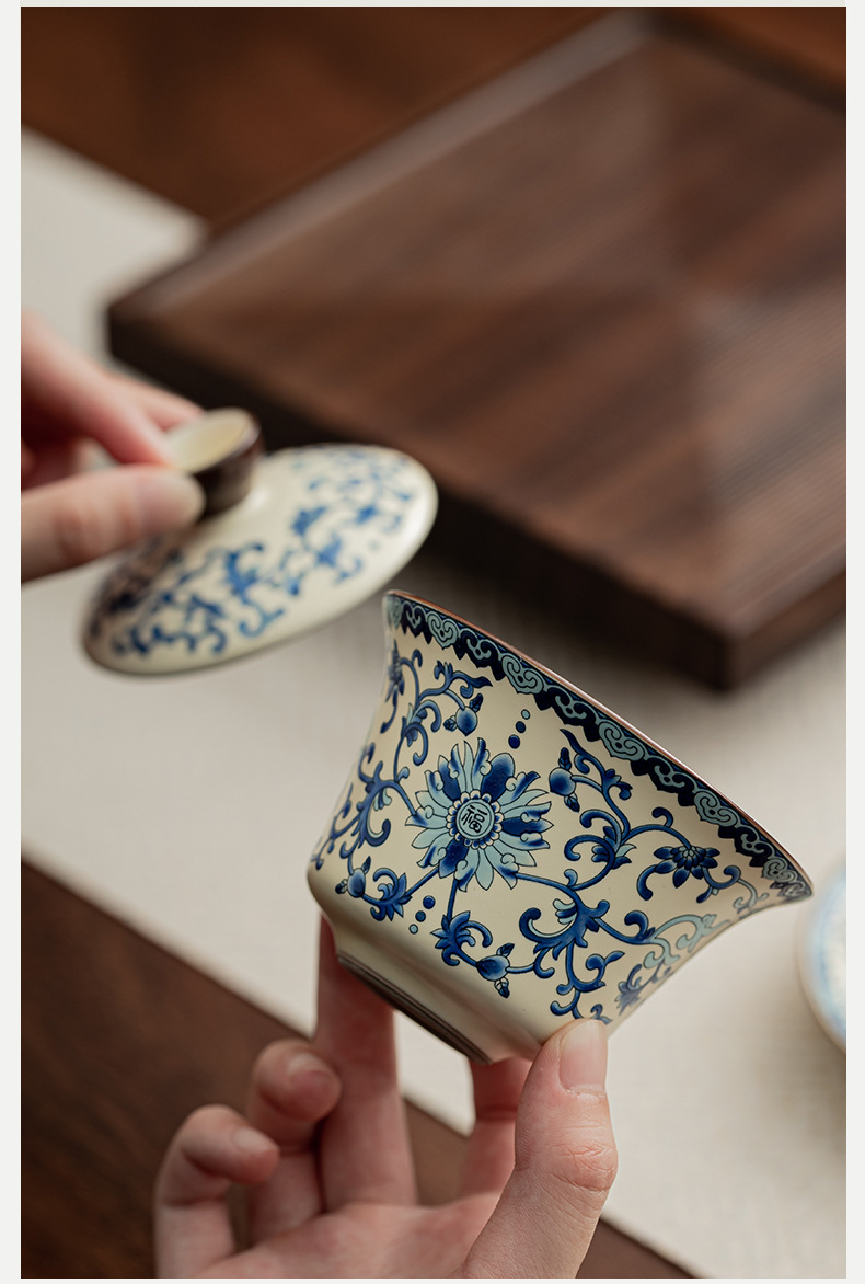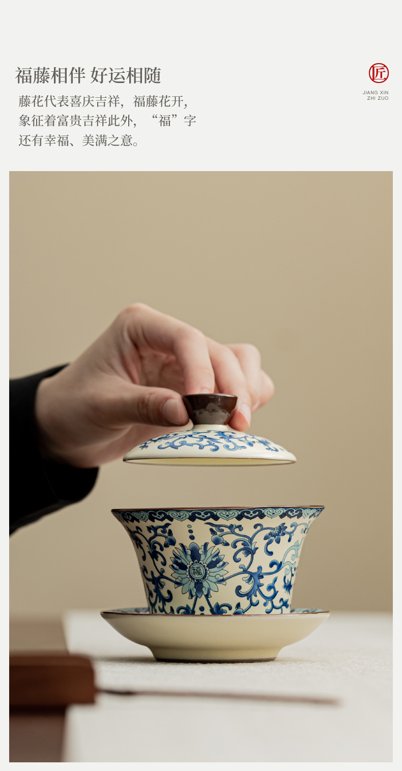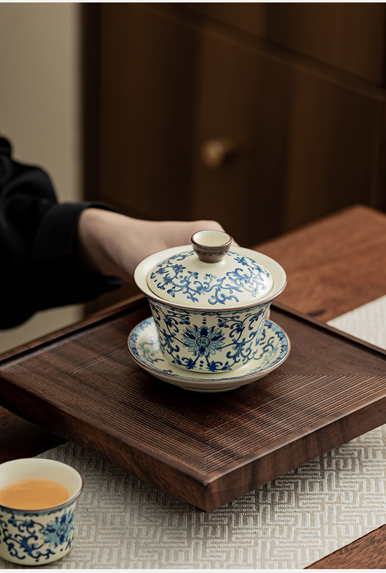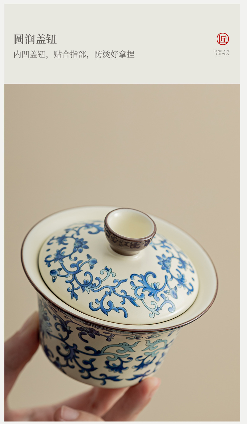 Bát có nắp ba tài màu xanh và trắng Ruyao Bộ ấm trà Kung Fu cổ điển Bát pha trà gốm sứ gia dụng có nắp không nóng