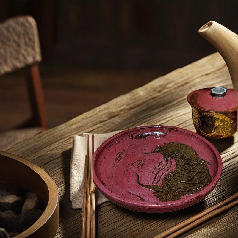 Bát có nắp, bát pha trà gốm thô kiểu Nhật thủ công, bộ trà gia dụng sáng tạo, cốc có nắp, cá rồng vàng, trà màu đỏ rượu