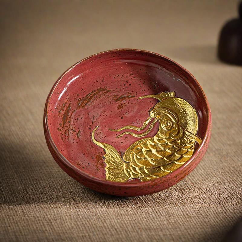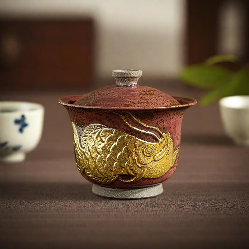 - Bát có nắp, bát pha trà gốm thô kiểu Nhật thủ công, bộ trà gia dụng sáng tạo, cốc có nắp, cá rồng vàng, trà màu đỏ rượu