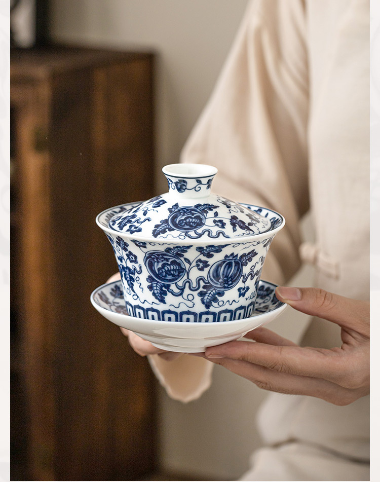 - Bát có nắp gốm trắng xanh Bộ trà Kung Fu màu xanh lá cây bóng lớn đơn bát pha trà cổ điển cốc trà tôn trọng bát ba tài chống bỏng