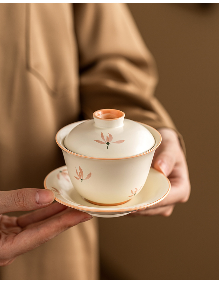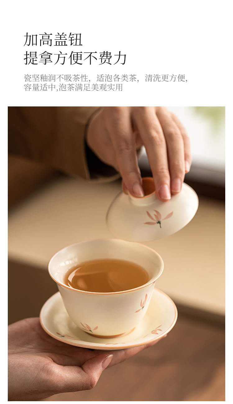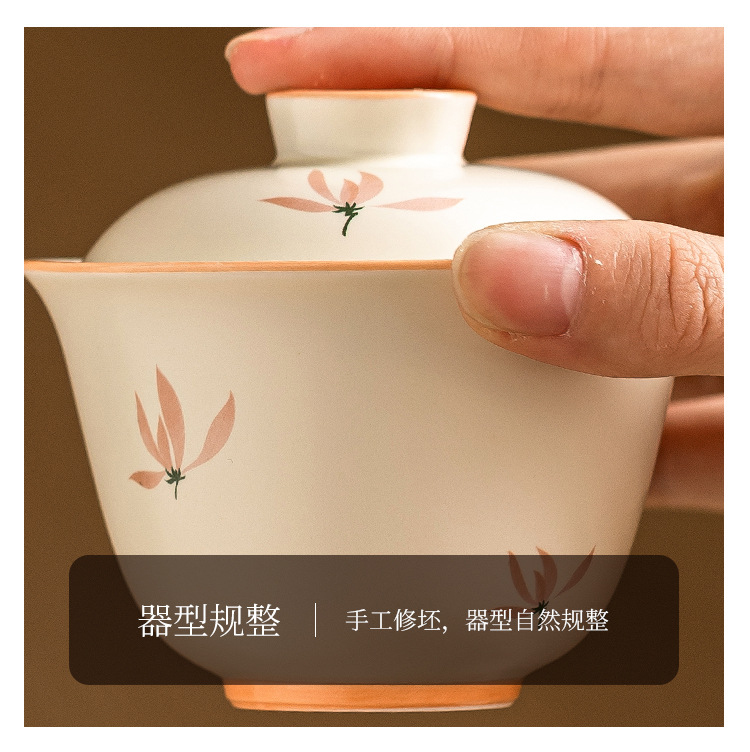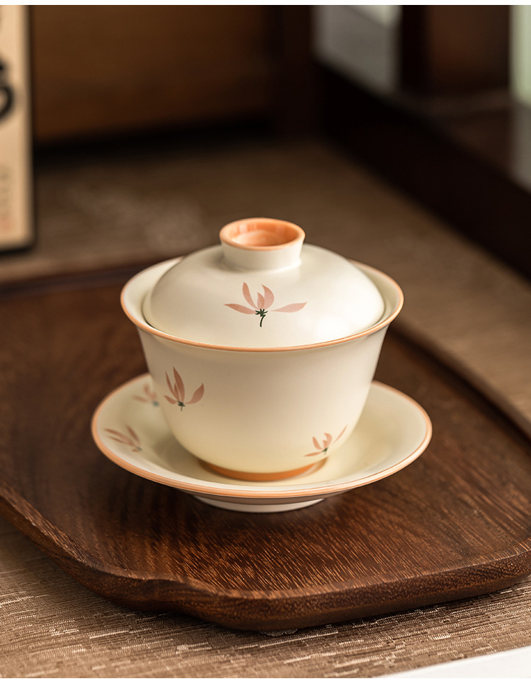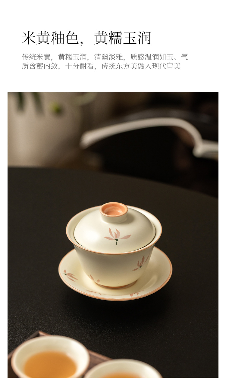Bát có nắp tinh xảo hoa lan tráng men màu vàng gạo bát trà tam tài cao cấp bộ trà pha trà gia dụng gốm sứ kiểu Trung Quốc dung tích lớn