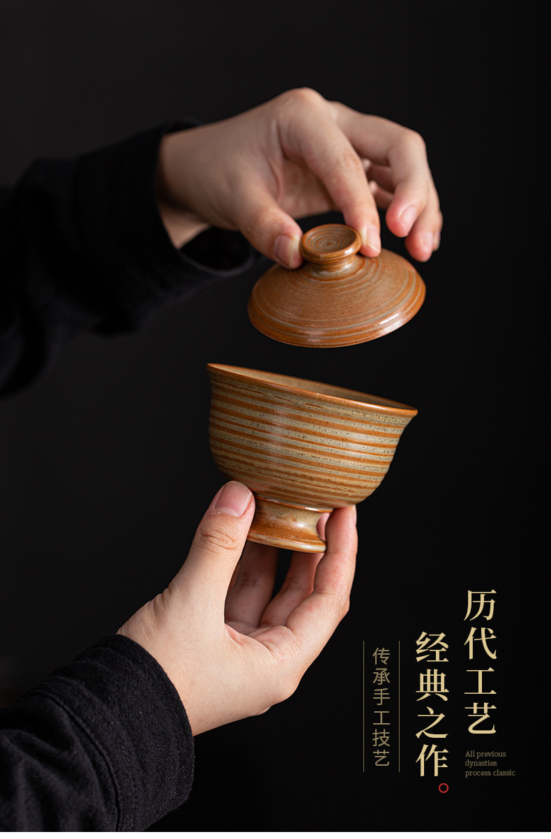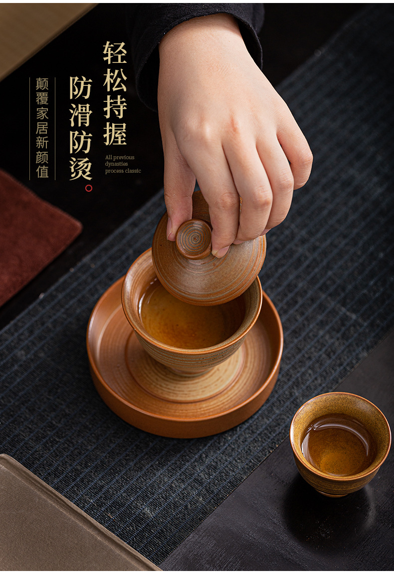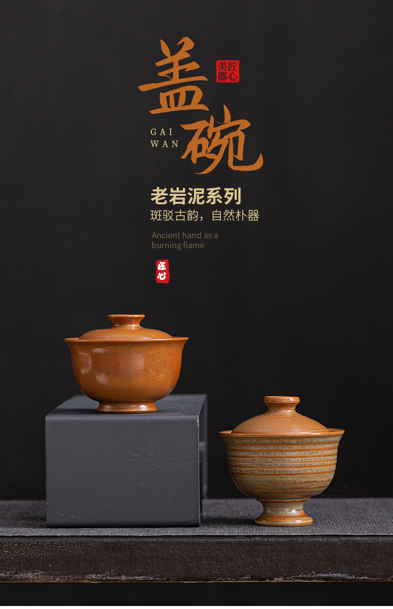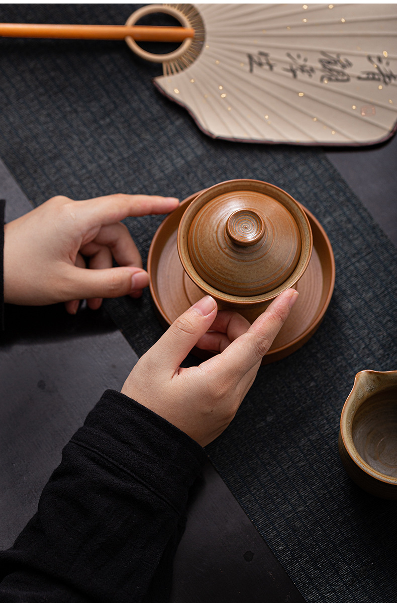 Bát đựng trà bằng đất đá cũ tráng men hai nắp phong cách Trung Quốc cổ điển gốm thô cũ bằng đất sét đá cũ hộp quà bộ trà kungfu gia dụng