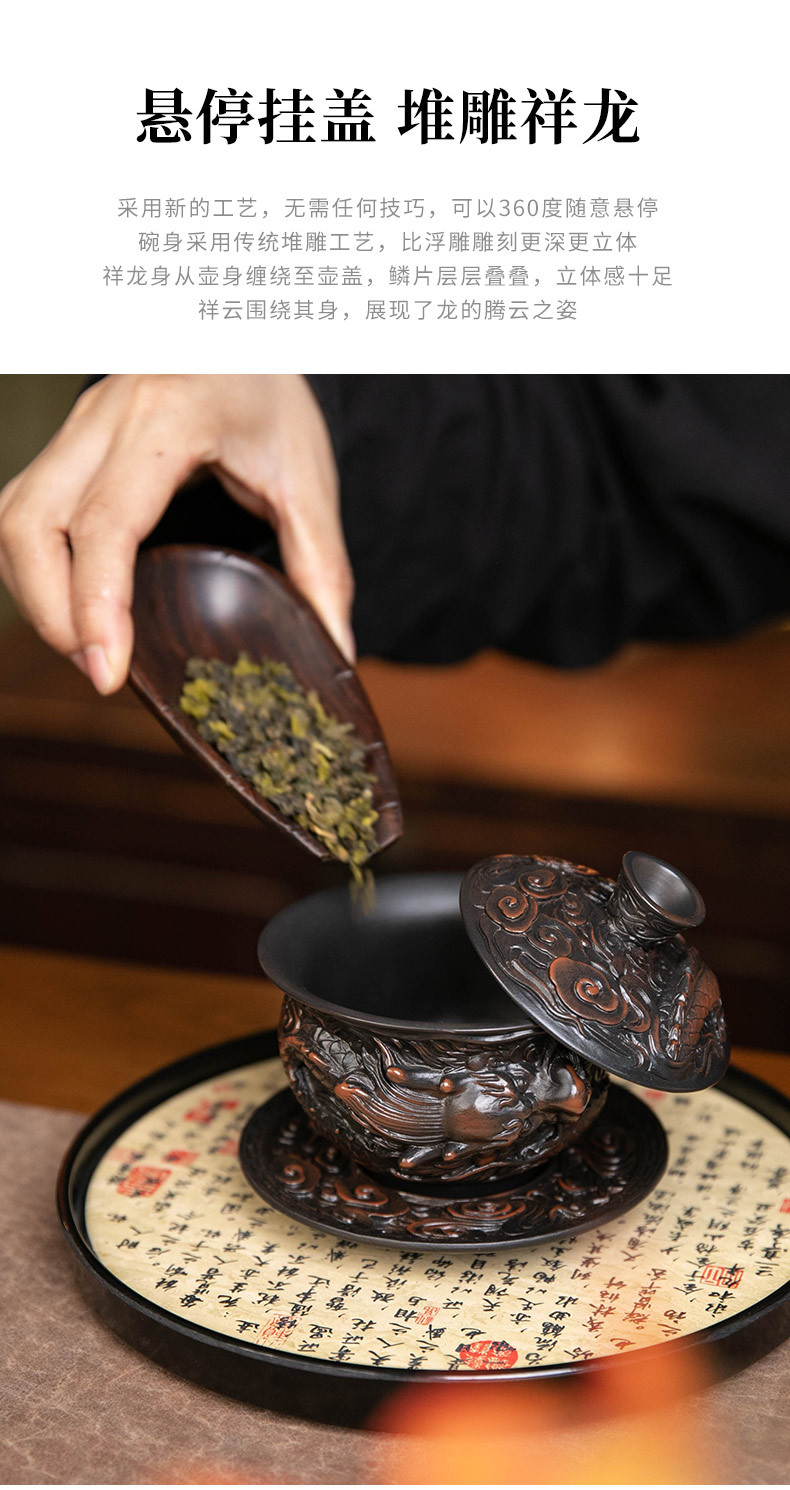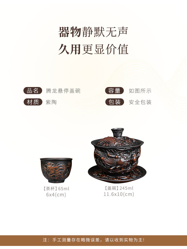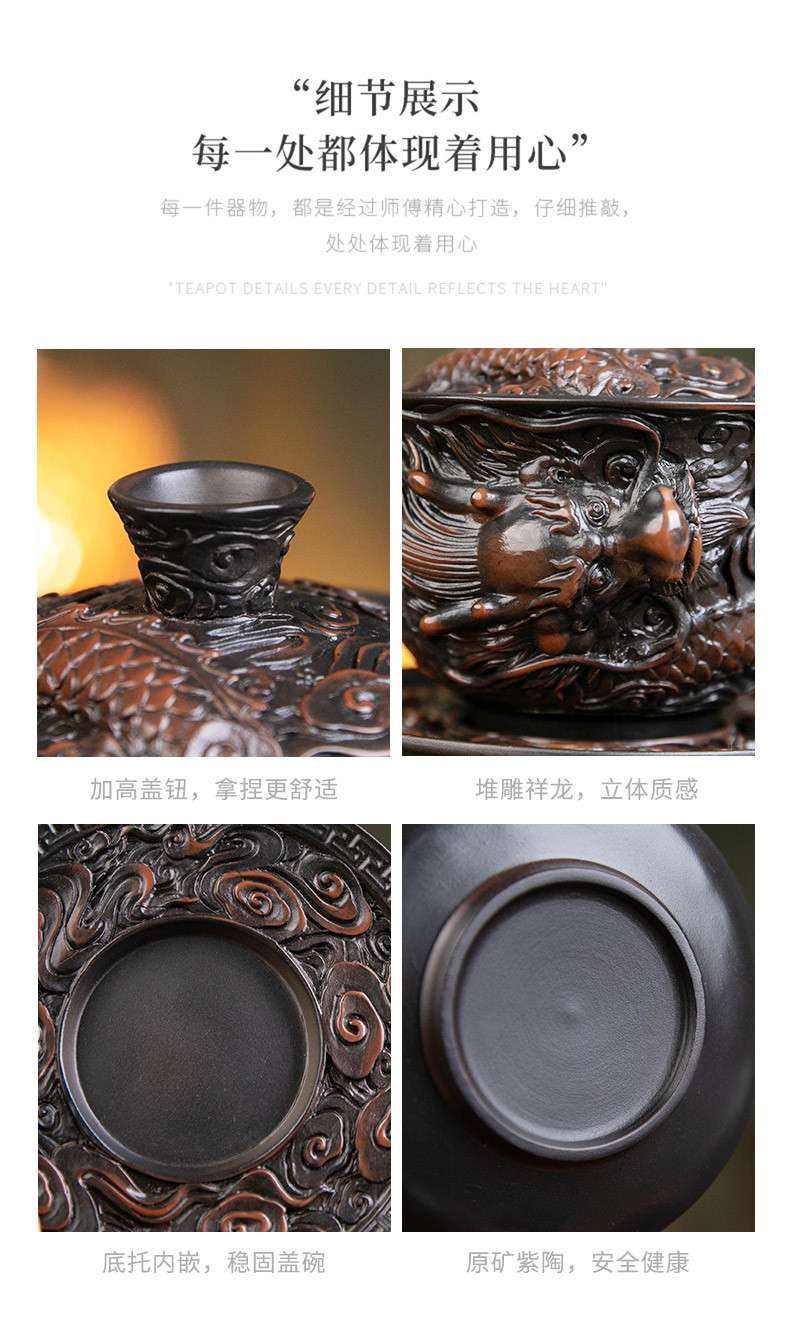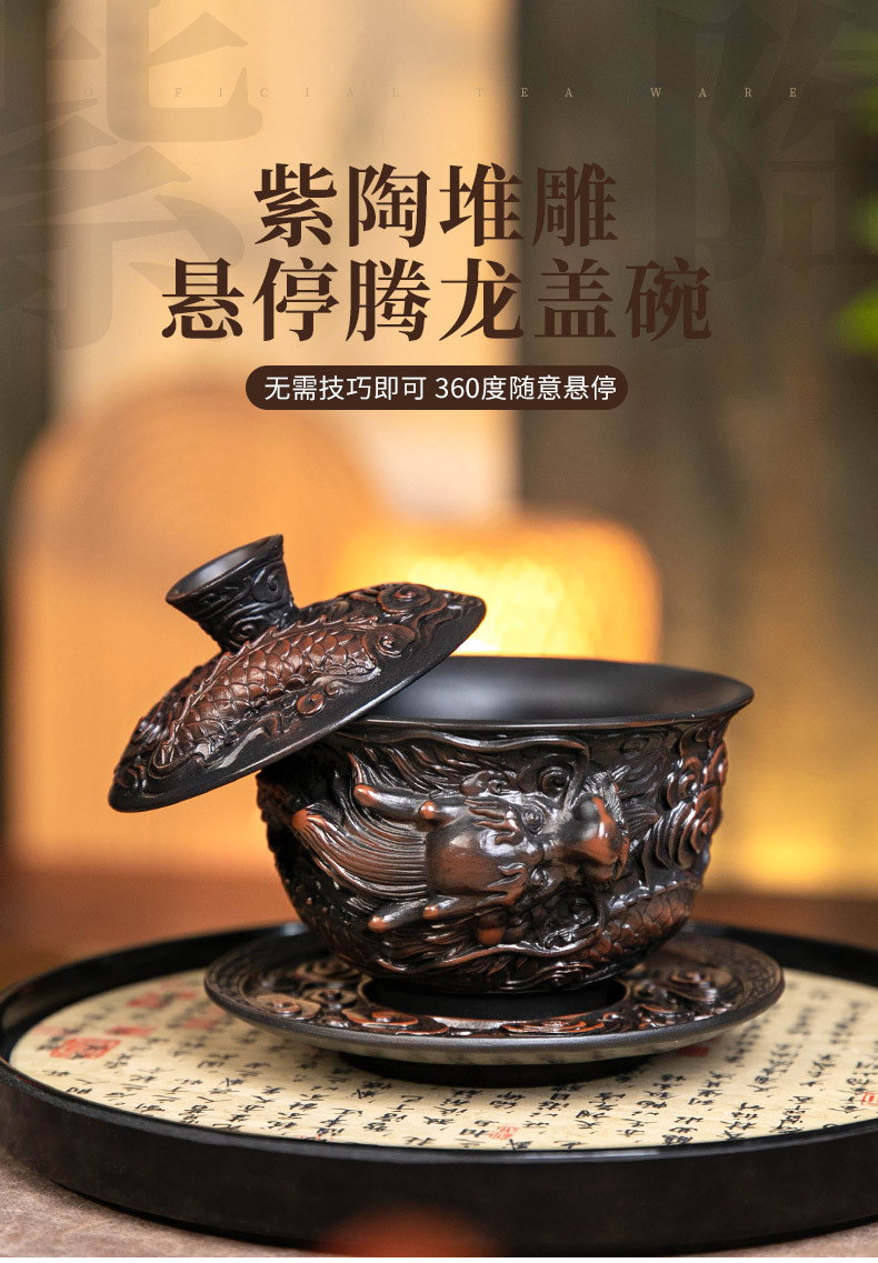 - Bát nắp ba tài do gốm tím Tenglong treo hoàn toàn bằng tay đống bộ trà Kung Fu chạm khắc bát trà bát pha trà đơn cỡ lớn gia dụng