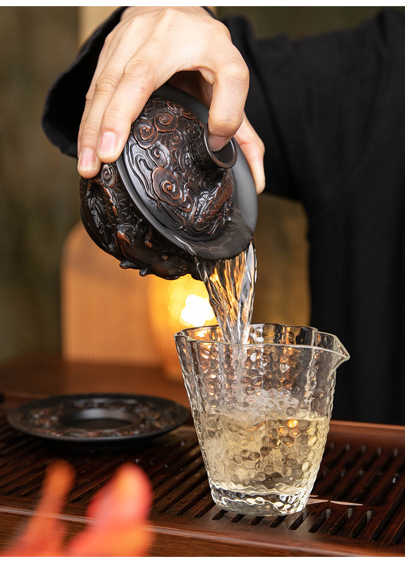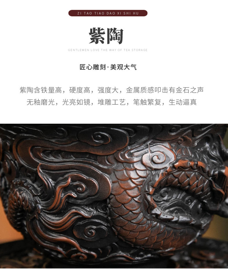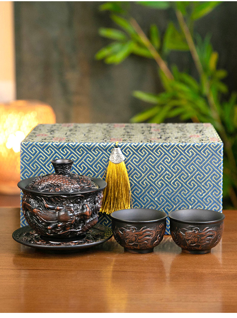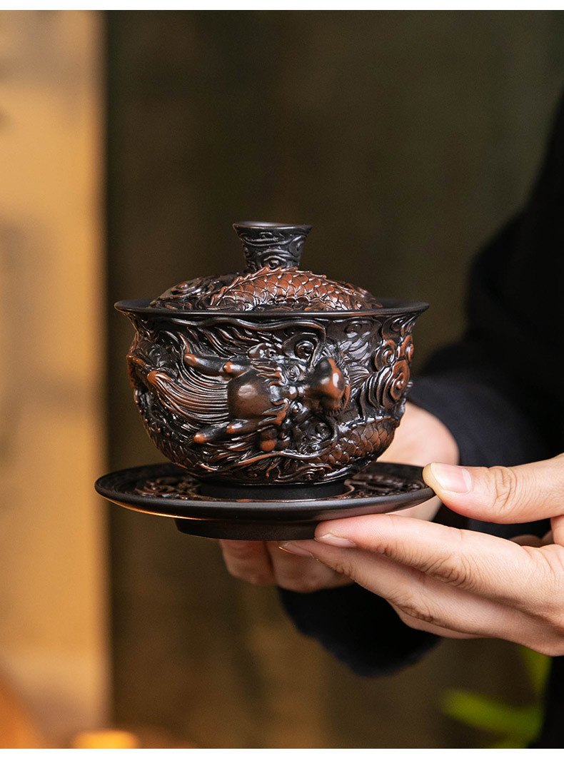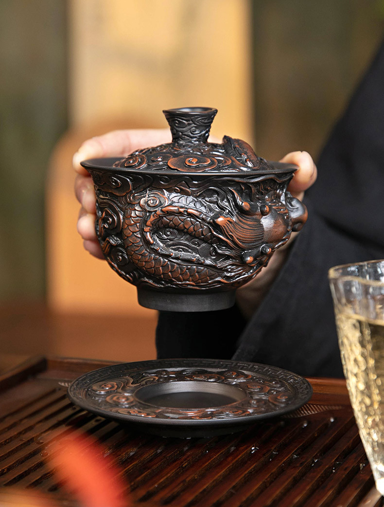 - Bát nắp ba tài do gốm tím Tenglong treo hoàn toàn bằng tay đống bộ trà Kung Fu chạm khắc bát trà bát pha trà đơn cỡ lớn gia dụng