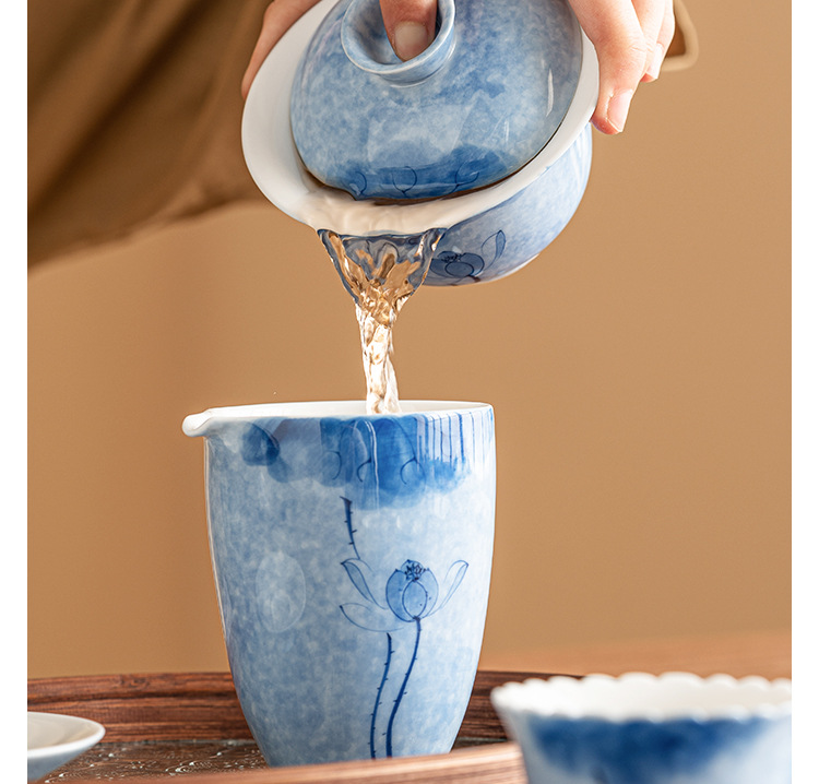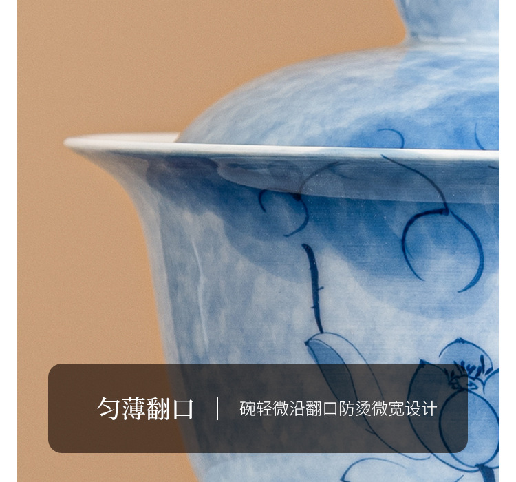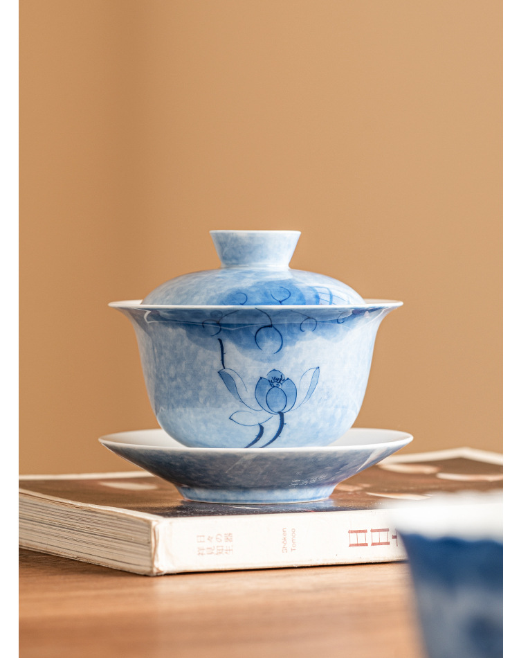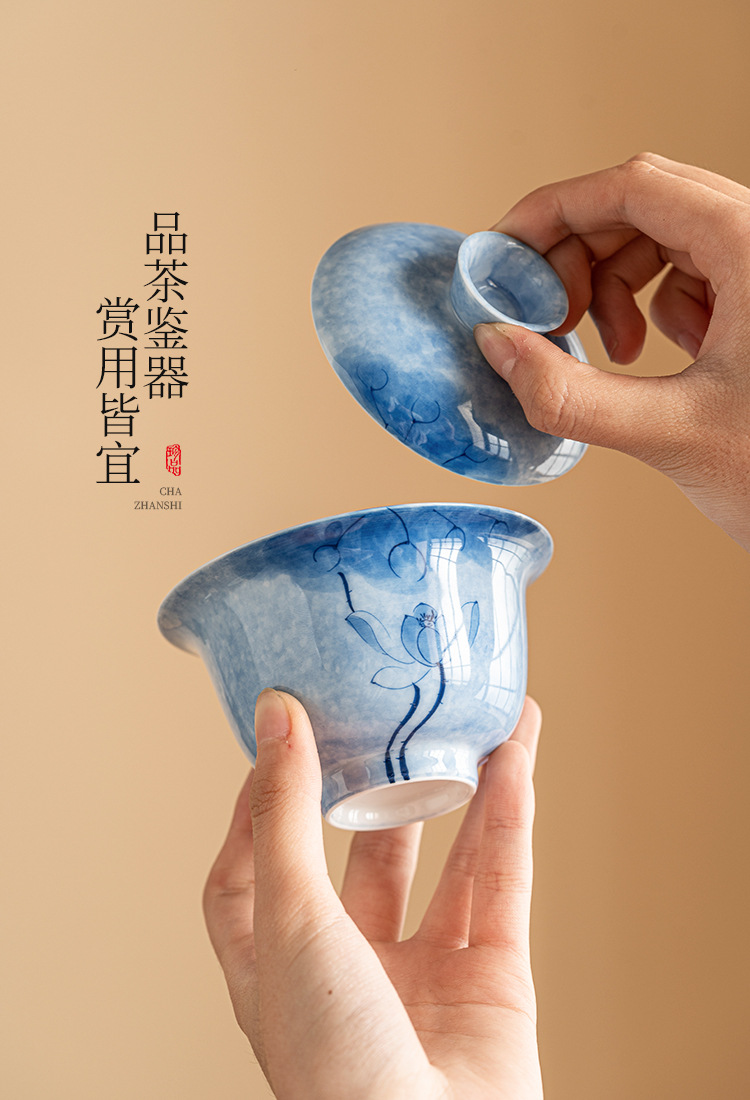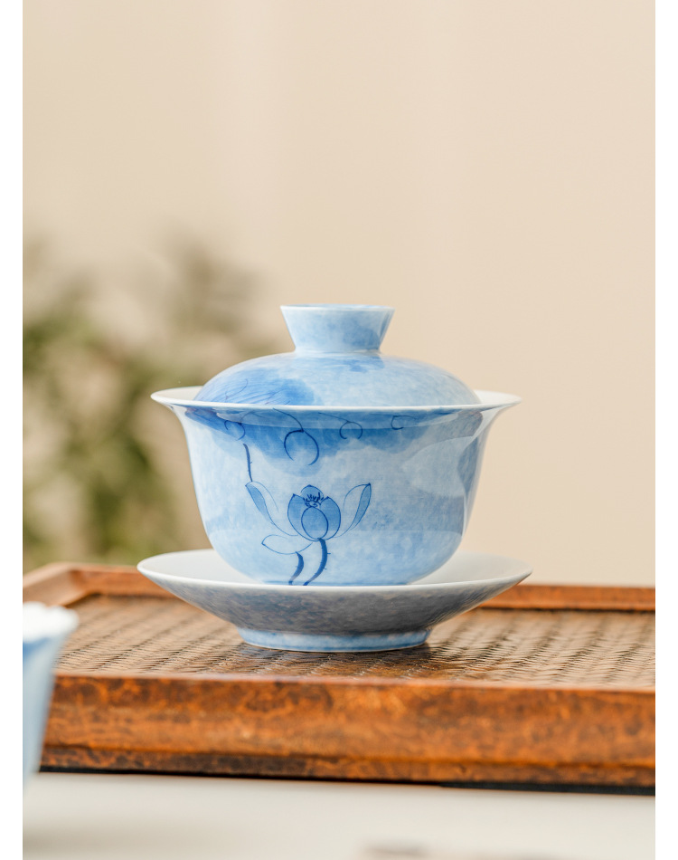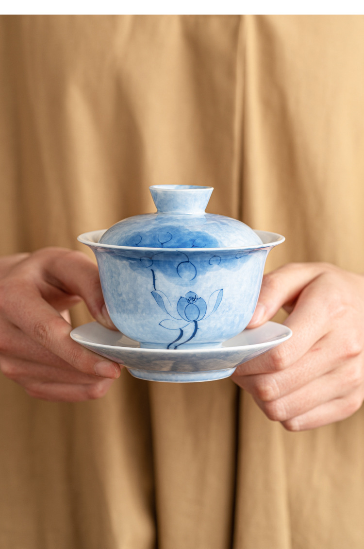 Bát tam tài hoa sen xanh vẽ tay, cốc trà sứ Kung Fu, Bộ trà cao cấp đơn chống bỏng, bát trà có nắp cỡ lớn