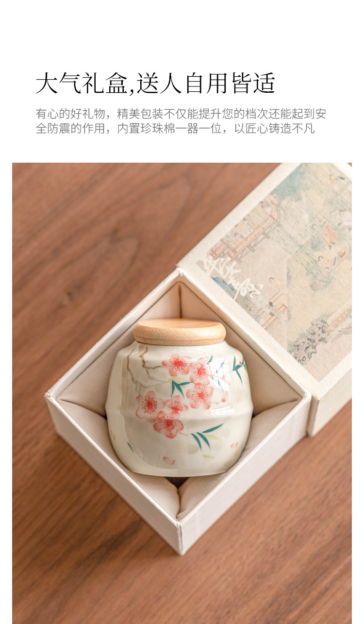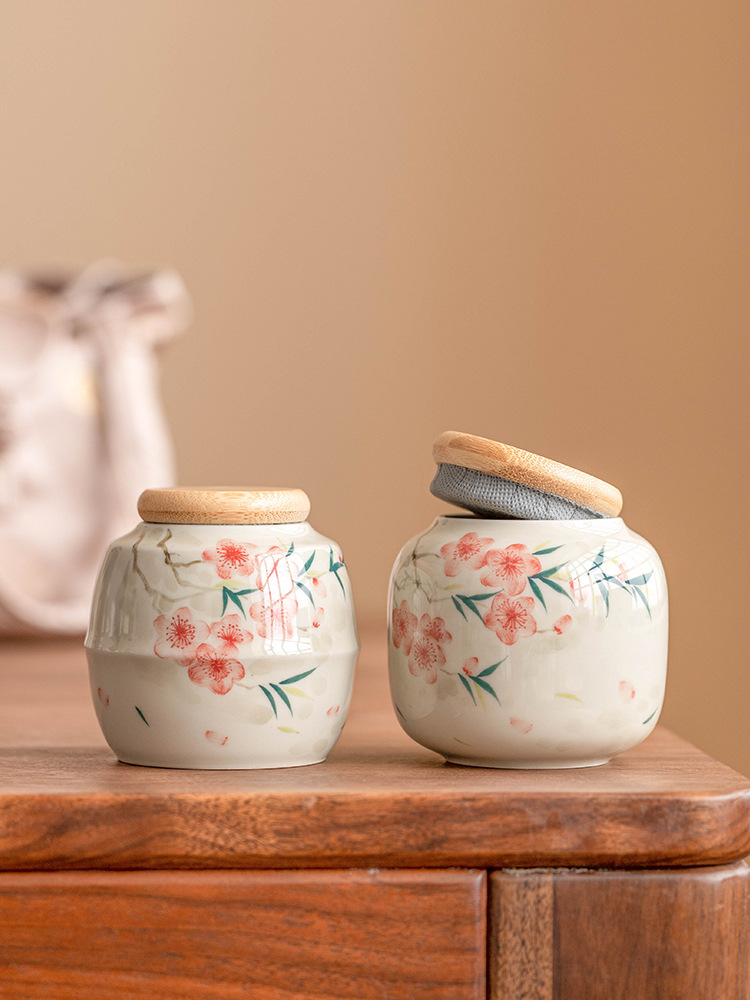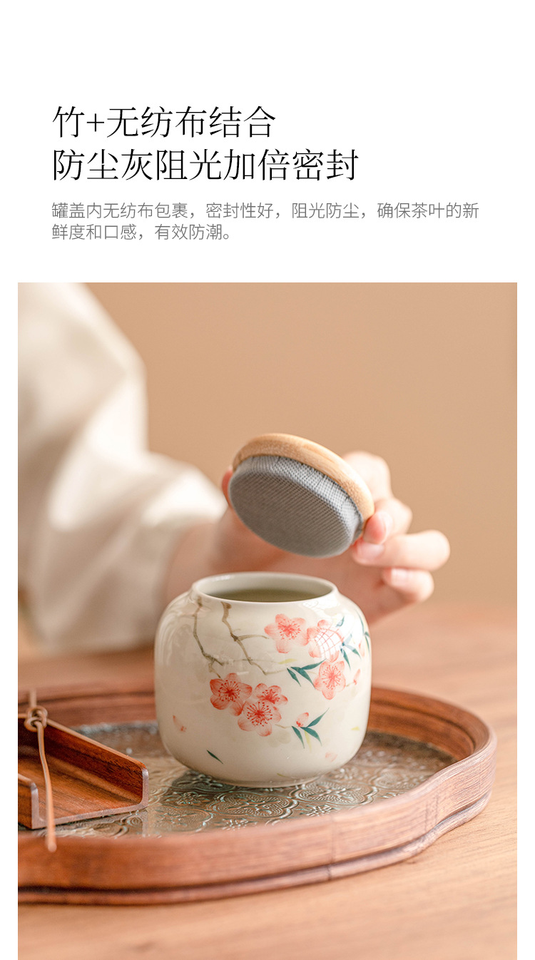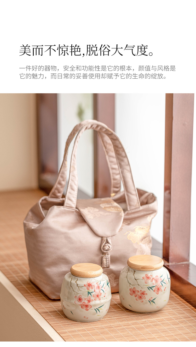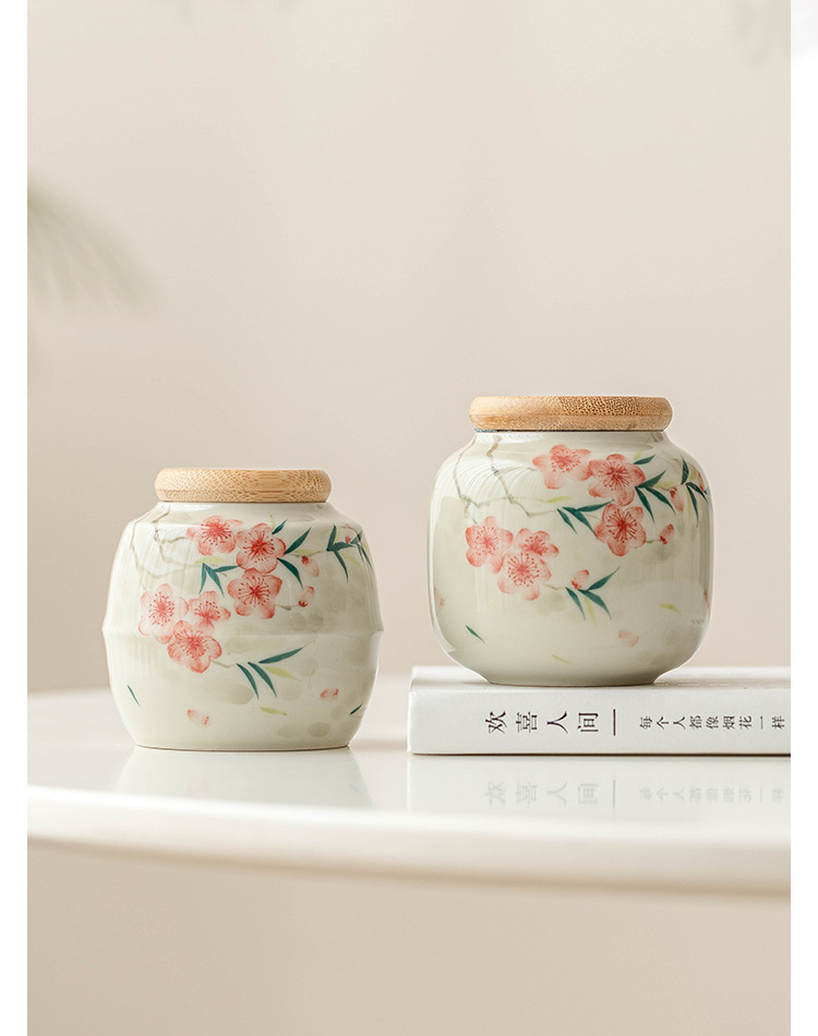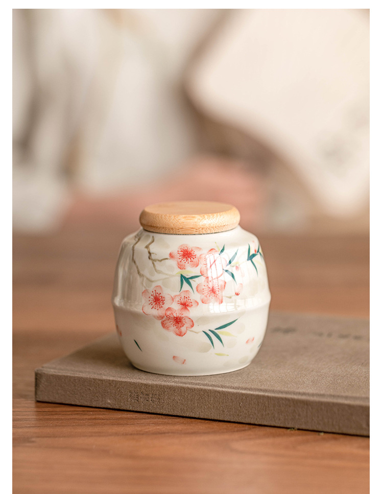 Bể trà ba nhân dân tệ hoa đào vẽ tay, bể kín, bể chứa trà cầm tay chống ẩm, bể chứa, bộ trà đơn gốm sứ