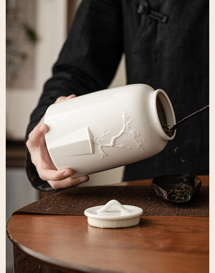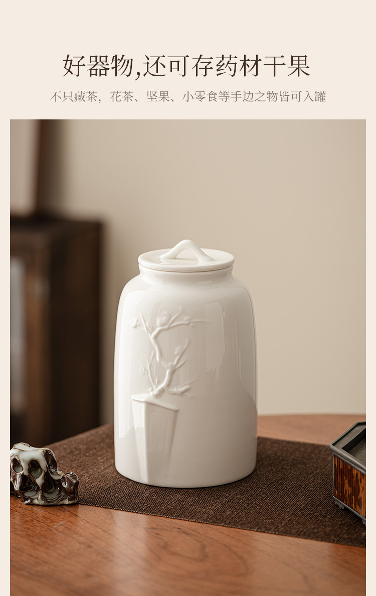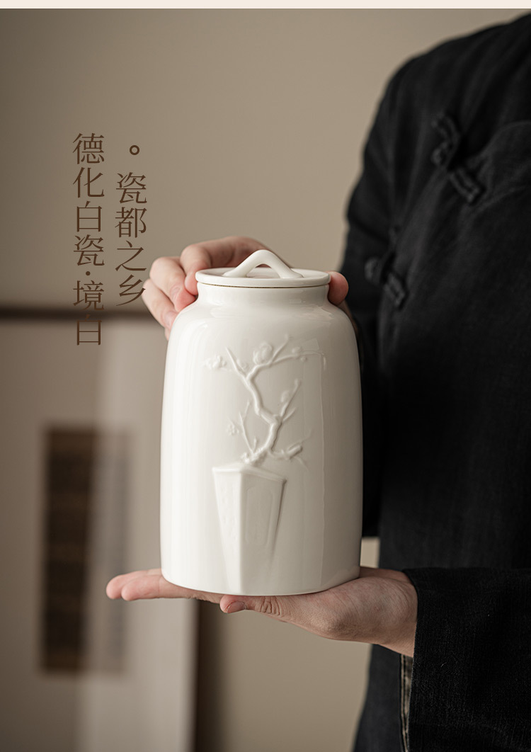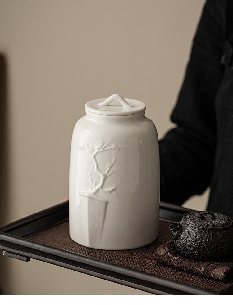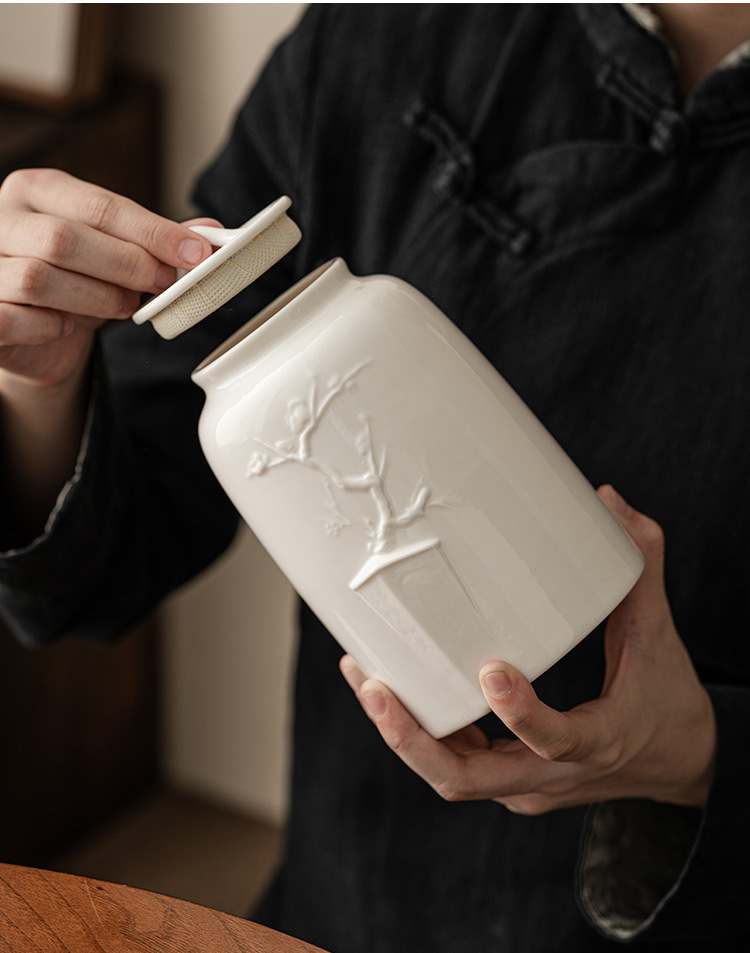 Bình trà hoa mận sứ trắng Dehua, bình kín, Bình Đựng Trà chống ẩm gia dụng, bình trà gốm sứ cao cấp cỡ lớn, bình rỗng