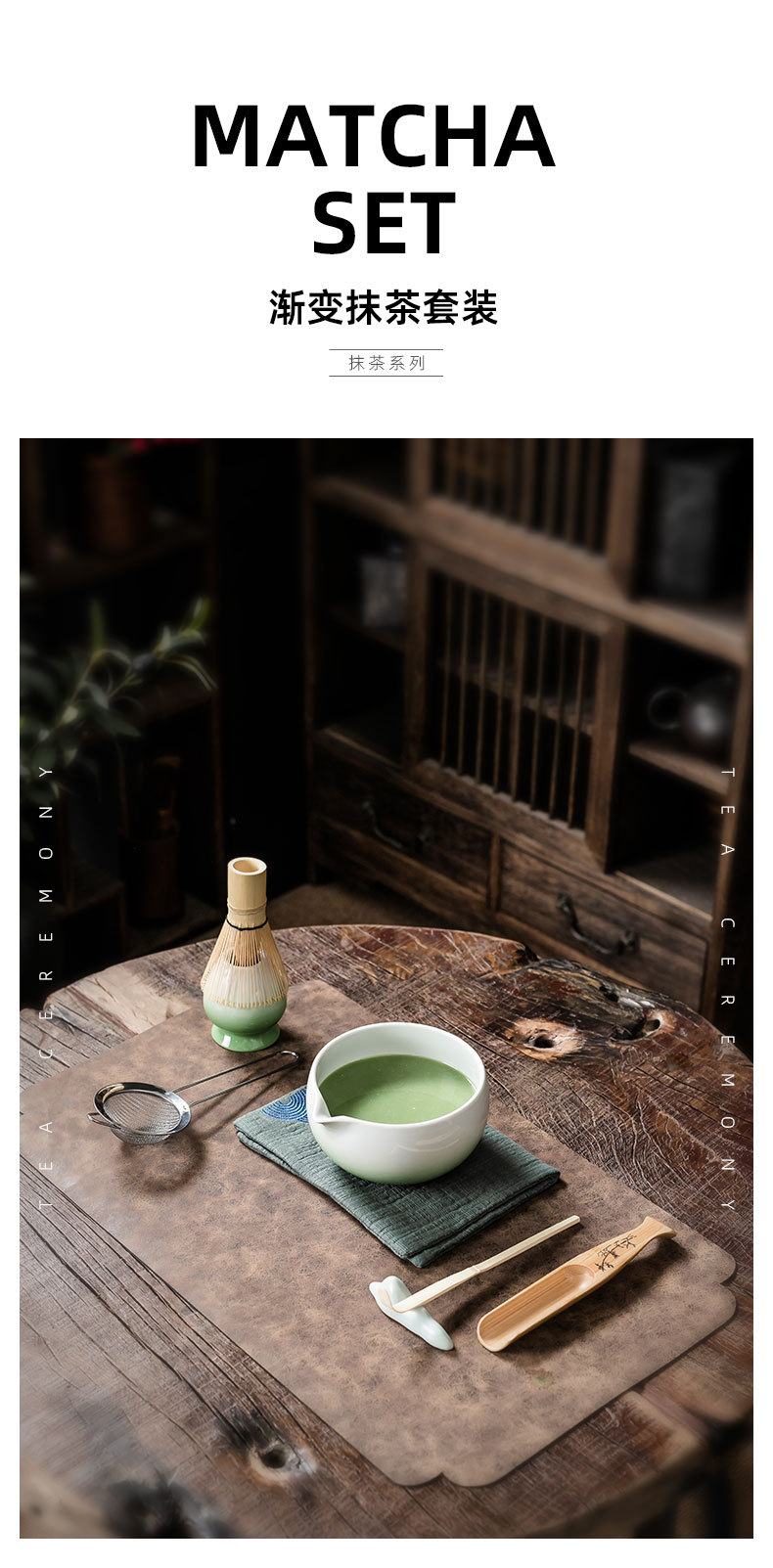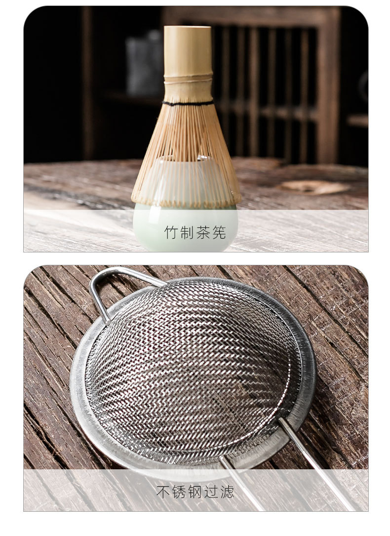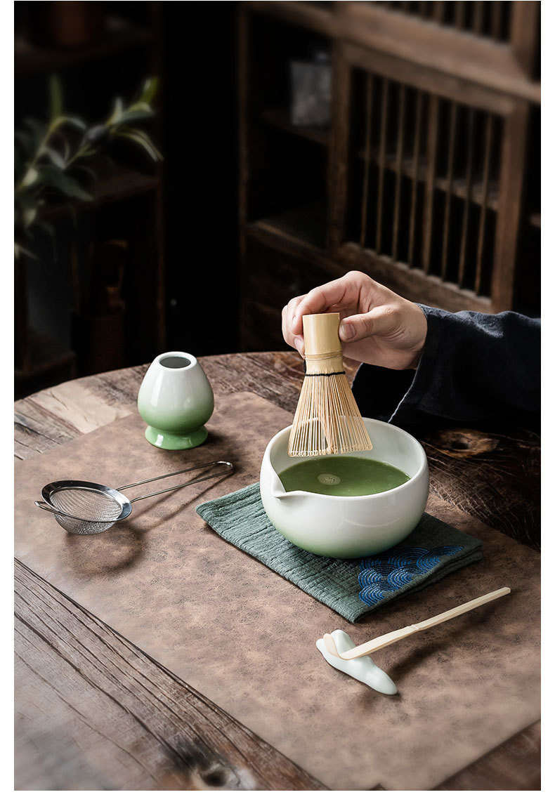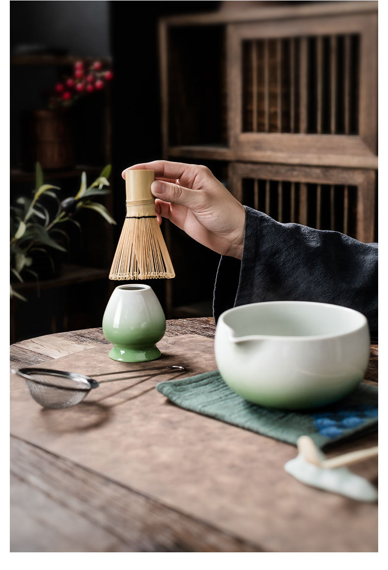 - Bộ 8 món matcha bán buôn, chén trà gốm sứ màu chuyển sắc, bộ dụng cụ pha trà thời nhà Tống, gồm chổi đánh trà, rây lọc, bàn chải trà