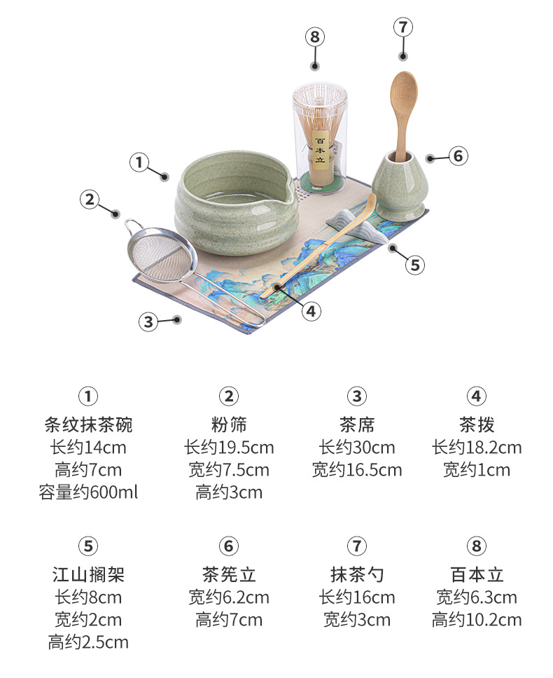 Bộ 8 món Matcha sọc, bát Matcha kiểu Nhật, dụng cụ uống trà Matcha, bát trà gốm sứ, bàn chải trà, bình pha trà