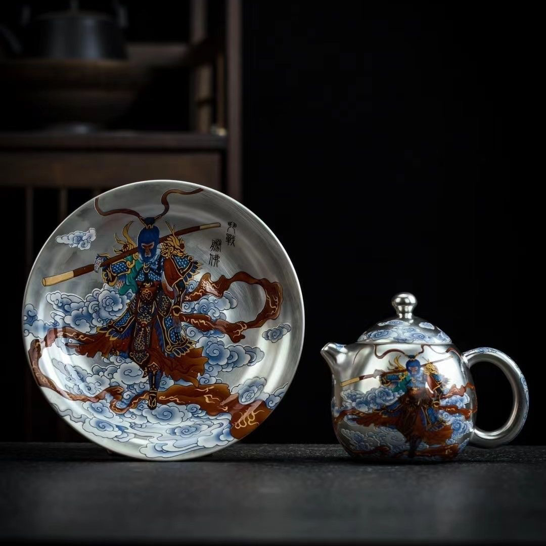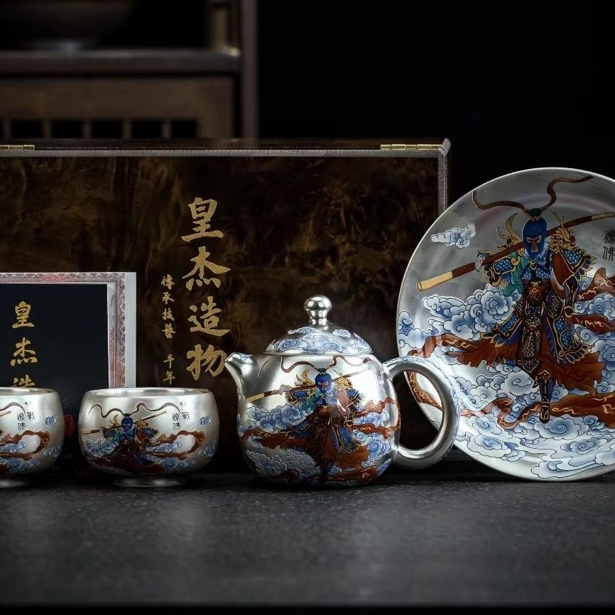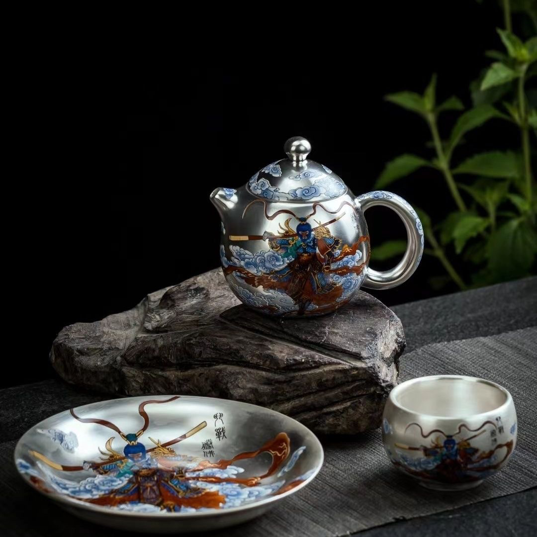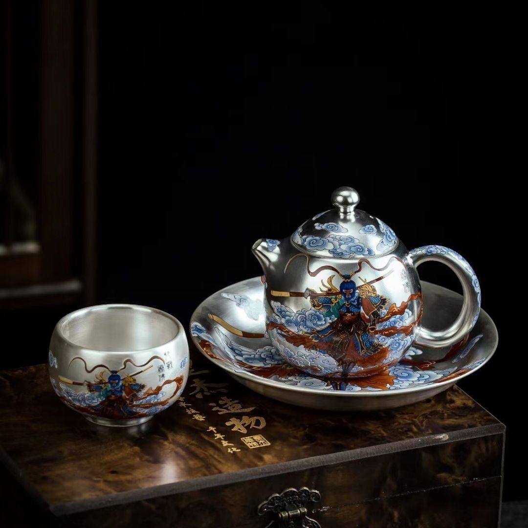 - Bộ ấm chén bạc cao cấp Trung Quốc phong cách Kung Fu, gồm 1 ấm và 2 chén, mạ vàng, thương hiệu Chu Hồng Kiệt.