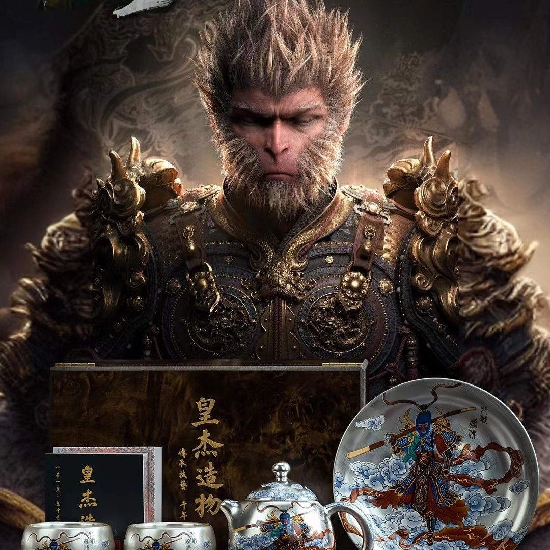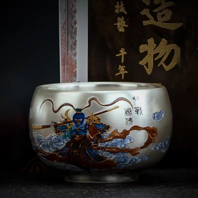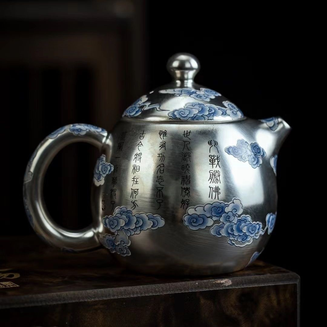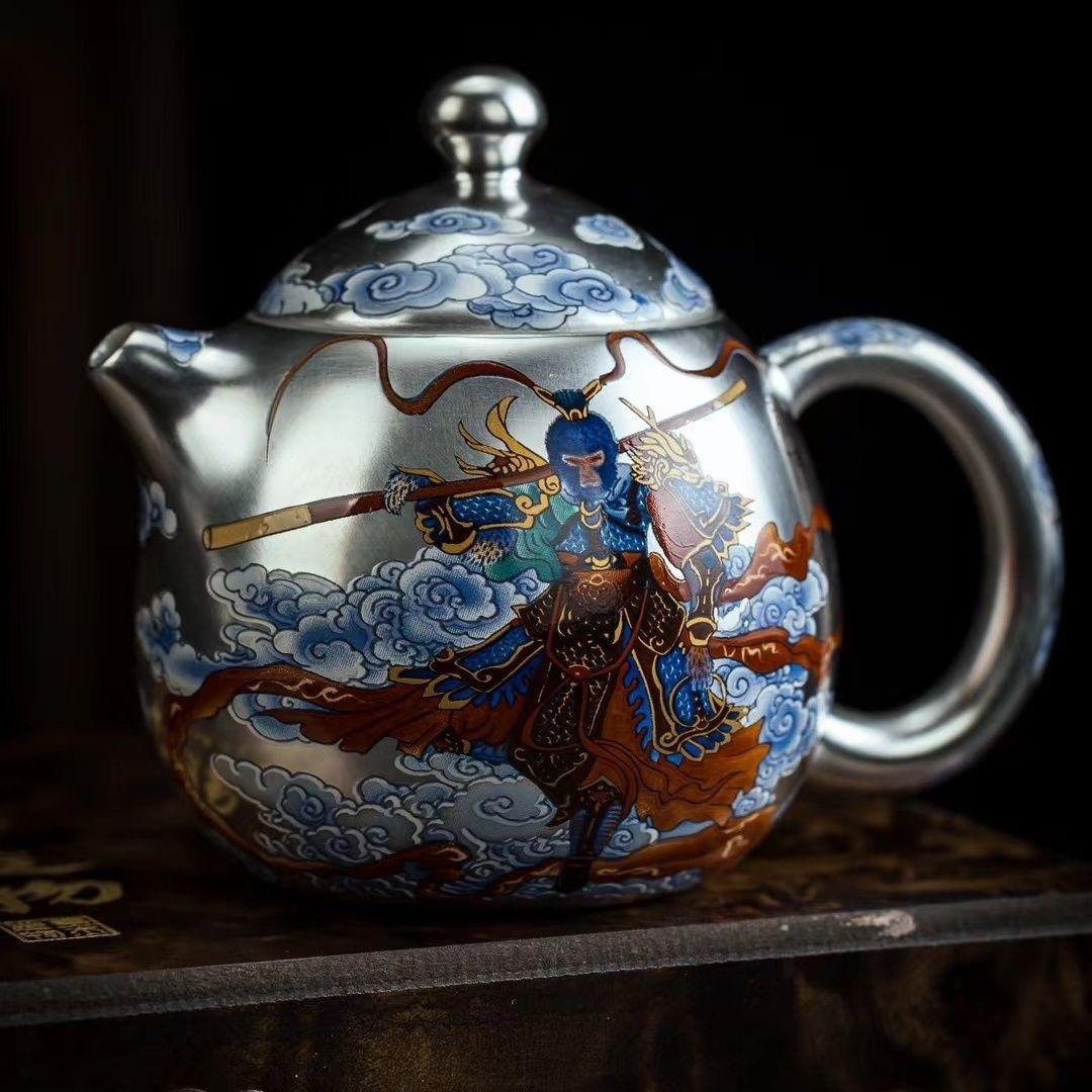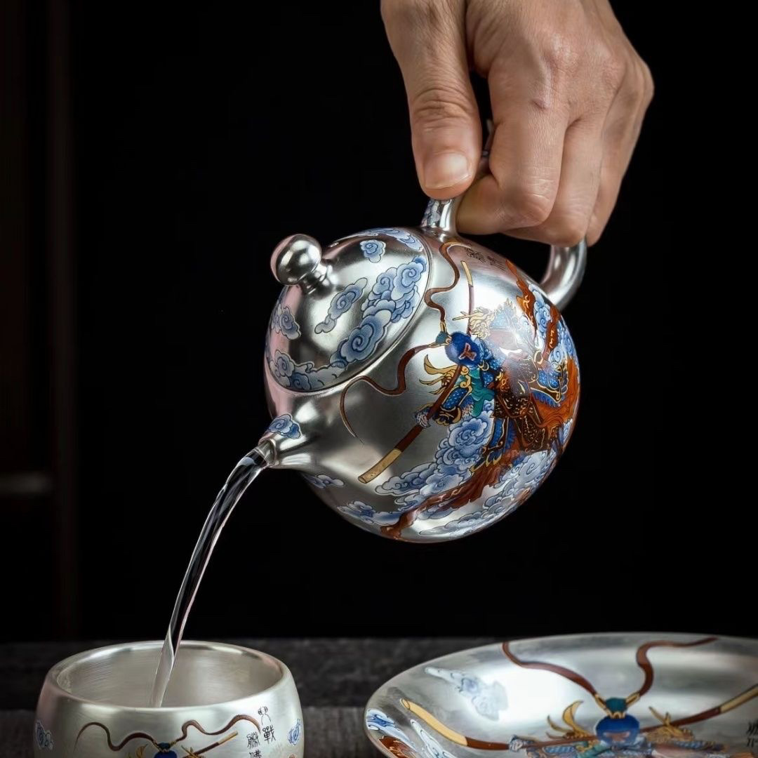 - Bộ ấm chén bạc cao cấp Trung Quốc phong cách Kung Fu, gồm 1 ấm và 2 chén, mạ vàng, thương hiệu Chu Hồng Kiệt.