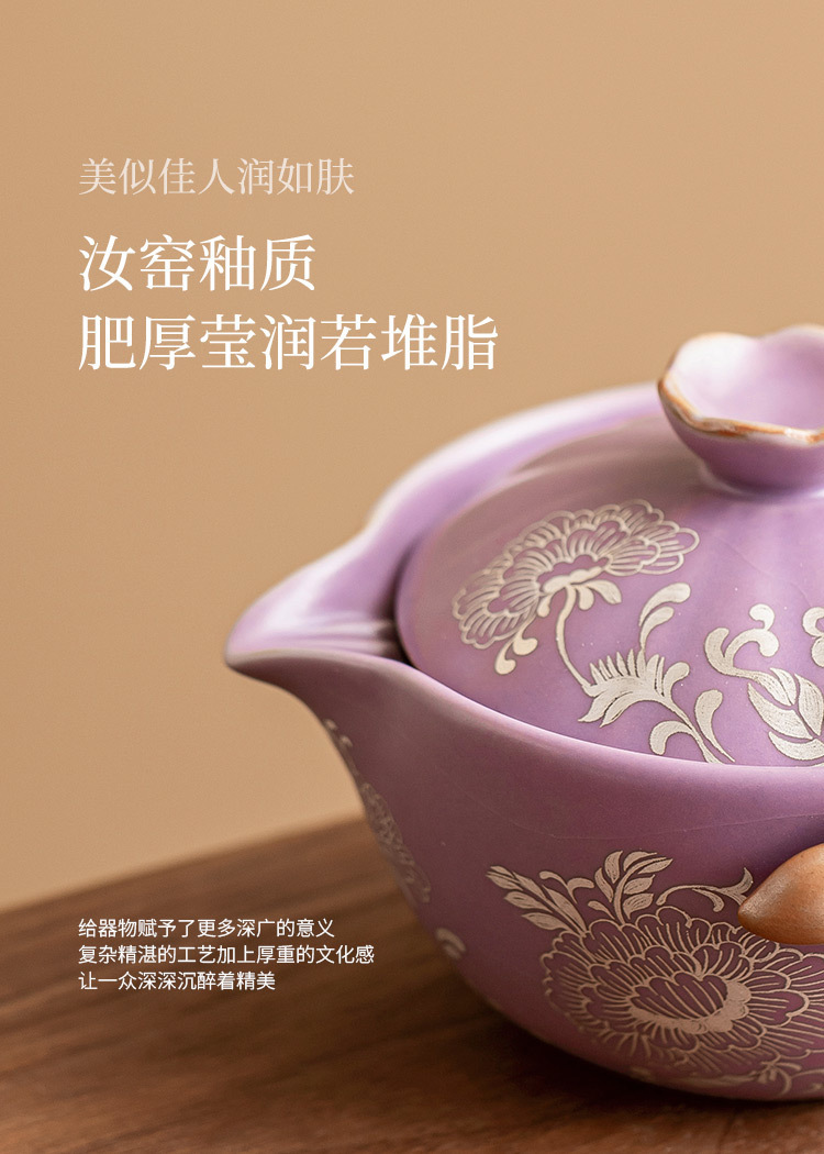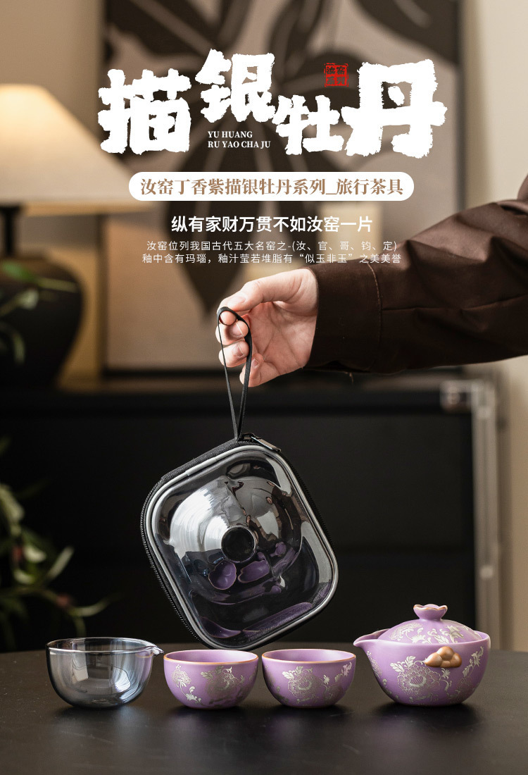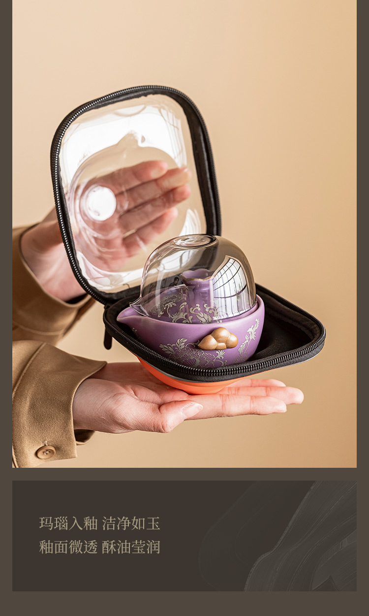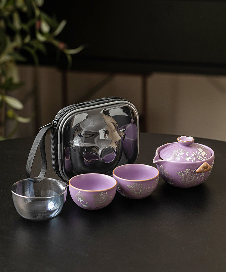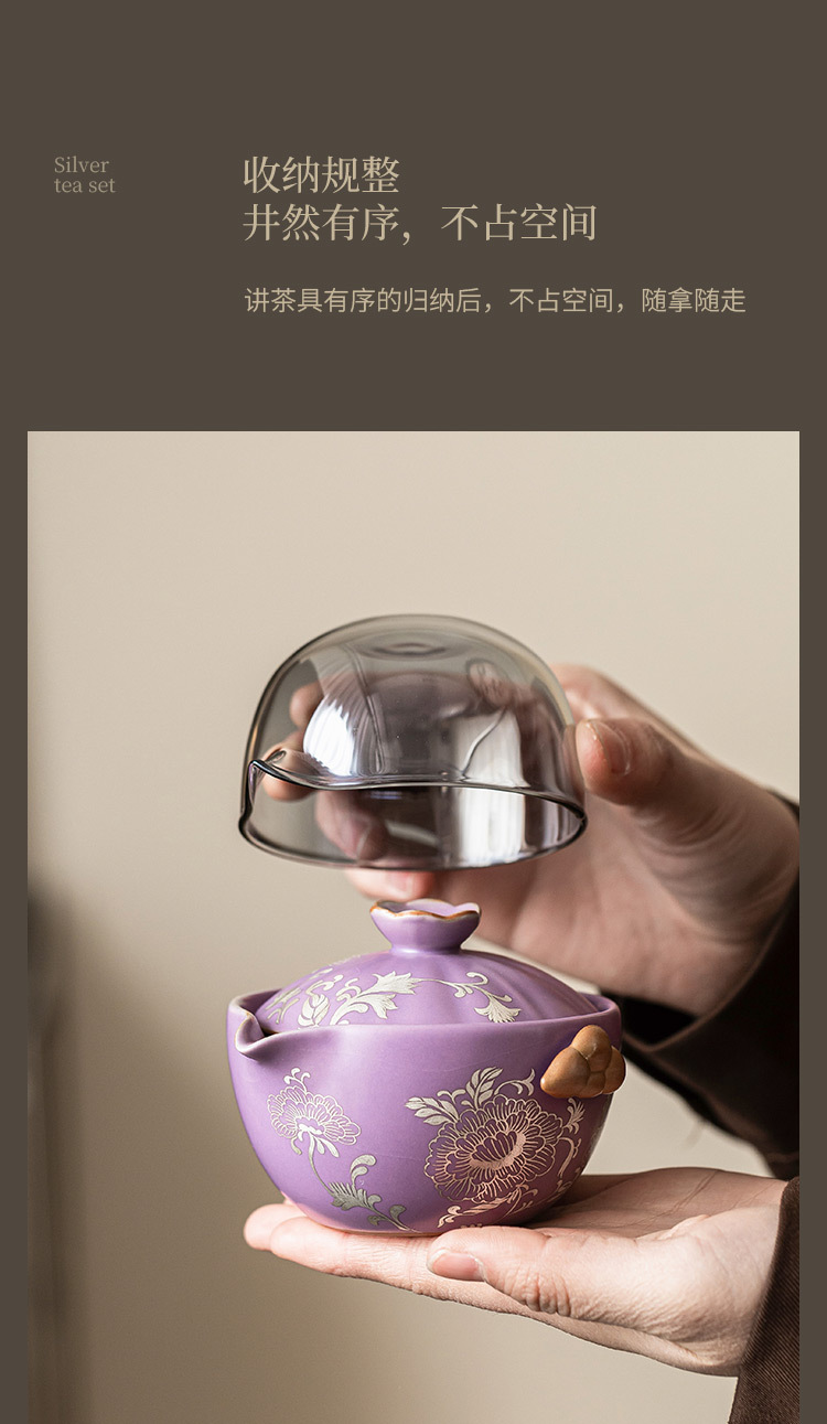 - Bộ ấm chén du lịch hoa mẫu đơn bạc, bộ nhỏ, Kung Fu, di động, cốc nhanh, ấm trà cao cấp, một ấm hai chén