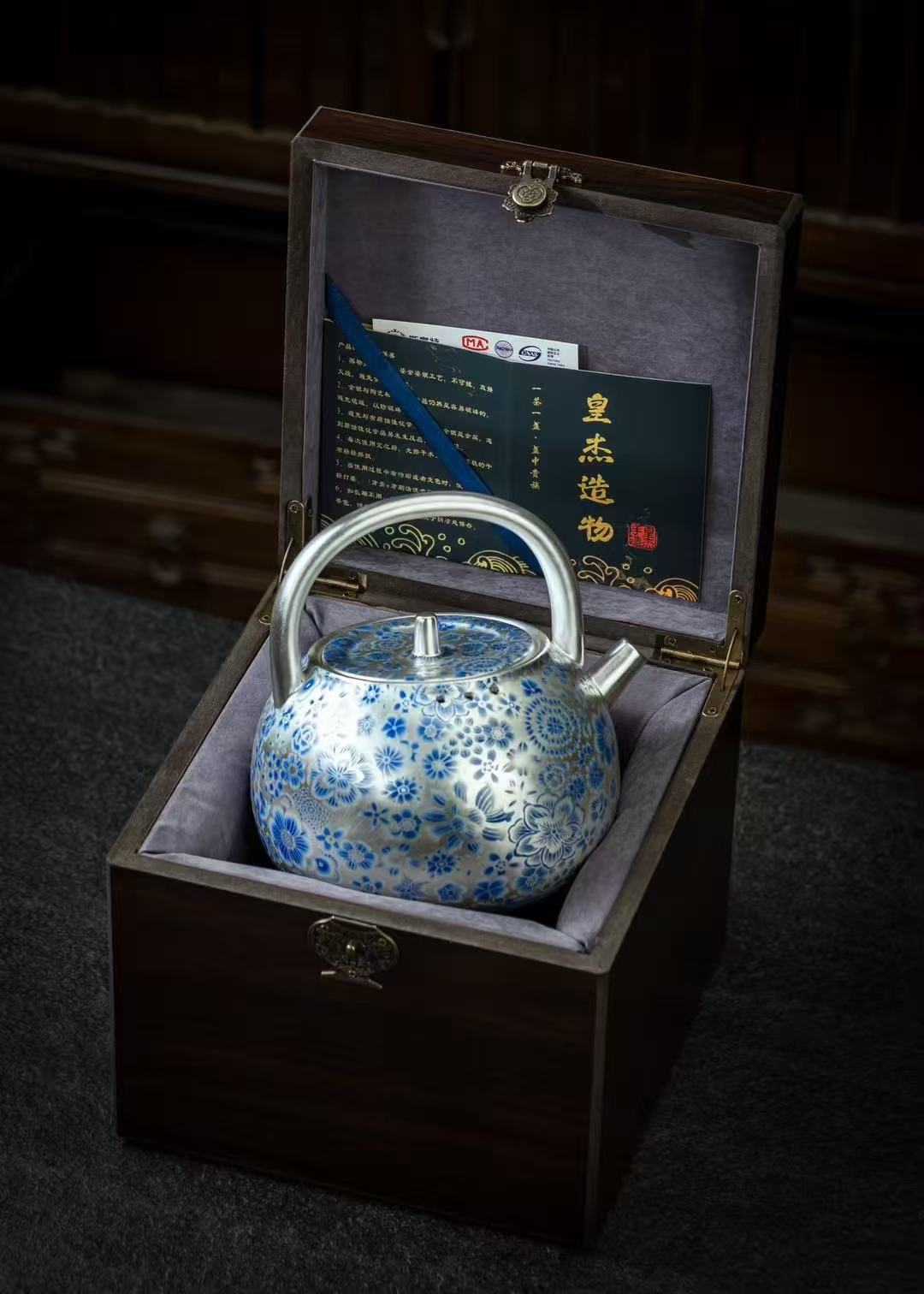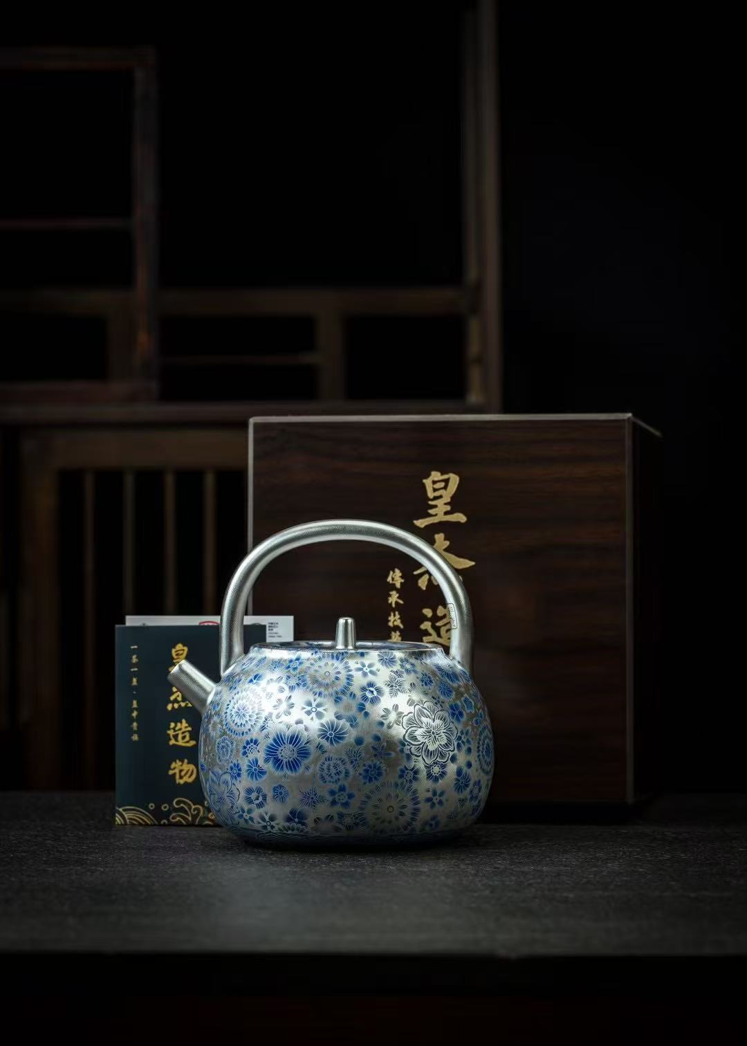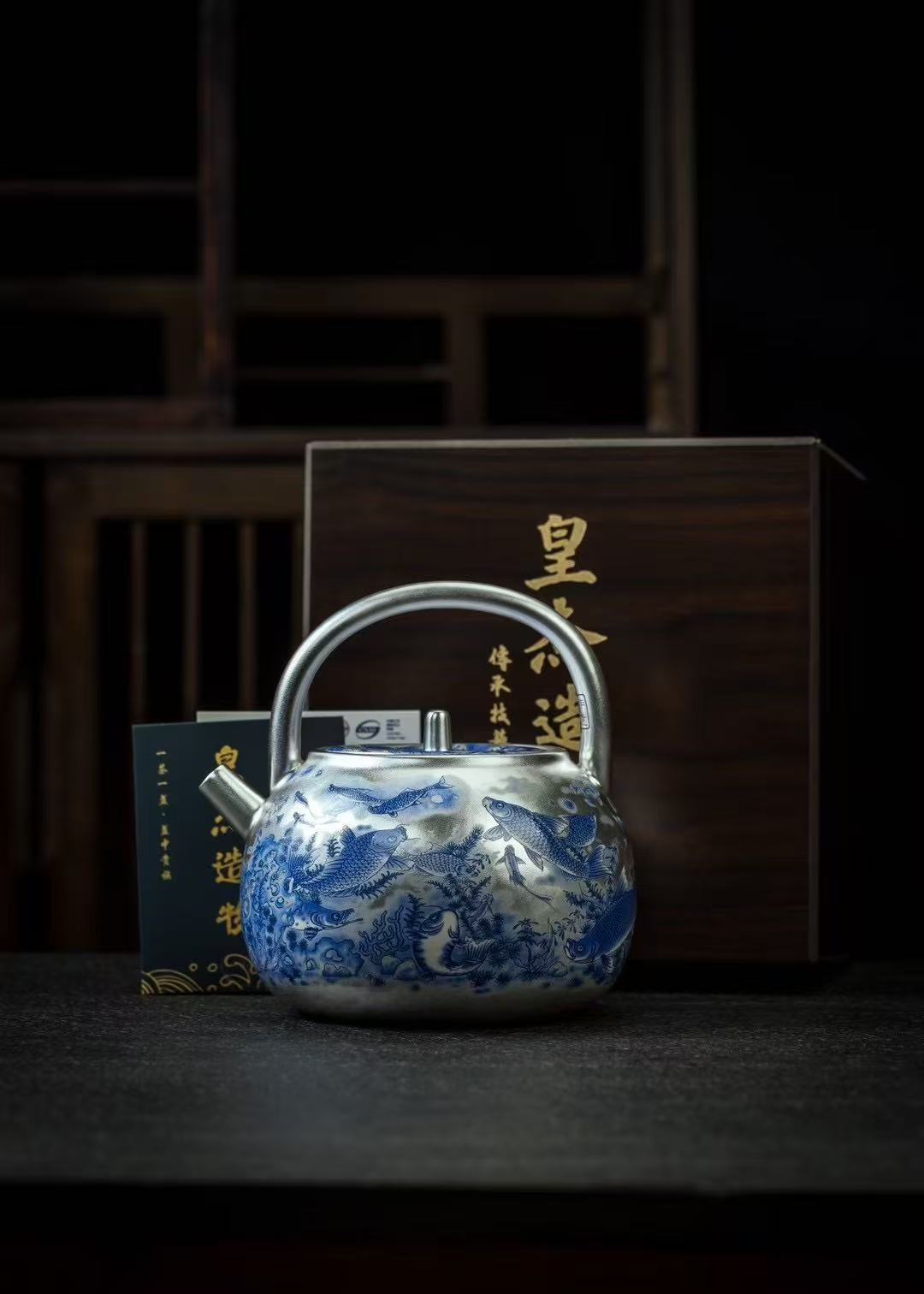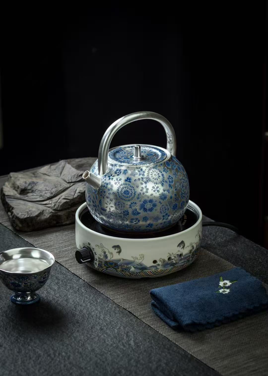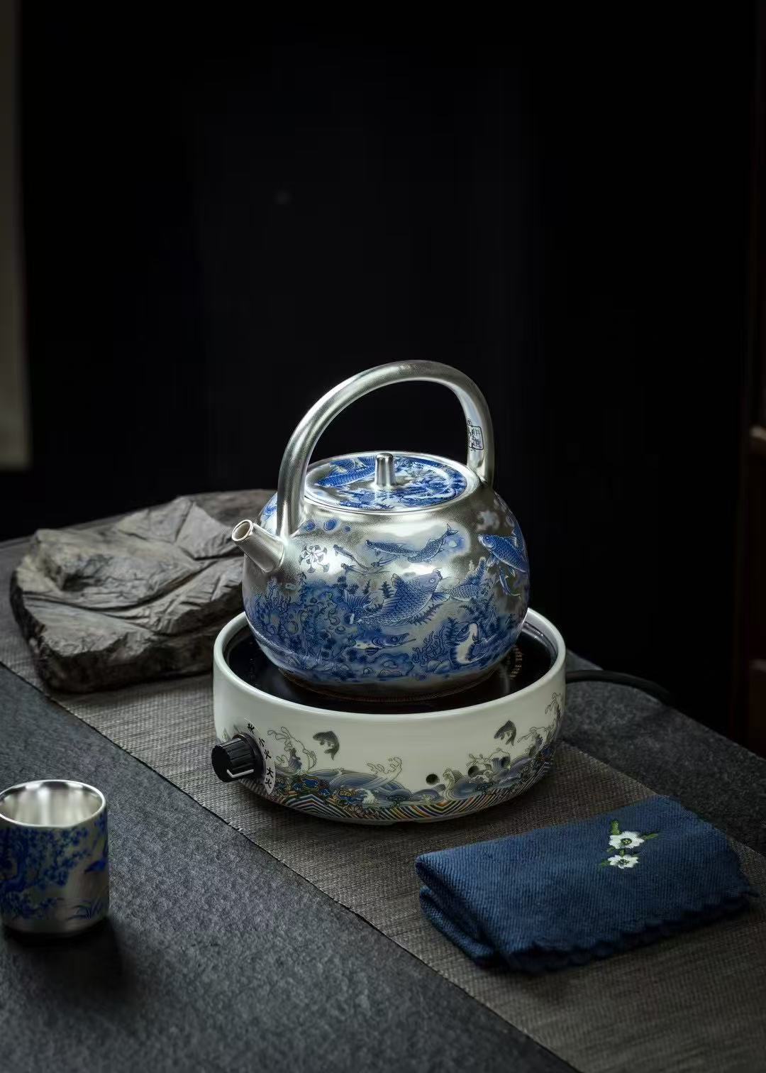 Bộ ấm chén sứ cao cấp mạ bạc, họa tiết sen xanh trắng, kèm bếp điện gốm, quà tặng dành cho người lớn tuổi.