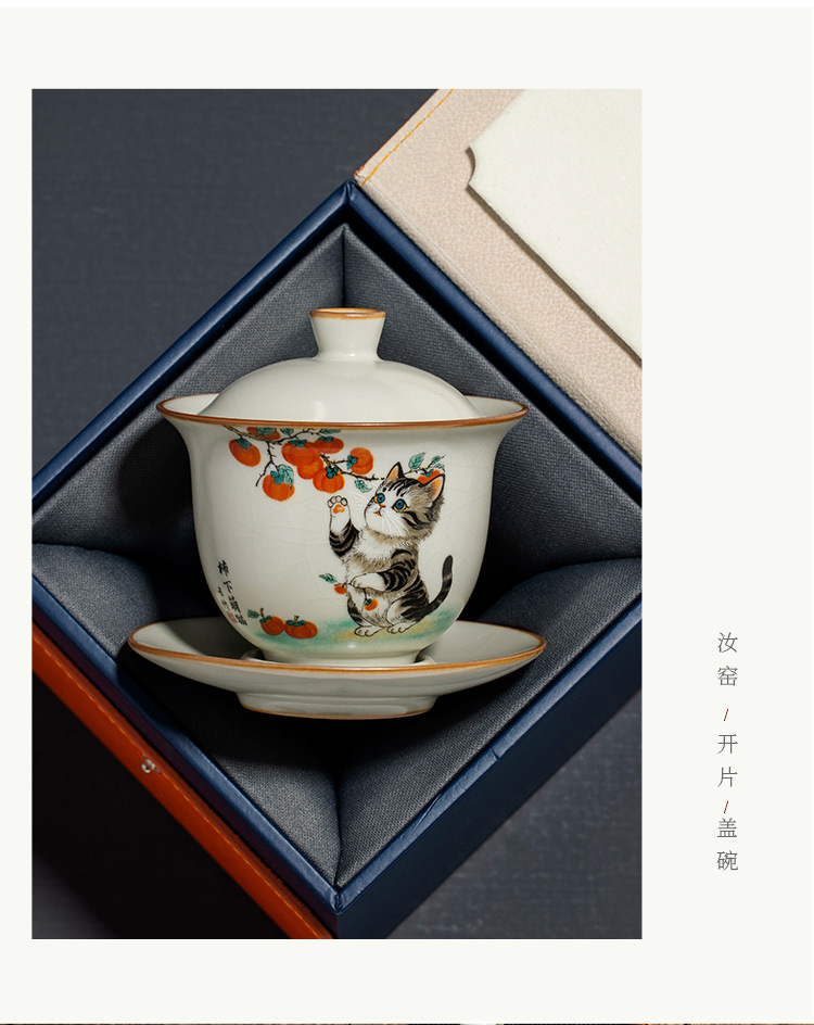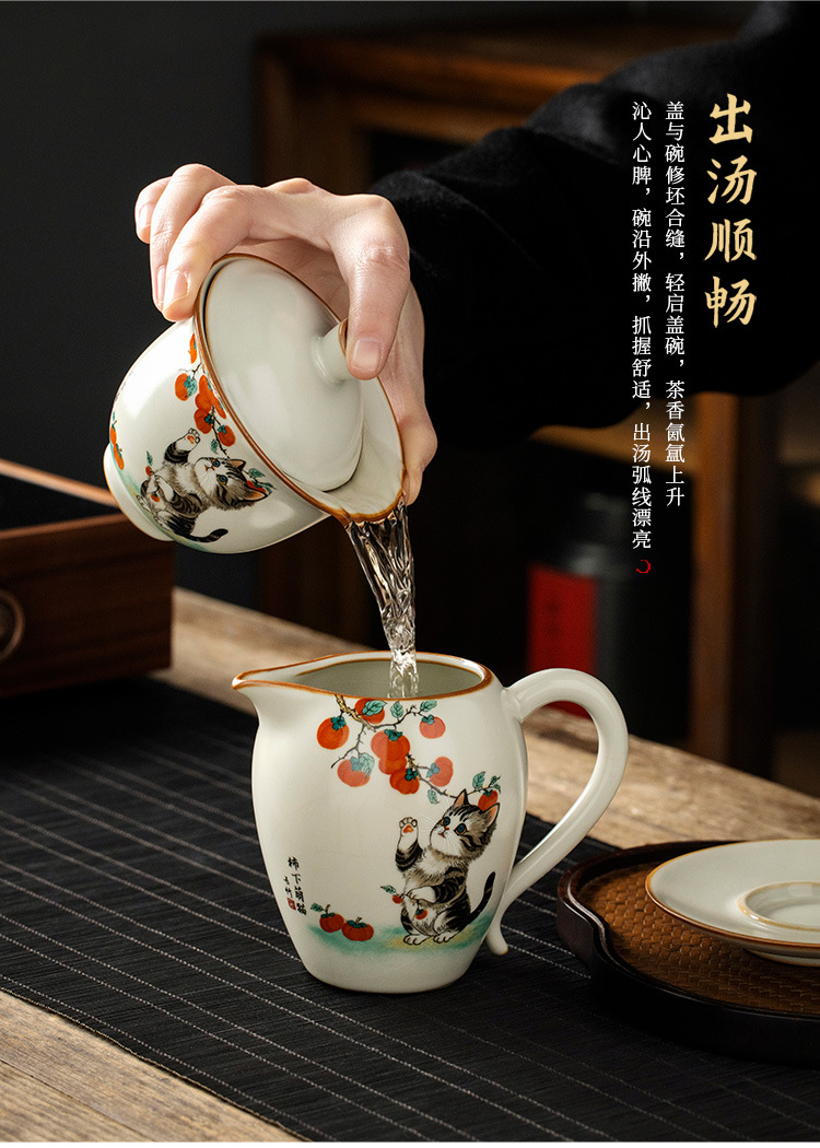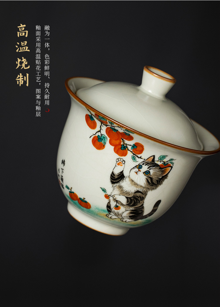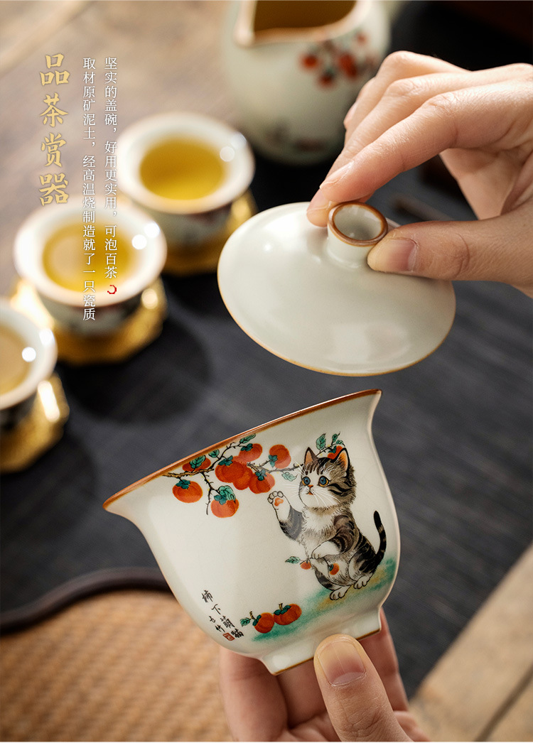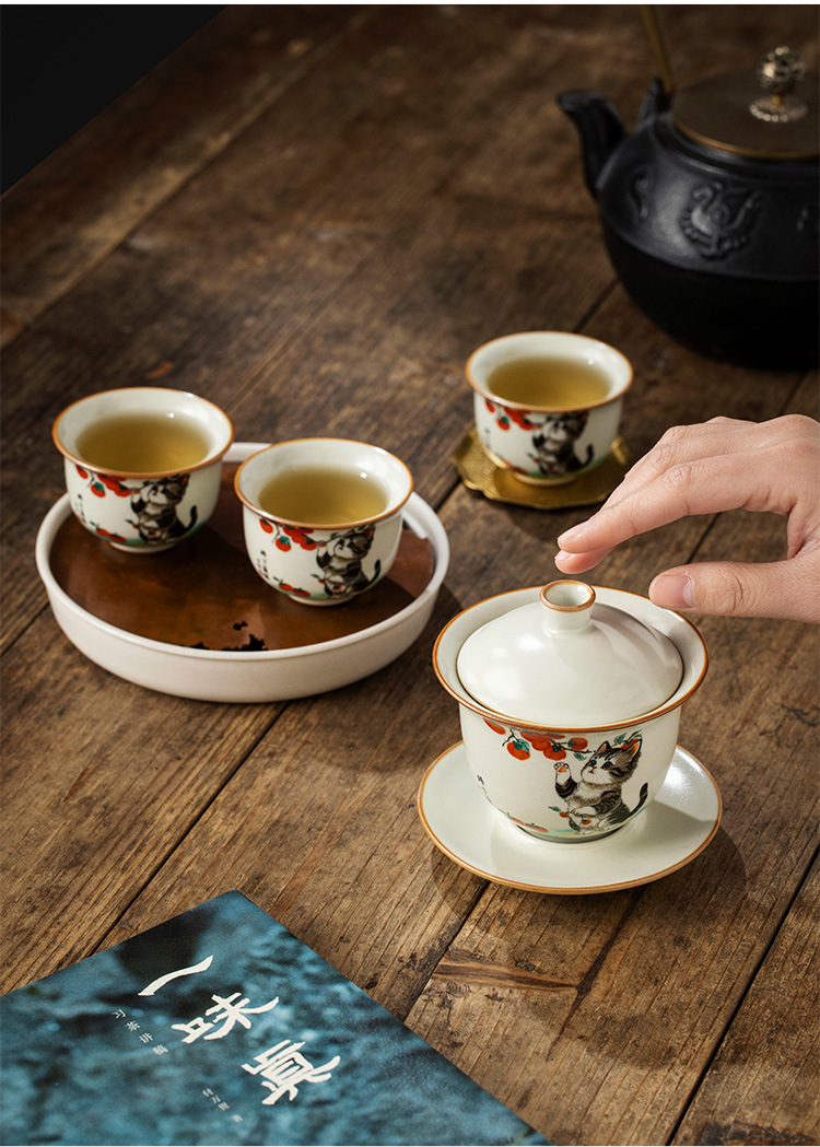 - Bộ ấm chén trà cao cấp chống nóng, có nắp, họa tiết mèo dễ thương ba tài, kiểu dáng Ru Kiln Persimmon.