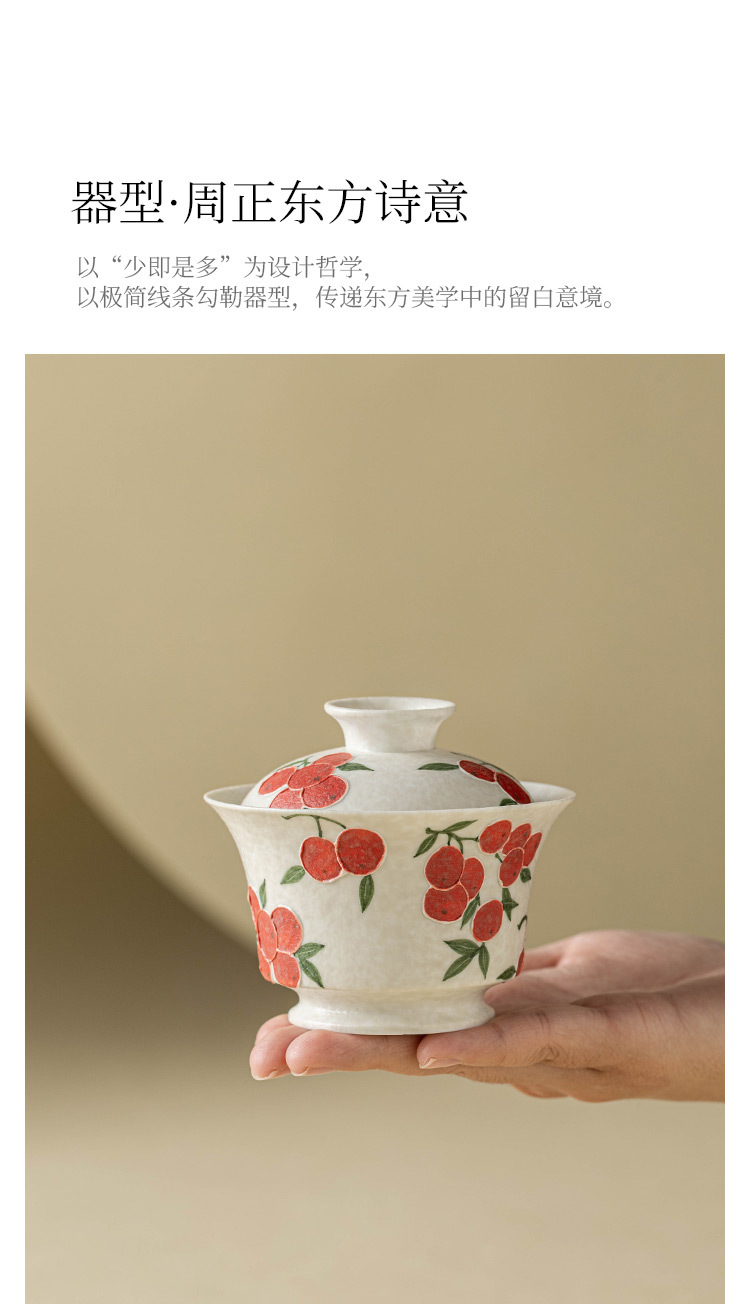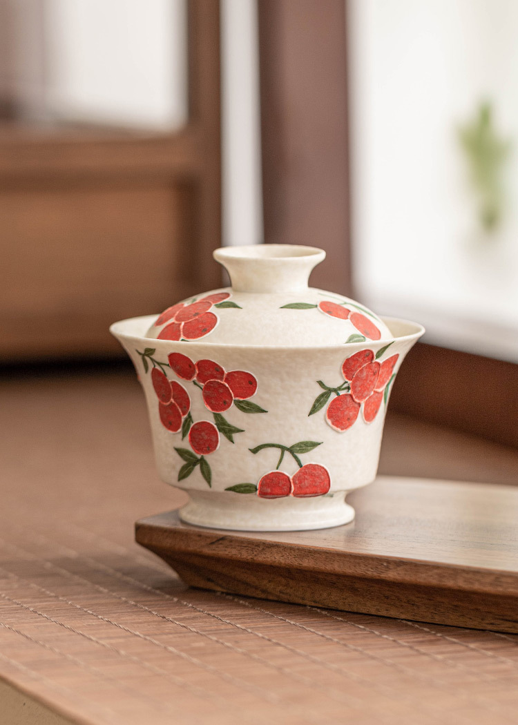 Bộ ấm chén trà gốm sứ Kung Fu màu trắng đá khoáng, họa tiết anh đào chạm khắc thủ công, chén trà gaiwan, một chiếc