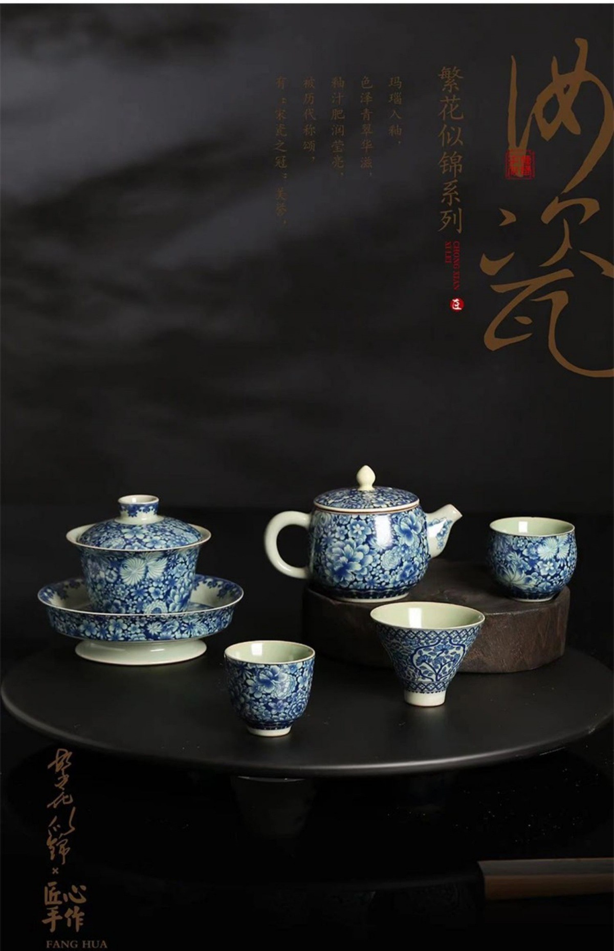 Bộ ấm chén trà Kung Fu cao cấp Jinglongtang Ru Kiln màu xanh trắng Sancai, chén phủ men, dùng trong nhà
