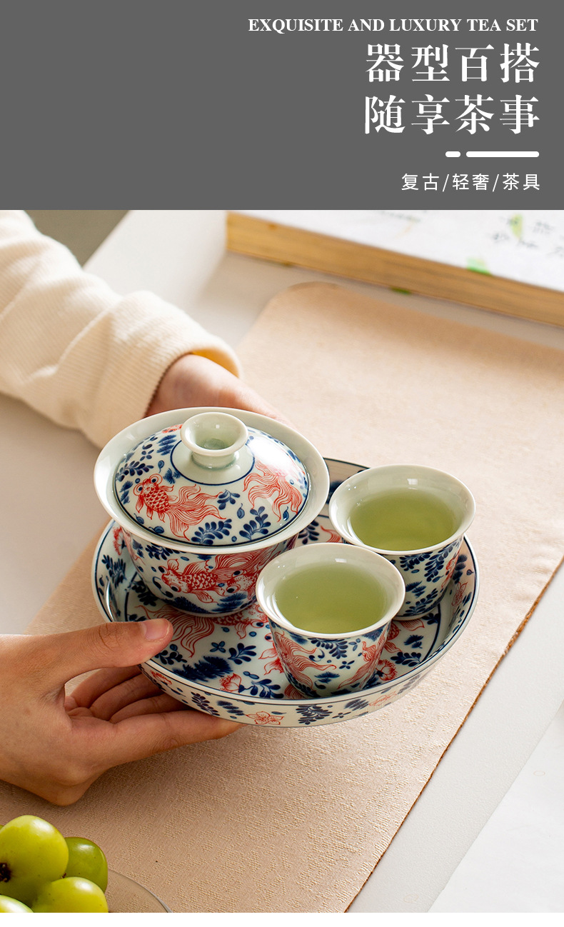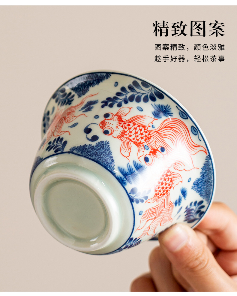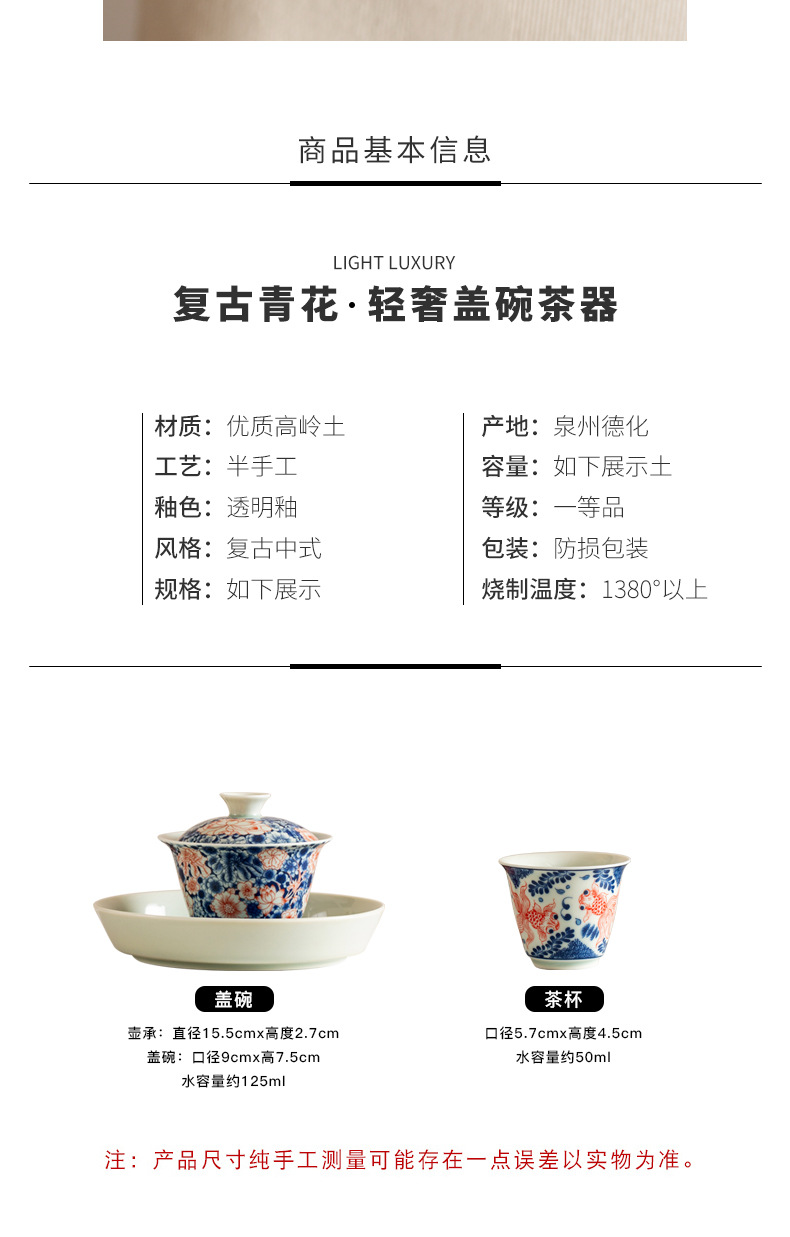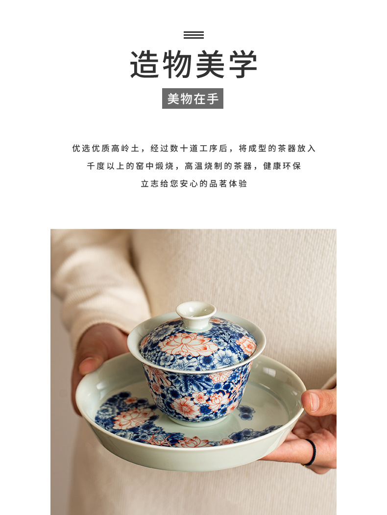 单个陶瓷三才盖碗仿古青花功夫茶具带盖大号泡茶碗高档可悬停套装