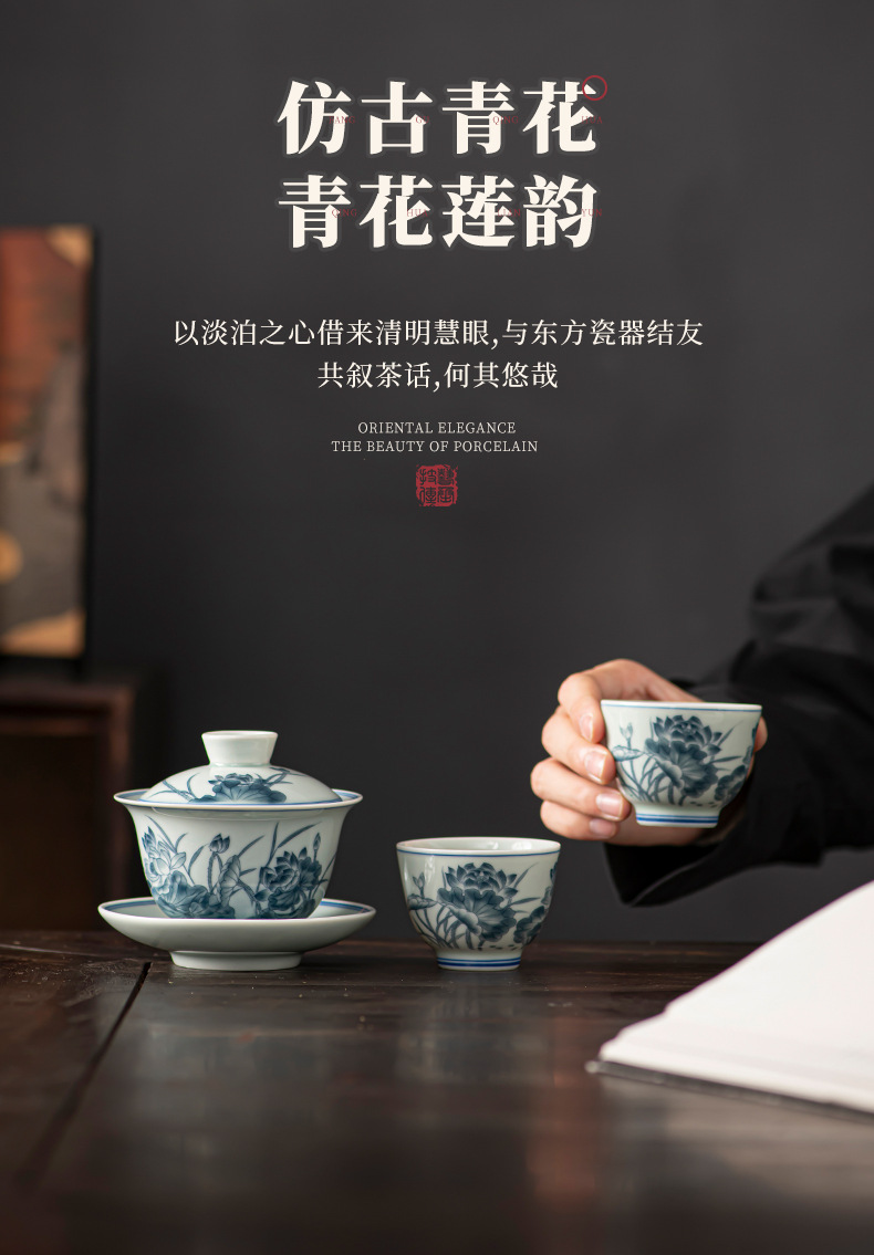 - Bộ ấm chén trà Kung Fu gốm sứ không nóng, một chiếc, có nắp, tô ba tài men xanh trắng, kèm chén trà và tô trà