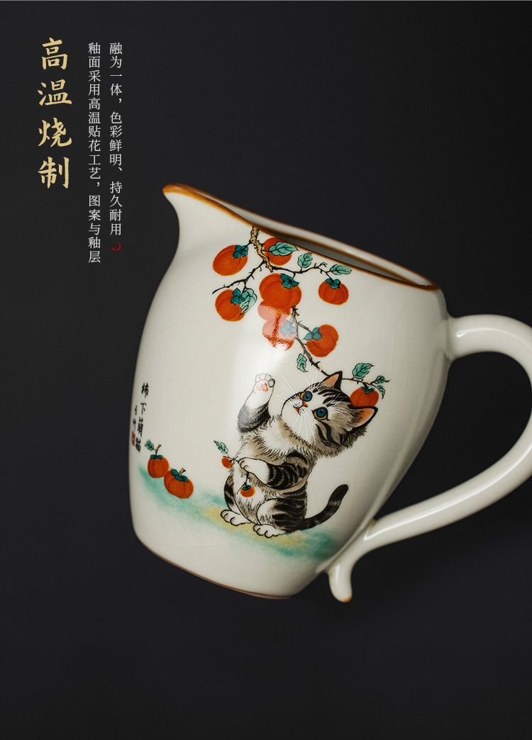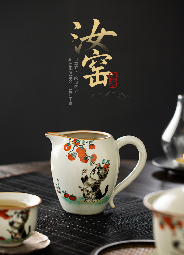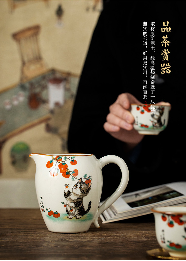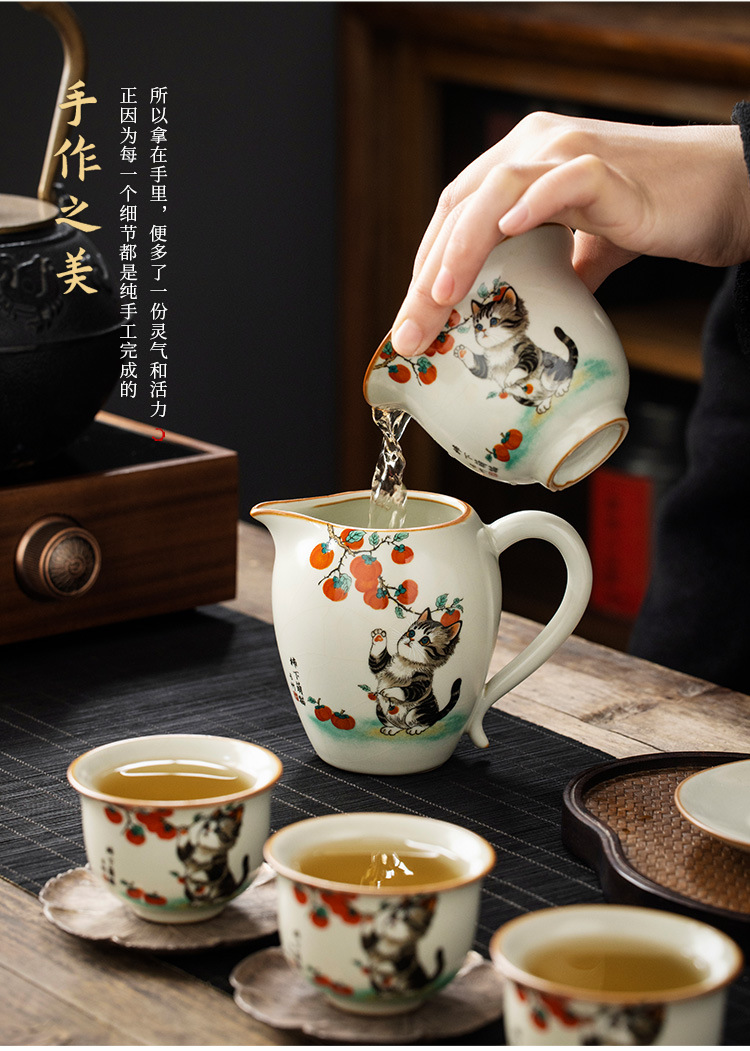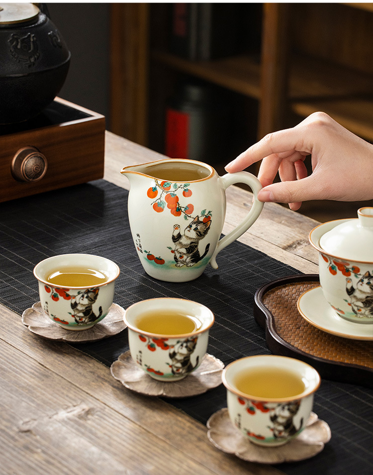 Bộ ấm chén trà Kung Fu gốm sứ màu be Ru Kiln Persimmon mèo dễ thương, chén trà đơn, chia trà.