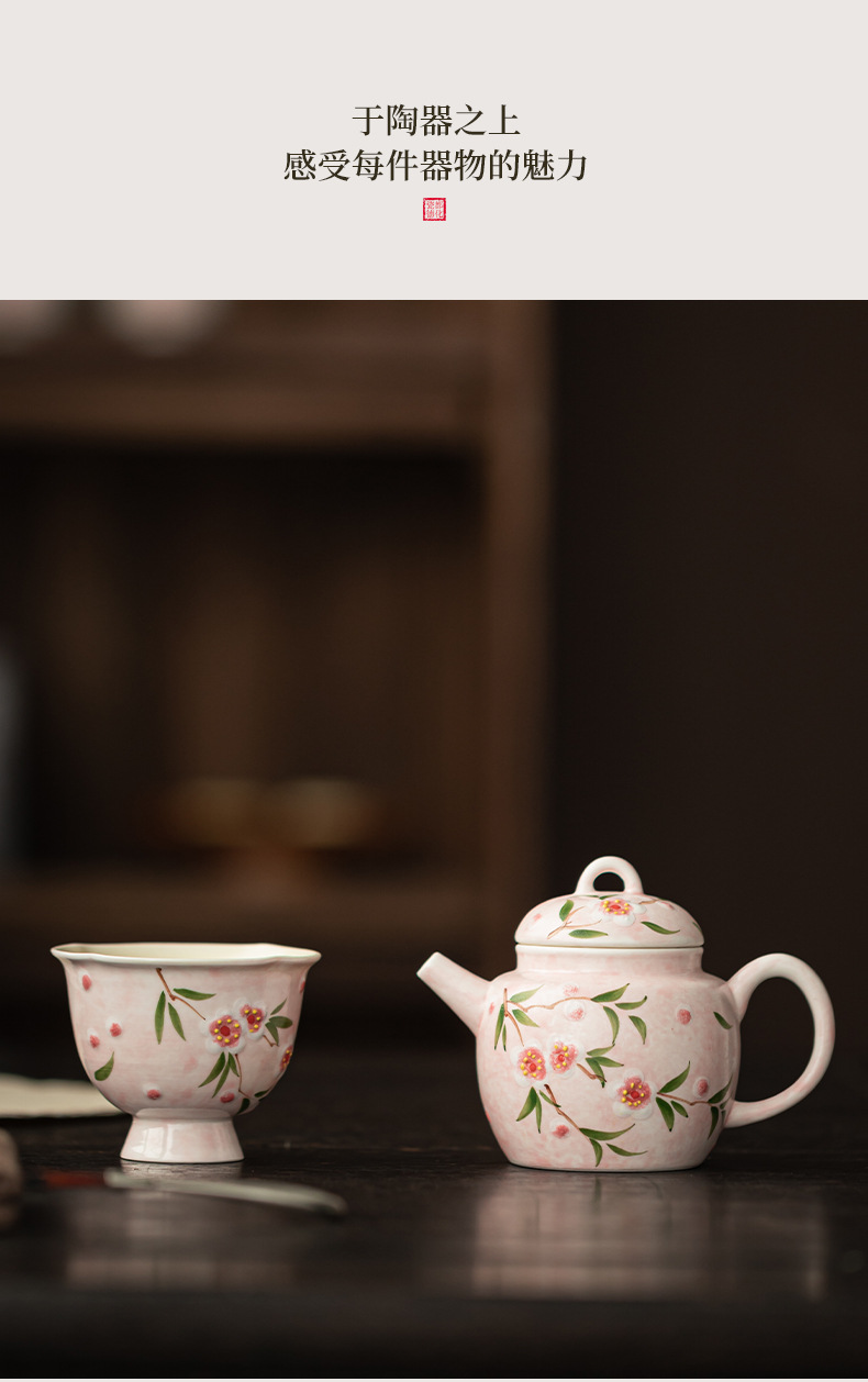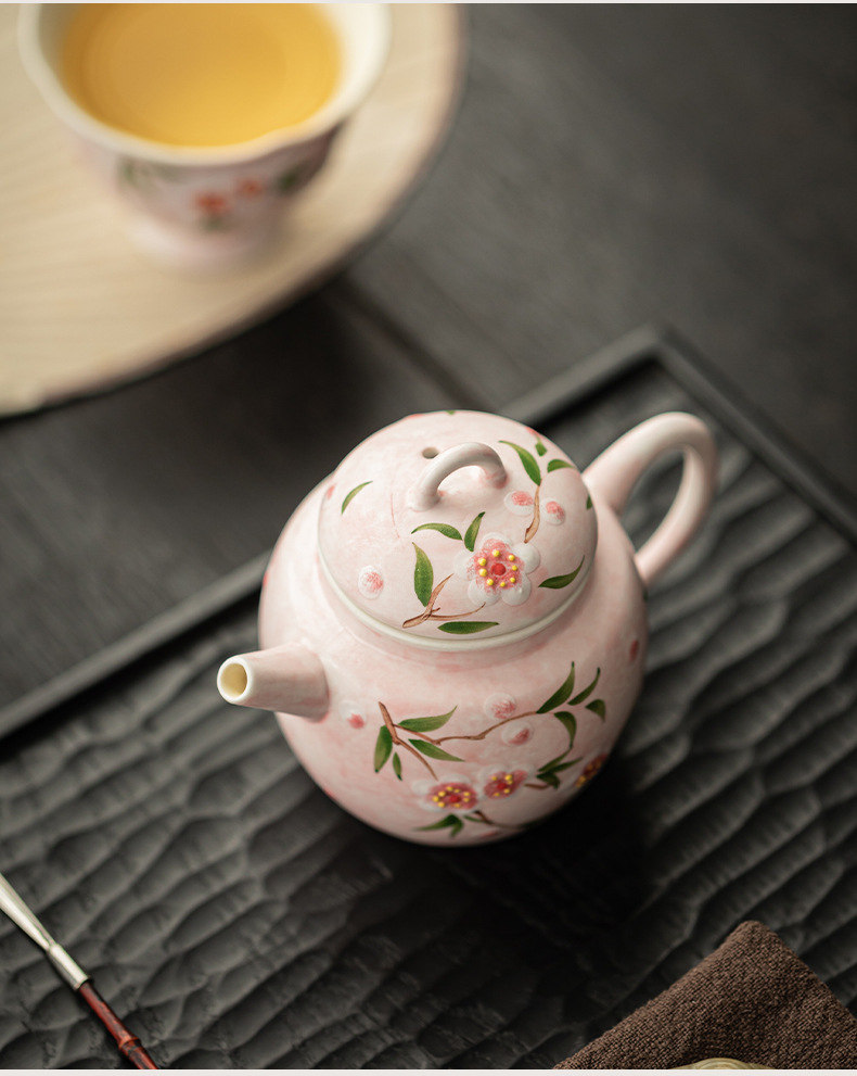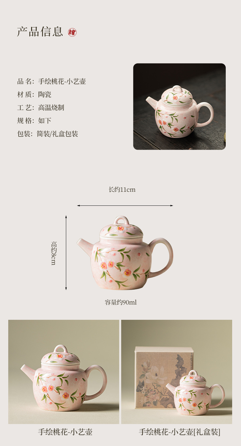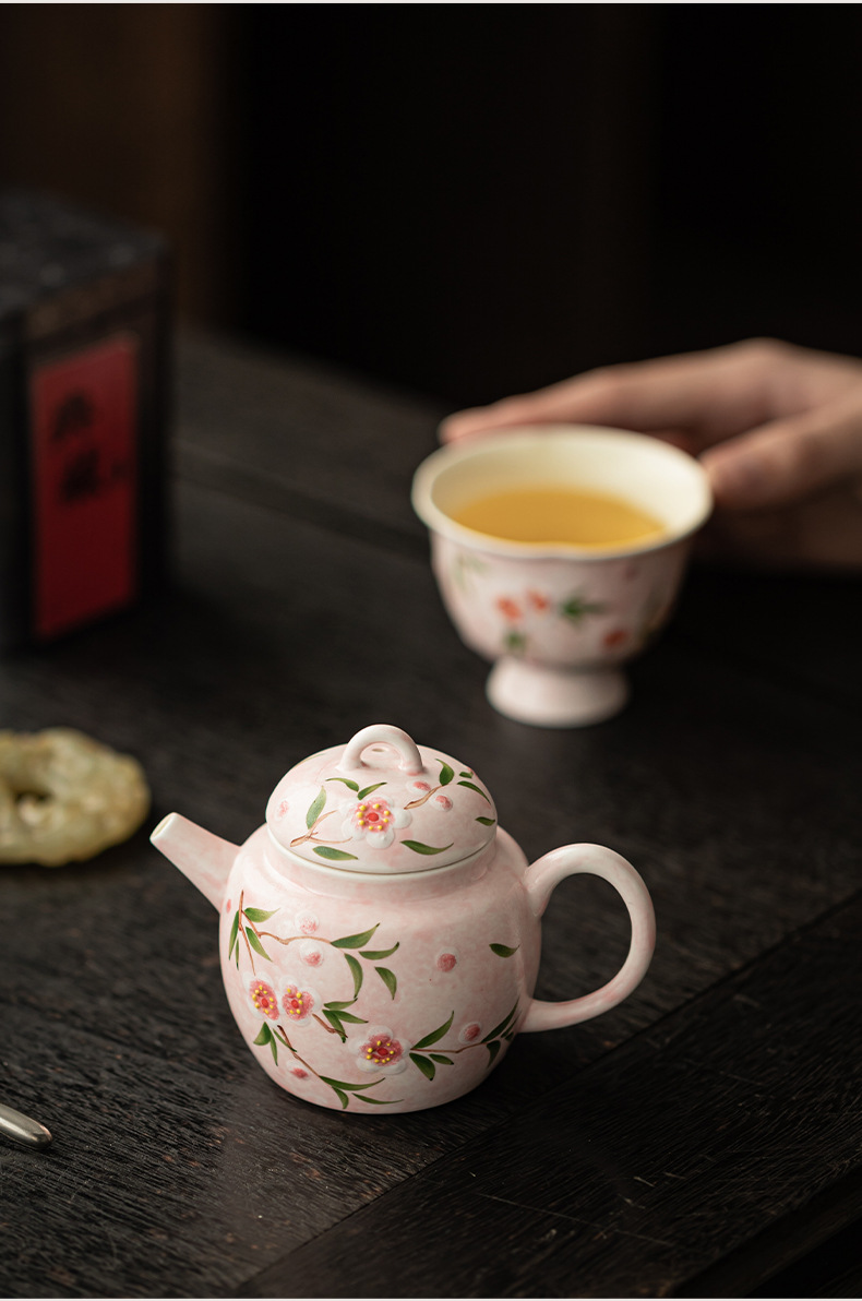 - Bộ ấm chén trà Kung Fu gốm sứ nhỏ họa tiết hoa đào vẽ tay, hộp quà tặng