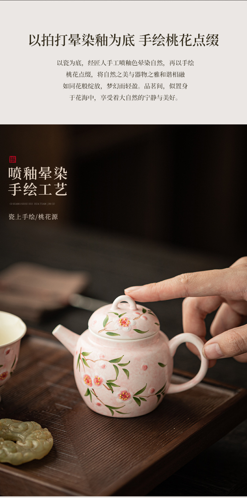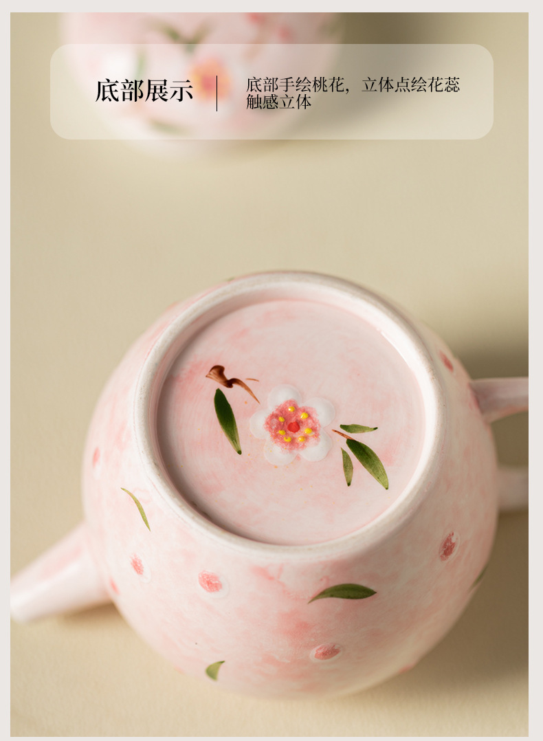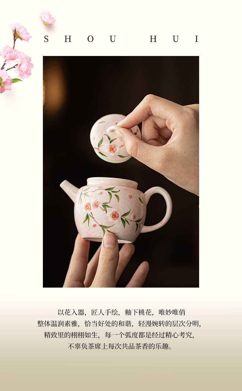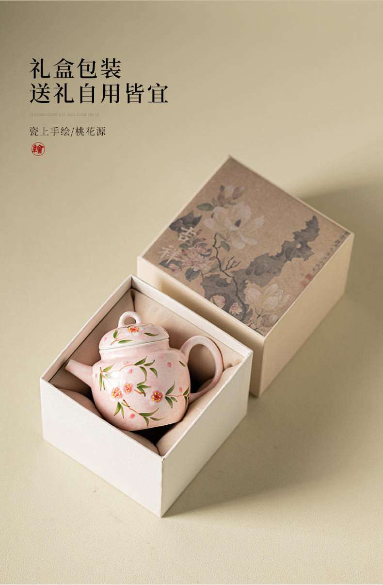 Bộ ấm chén trà Kung Fu gốm sứ nhỏ họa tiết hoa đào vẽ tay, hộp quà tặng