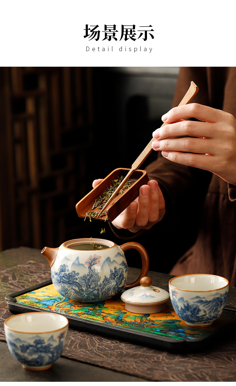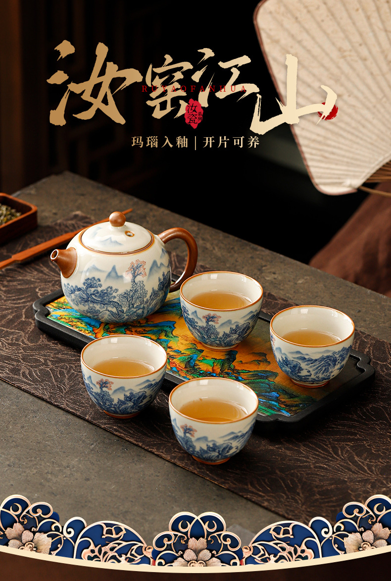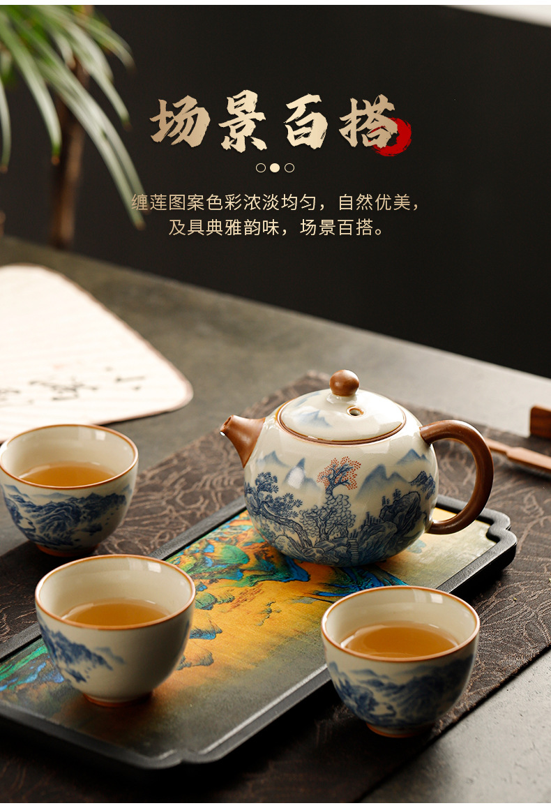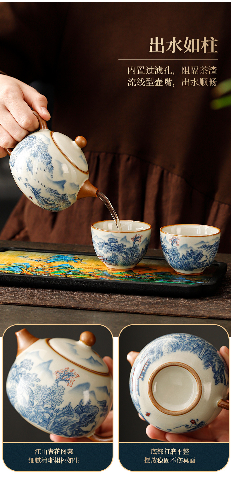 Bộ ấm chén trà Kung Fu hoa Ruyao nhỏ, một ấm bốn chén, dùng cho nhà ở, khách sạn, kiểu cổ điển Trung Hoa, màu xanh trắng.