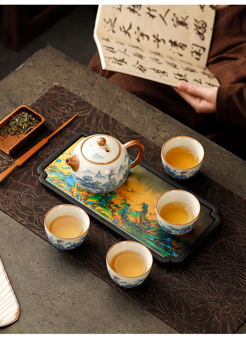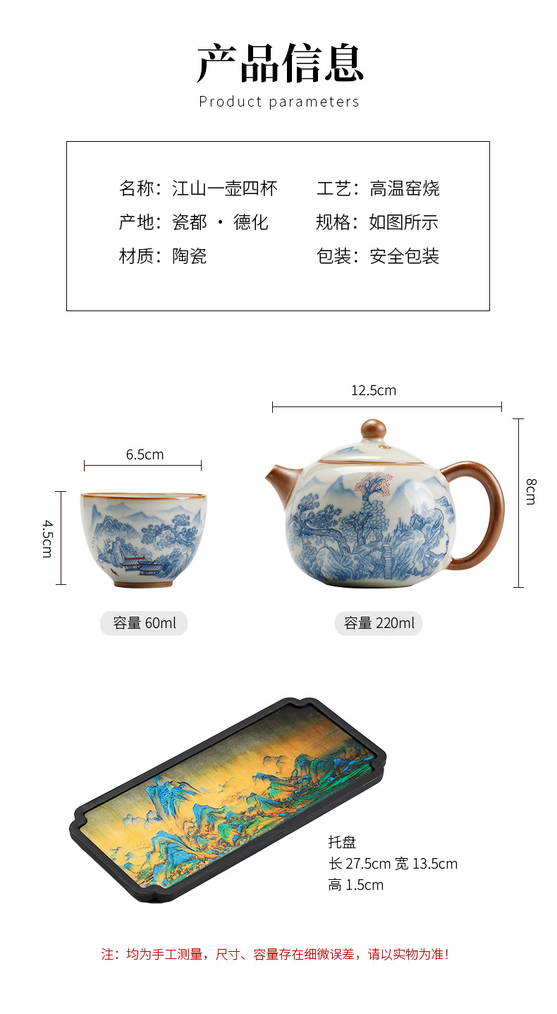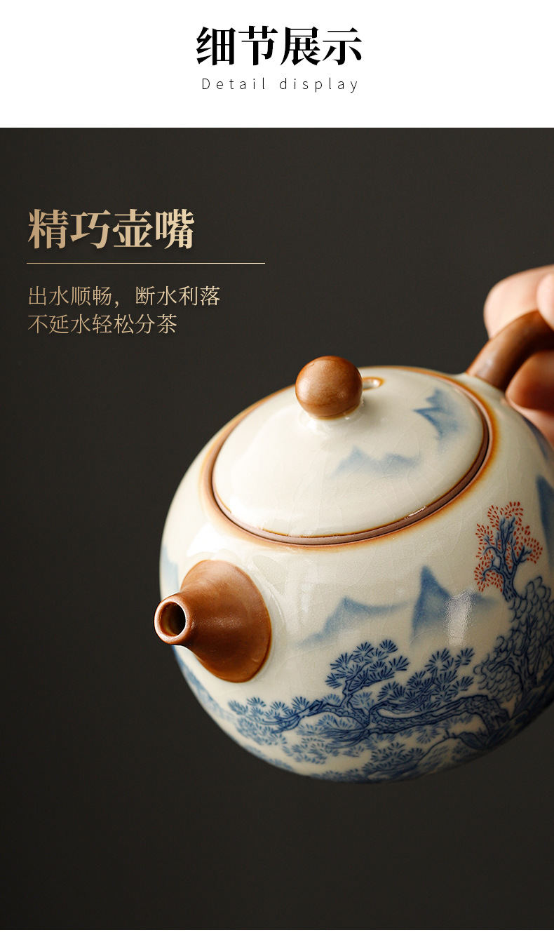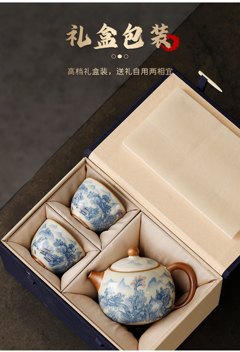 Bộ ấm chén trà Kung Fu hoa Ruyao nhỏ, một ấm bốn chén, dùng cho nhà ở, khách sạn, kiểu cổ điển Trung Hoa, màu xanh trắng.