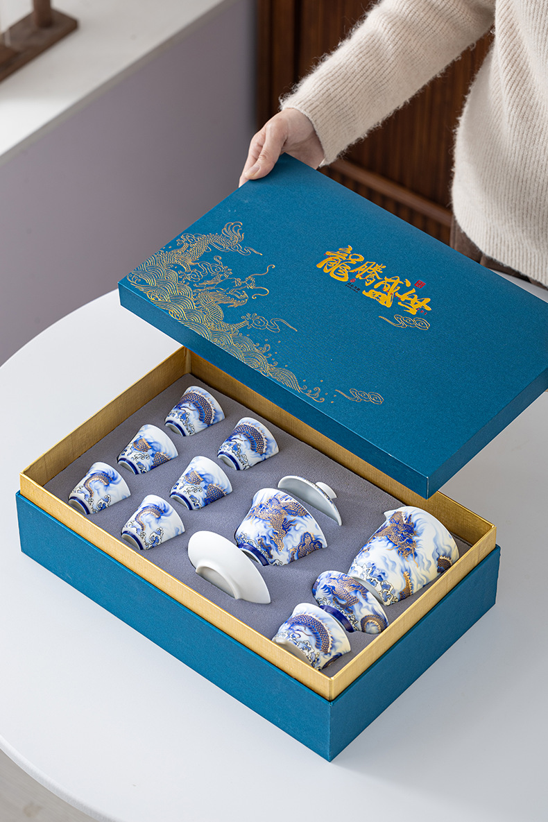 Bộ ấm chén trà Kung Fu Longteng Shengshi Dingyao gốm sứ tráng men, hộp quà tặng, quà lưu niệm doanh nghiệp