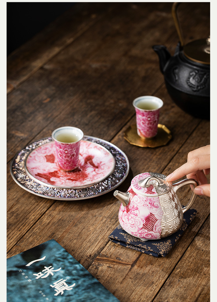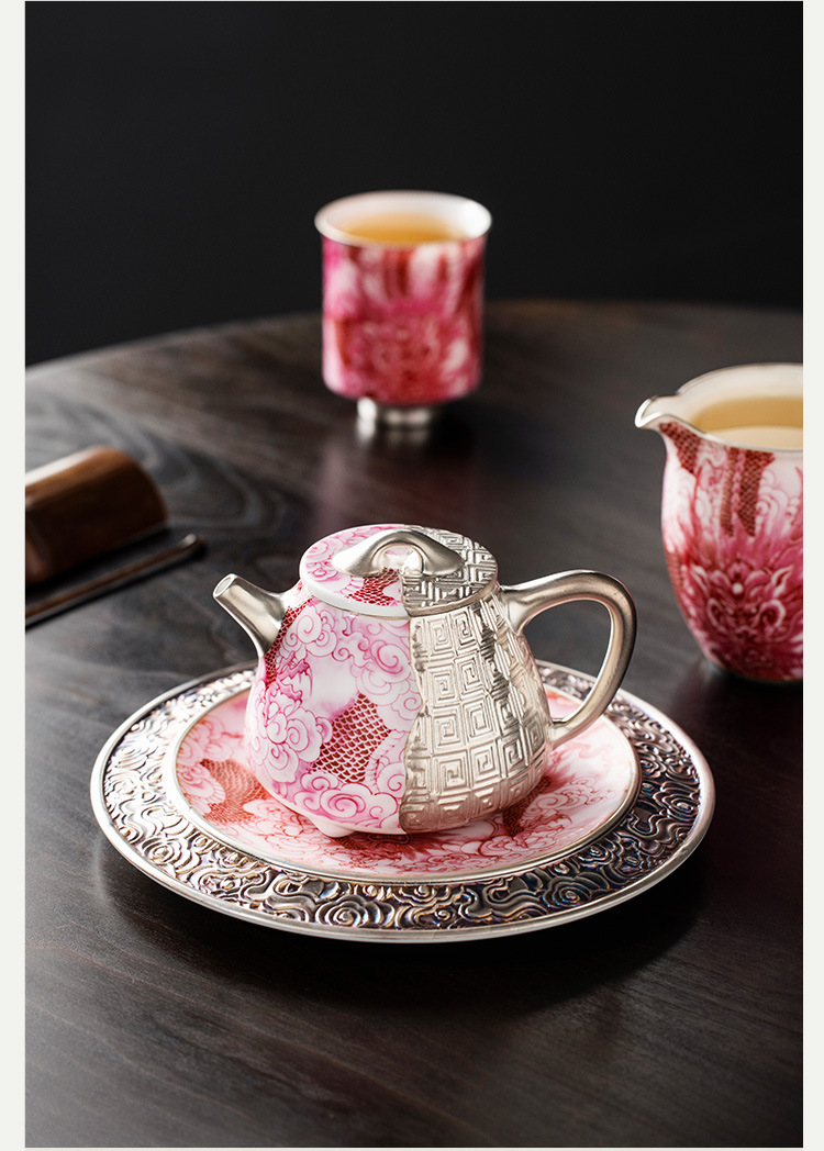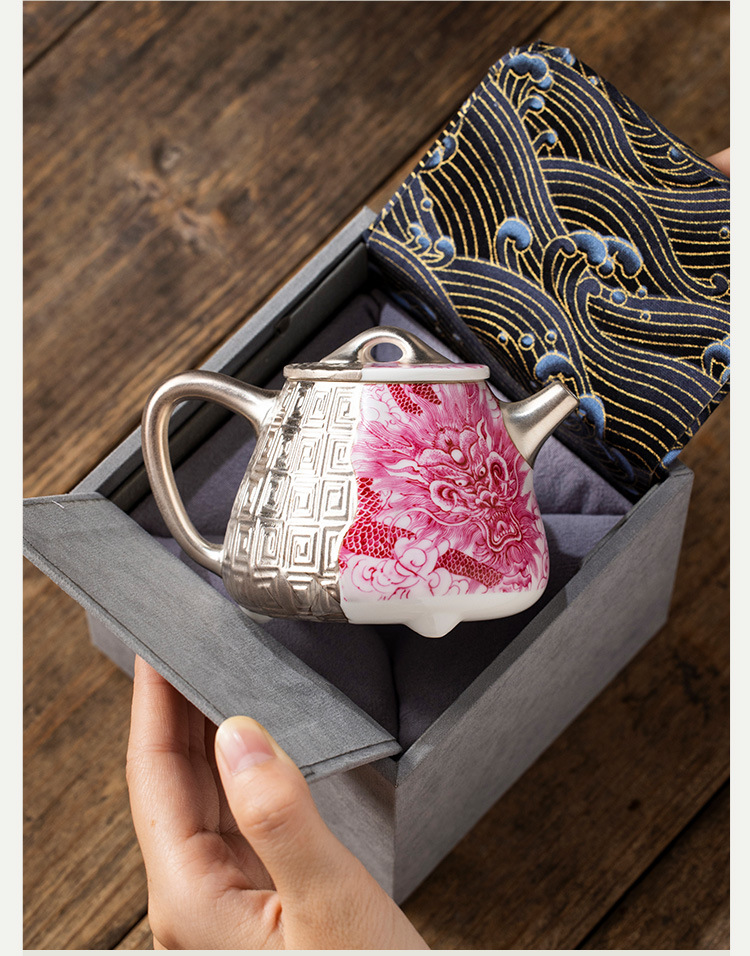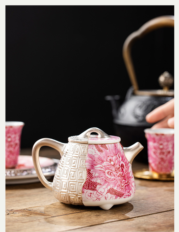 Bộ ấm trà hình rồng đỏ mạ bạc carmine, bộ ấm trà, quà tặng sinh nhật cho cha mẹ, người lớn tuổi và người lớn tuổi