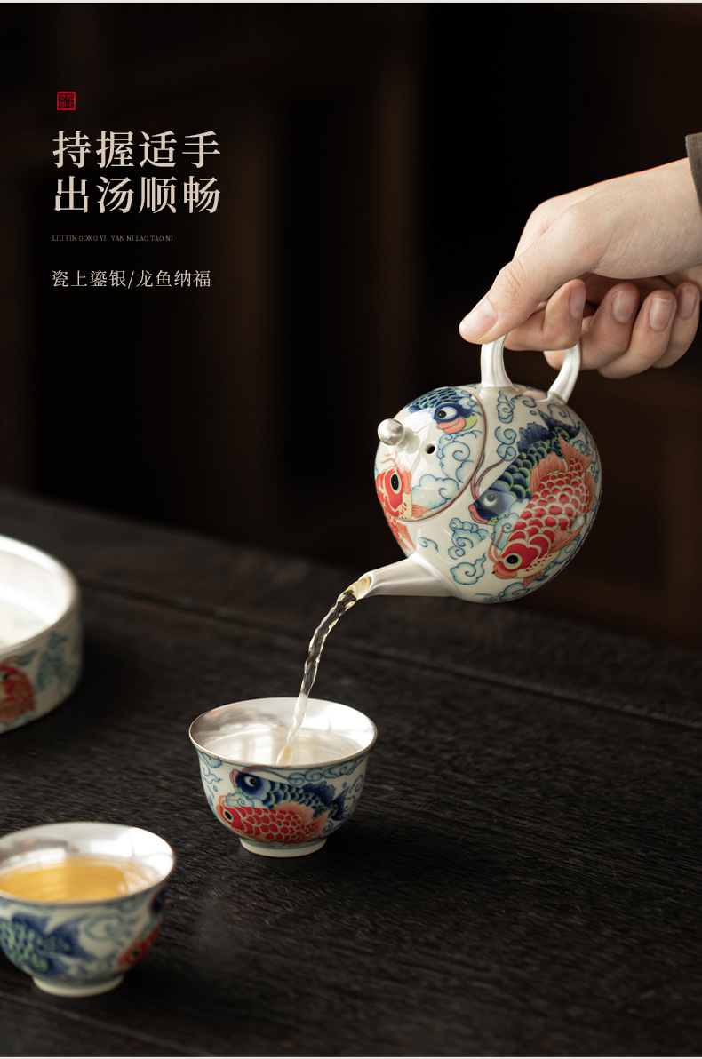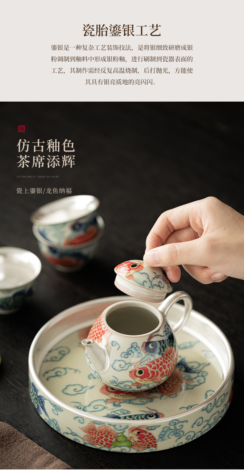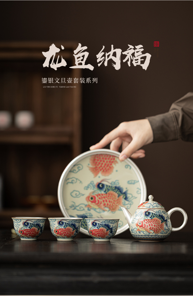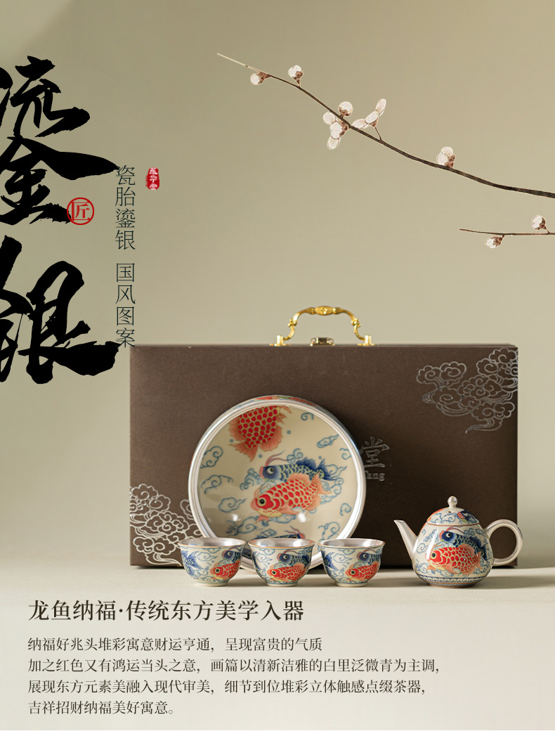 Bộ ấm trà Kung Fu gốm sứ một ấm ba chén cá rồng bạc bạc gia dụng tặng quà cho lãnh đạo và khách hàng