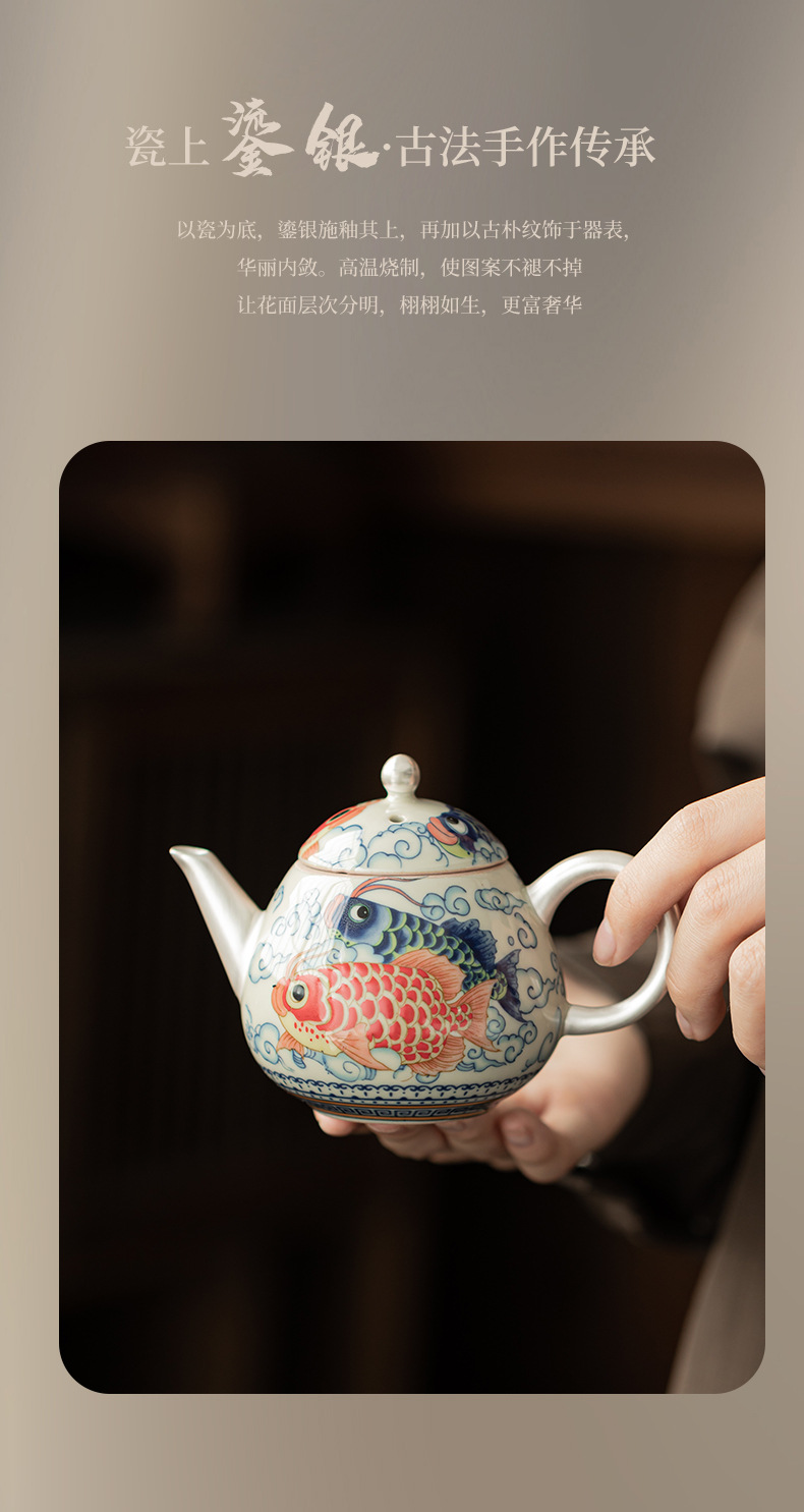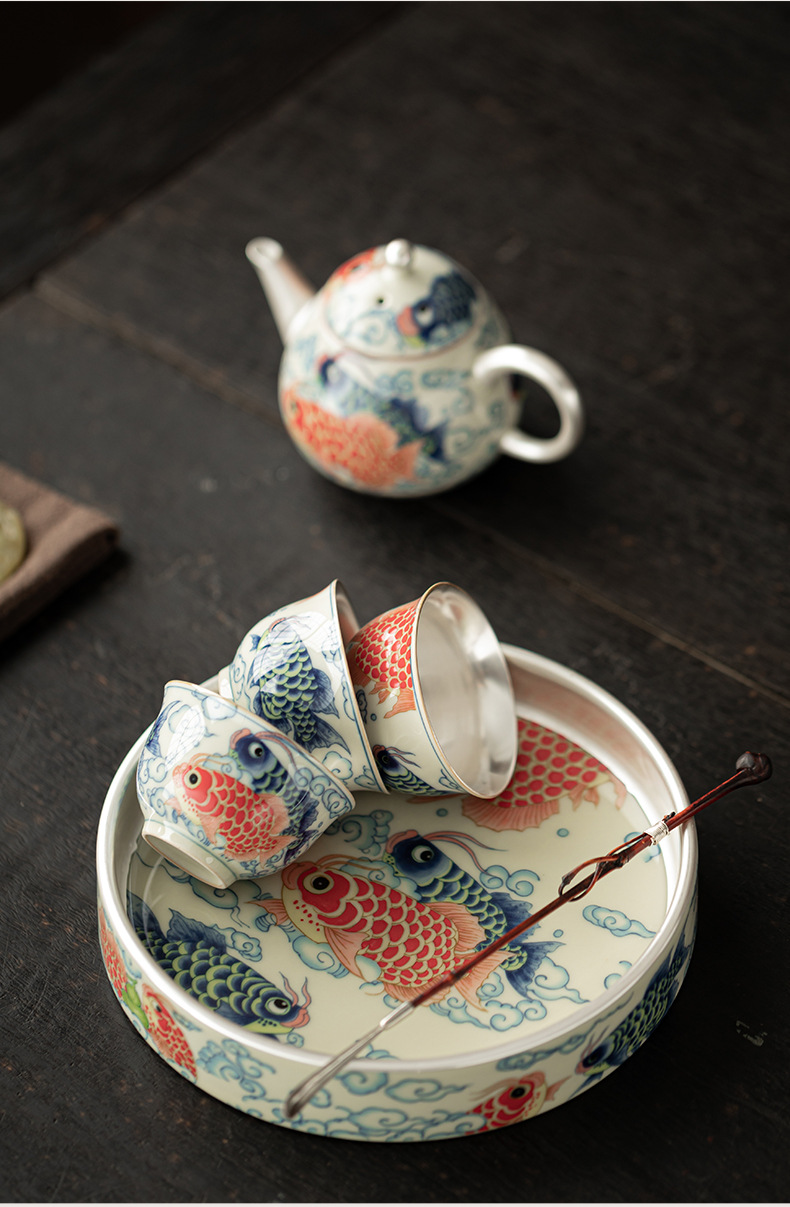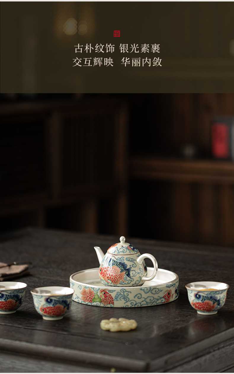 Bộ ấm trà Kung Fu gốm sứ một ấm ba chén cá rồng bạc bạc gia dụng tặng quà cho lãnh đạo và khách hàng