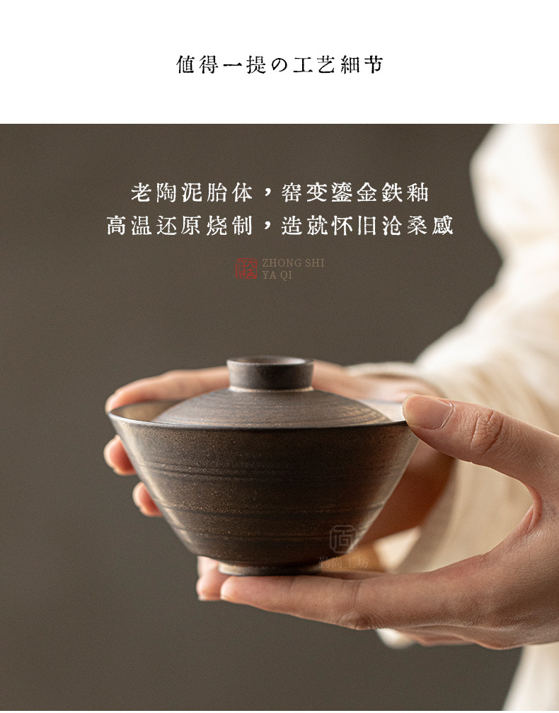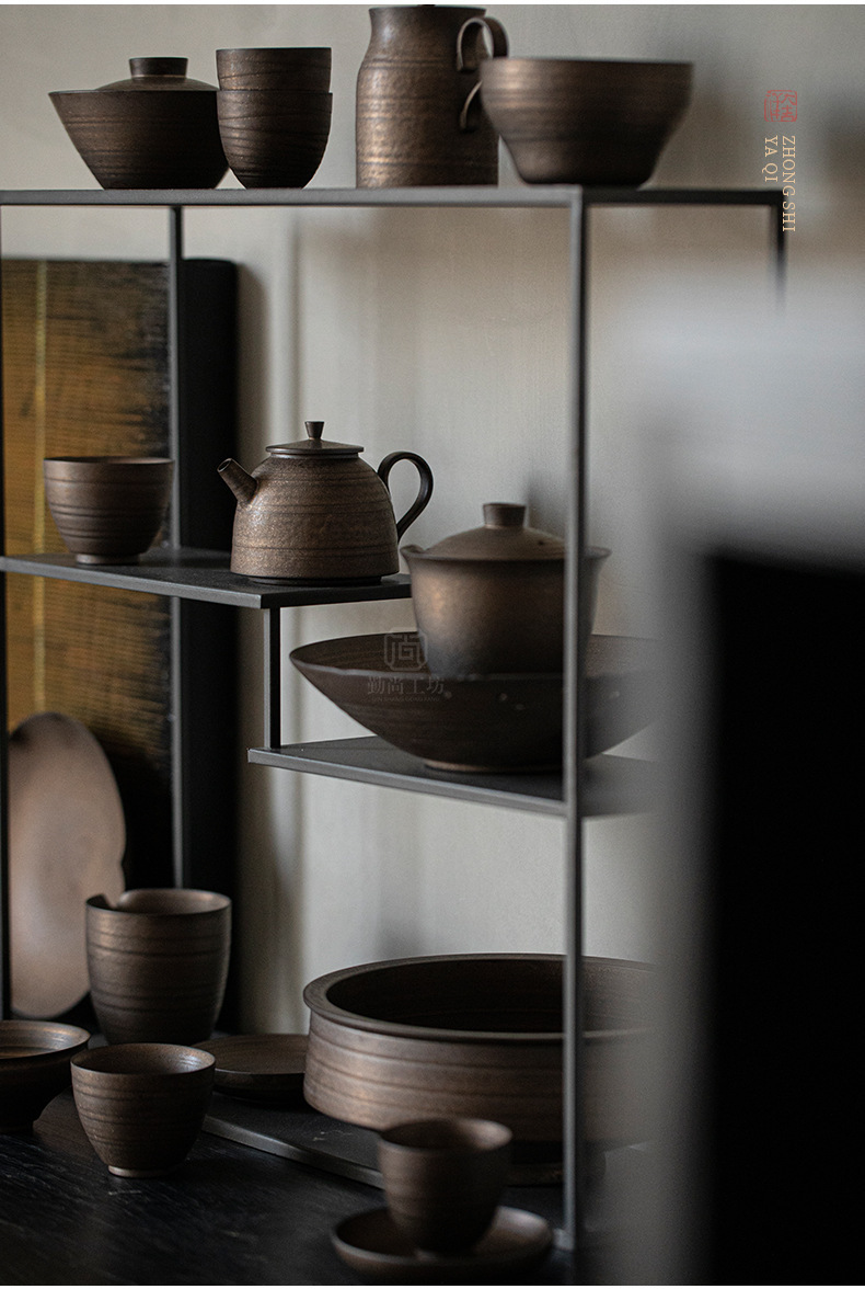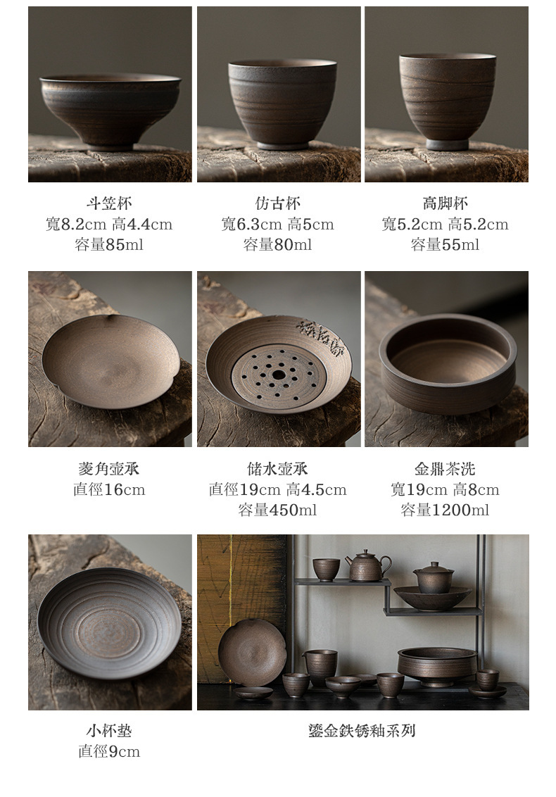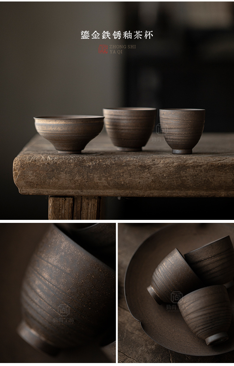 - Bộ ấm trà Kung Fu tráng men gỉ mạ vàng thủ công Dòng ấm trà gốm thô Hai cái bát có nắp Một chiếc cốc trà đơn