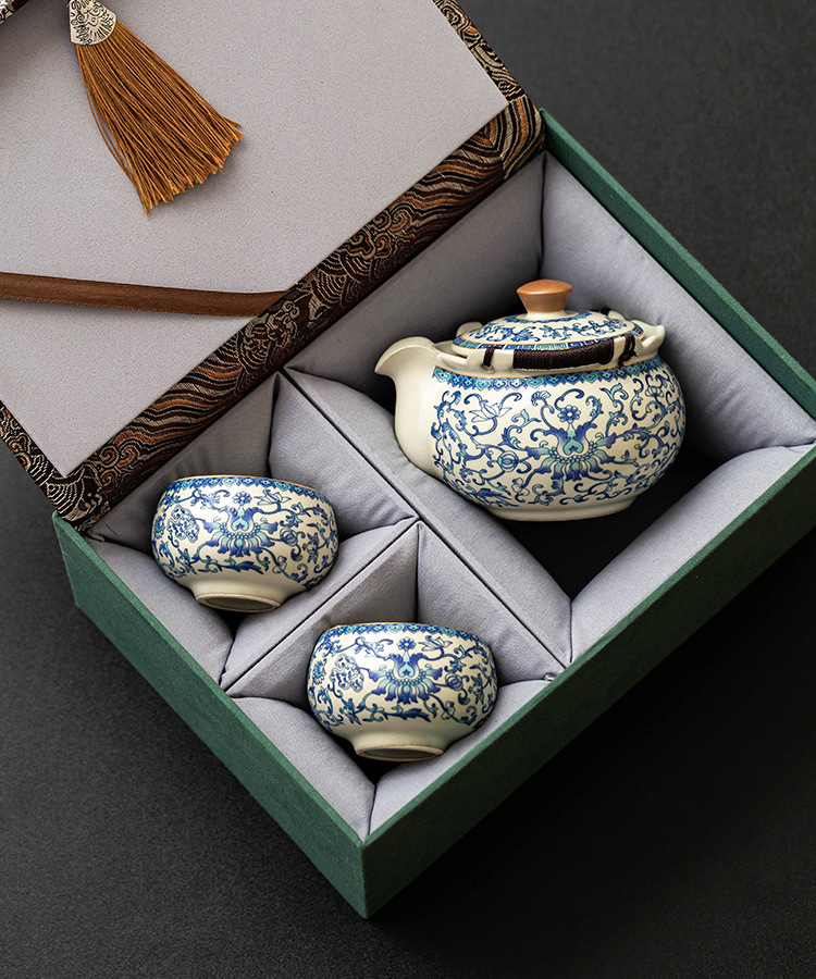 Bộ ấm trà Ruyao, hộp quà, hoa sen xanh trắng, một ấm hai chén, quà Tết thiết thực cho cha mẹ người lớn tuổi