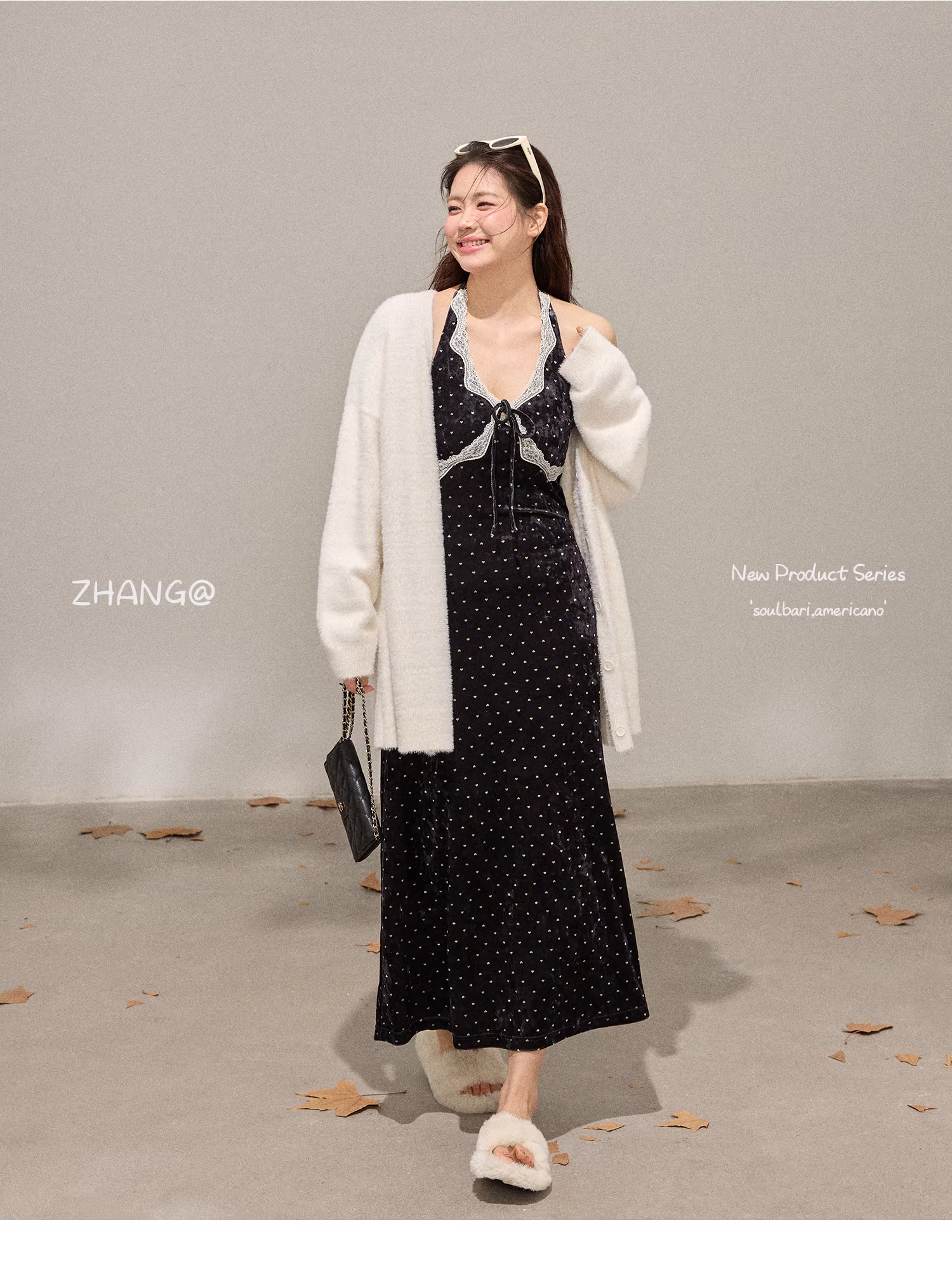 - Bộ áo khoác len và đầm liền thân chấm bi ren Pháp dáng ôm mùa đông dành cho phụ nữ cỡ lớn