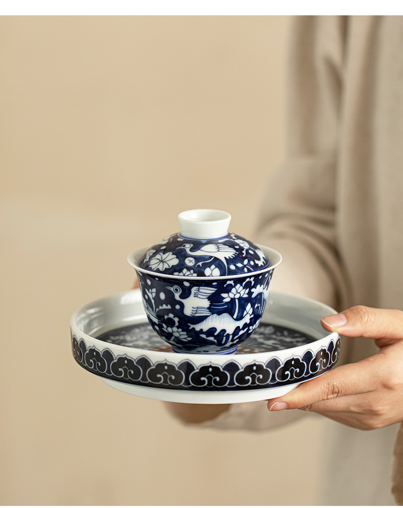 Bộ bát có nắp màu xanh và trắng làm thủ công Jingdezhen Bộ đồ trà gốm sứ dụng cụ pha trà cốc gia dụng cốc chủ nhân