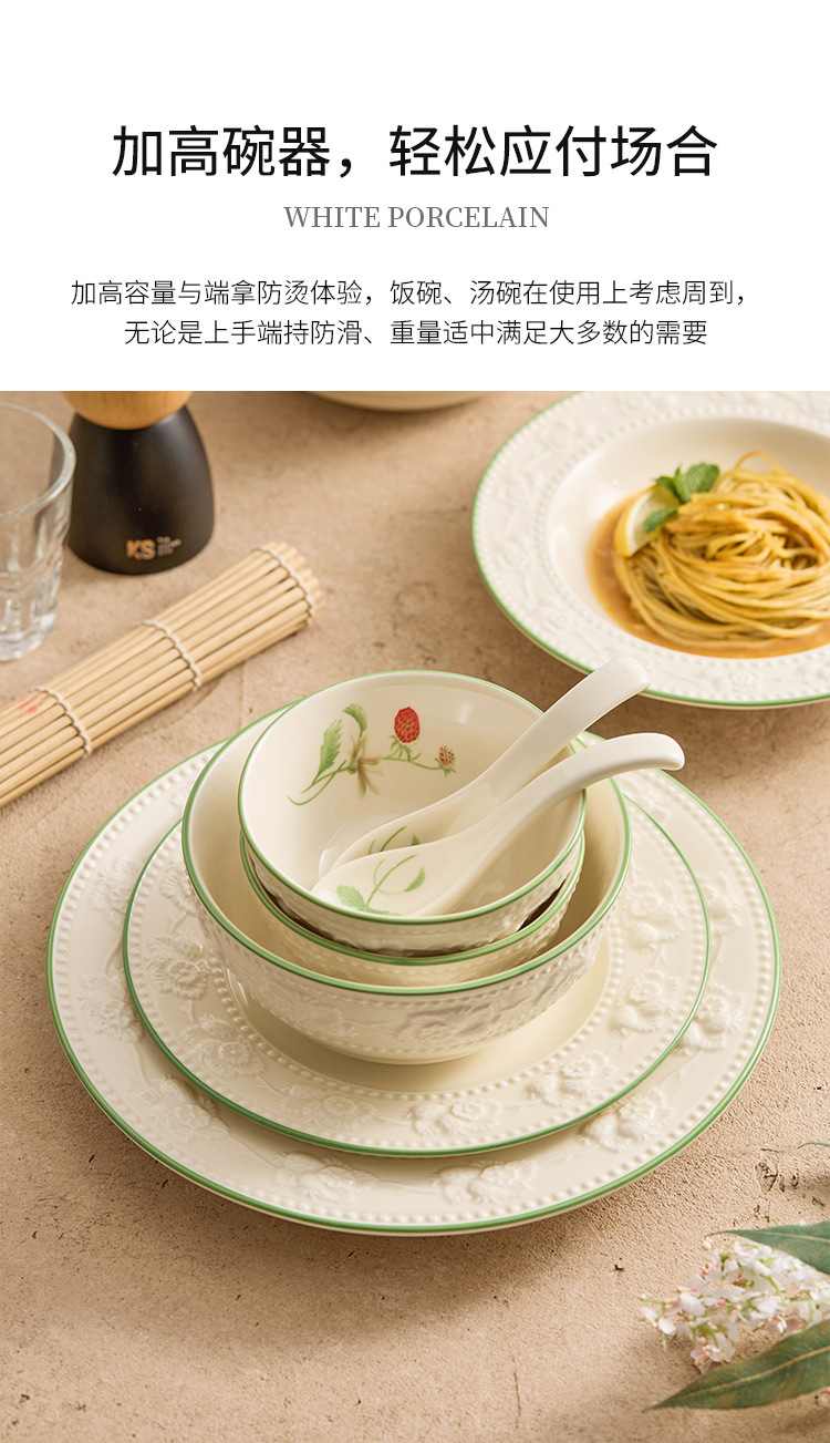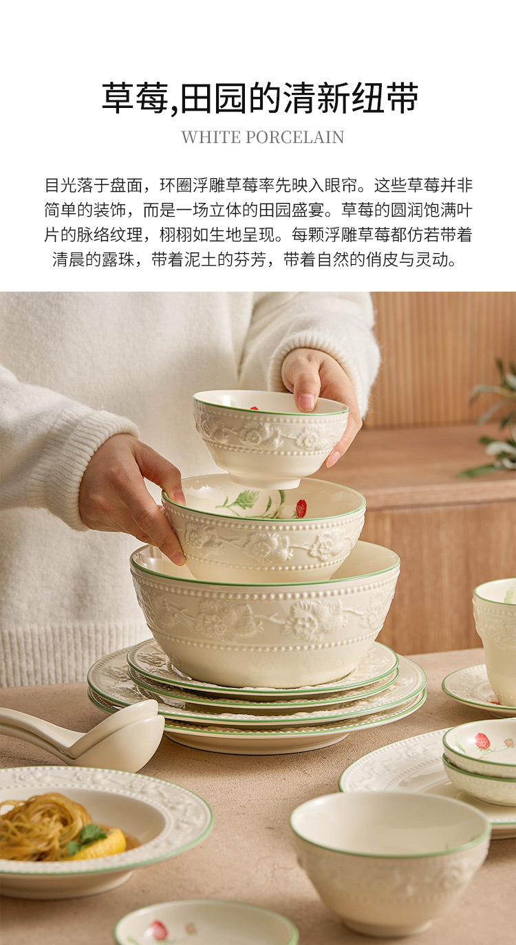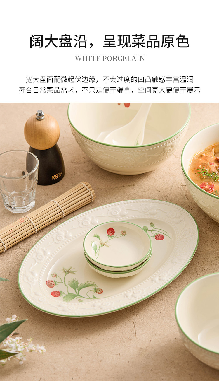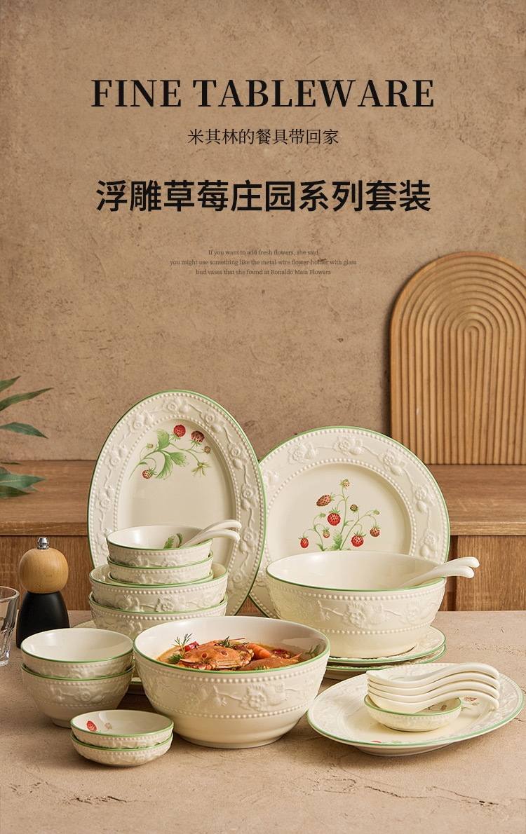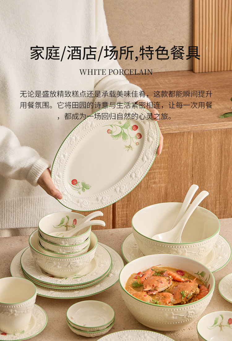 Bộ bát đĩa dâu tây chạm nổi, bát đĩa gia dụng, bộ bát đĩa gốm sứ giá trị cao, bộ bát đĩa tân gia, bộ đồ ăn quà tặng nhà mới