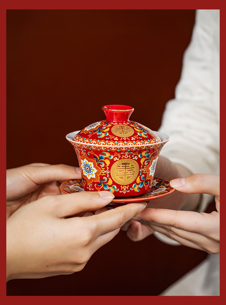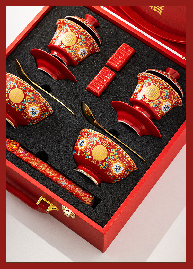 Bộ bát đĩa và đũa tân hôn tráng men Bộ trà hồi môn Trung Quốc bát có nắp màu đỏ thay đổi cốc trà hạnh phúc quà cưới