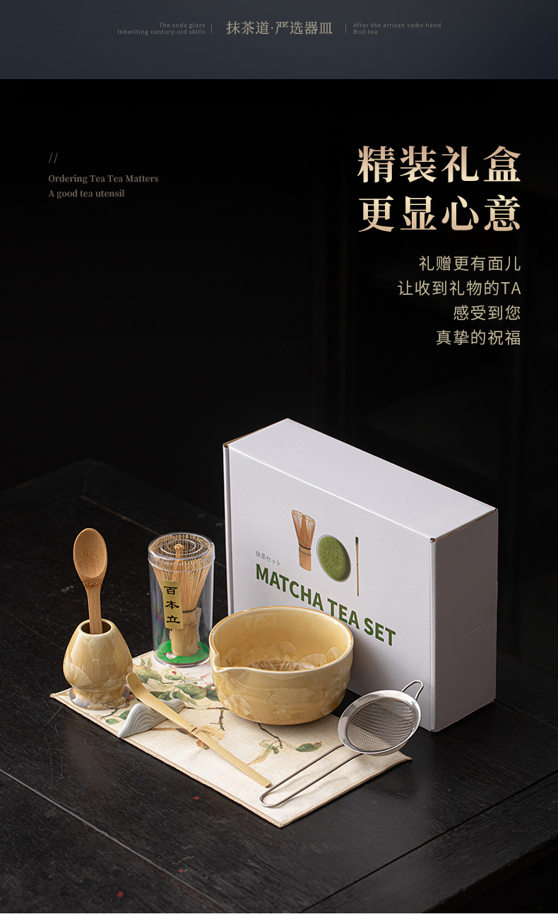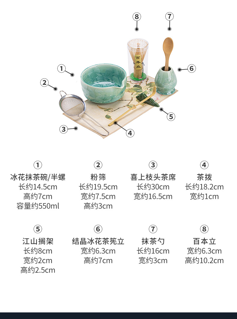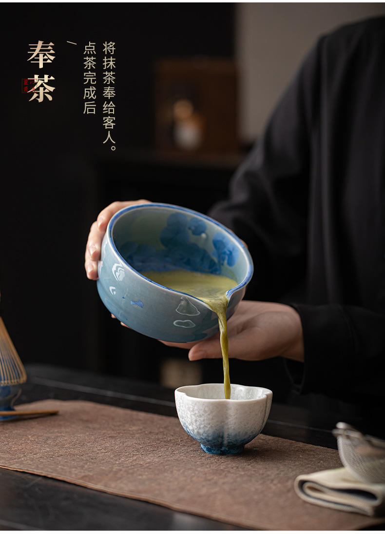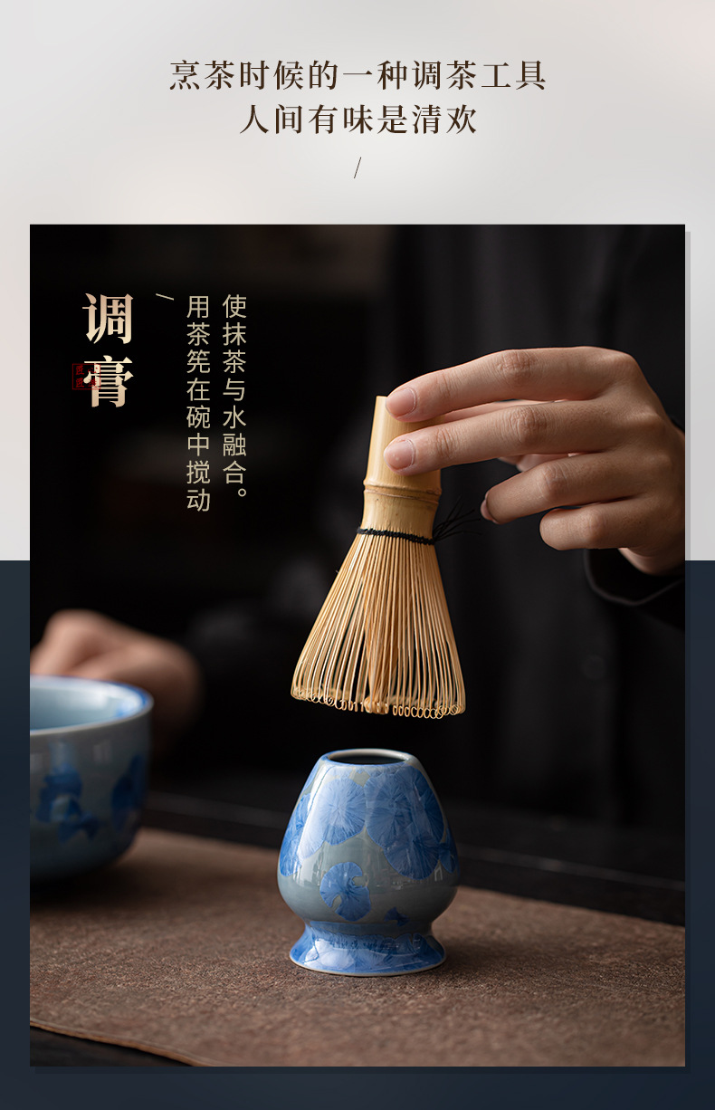 - Bộ bốn món đồ dùng pha trà bằng gốm sứ matcha hoa băng với men nung trong lò, bát trà và dụng cụ đánh trà trong lễ trà thời nhà Tống.