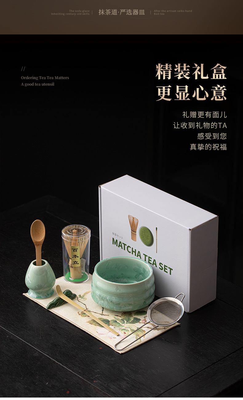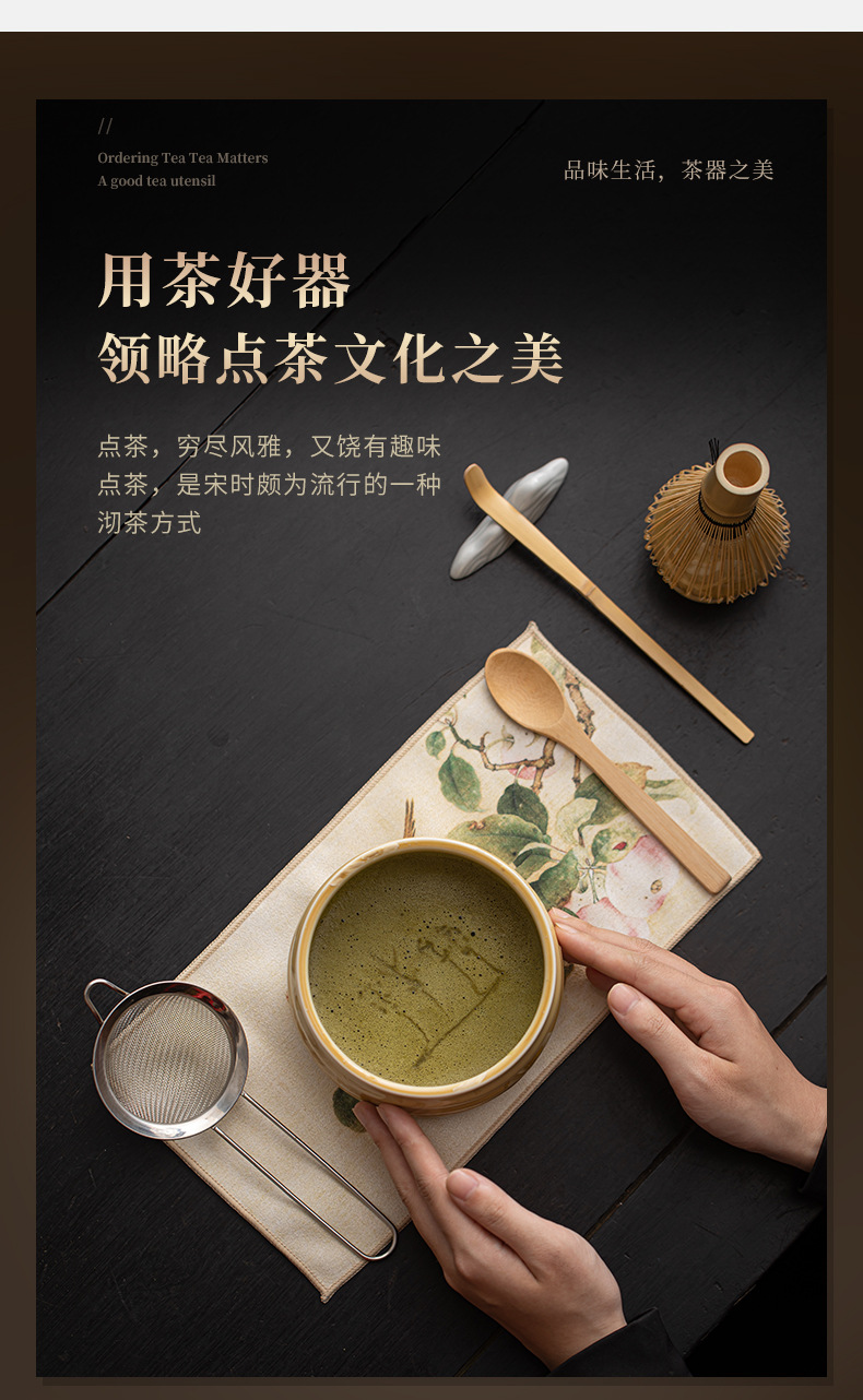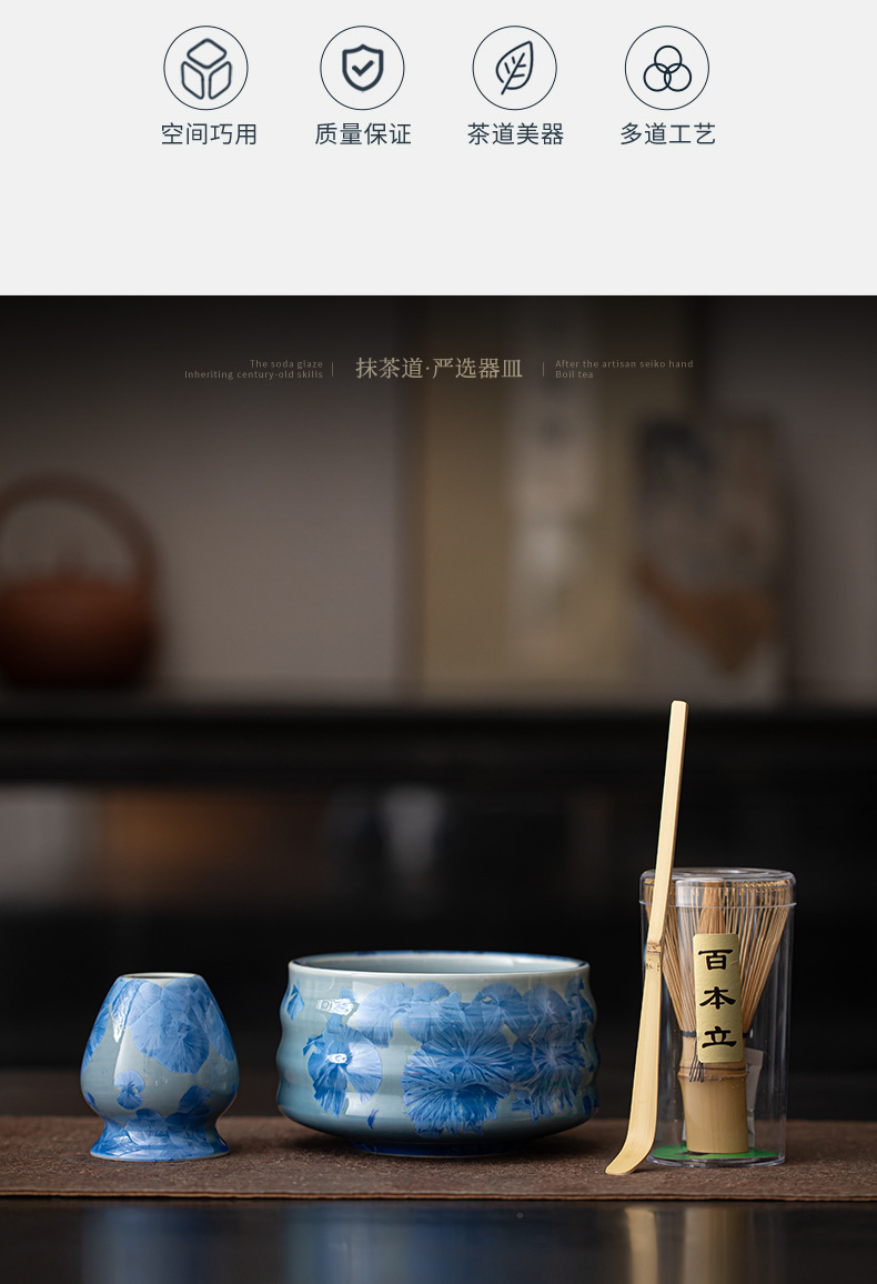 - Bộ bốn món gốm sứ trà đạo thời nhà Tống với men nung trong lò, matcha hoa băng, bát trà, máy đánh trà, bàn chải trà và thìa trà.