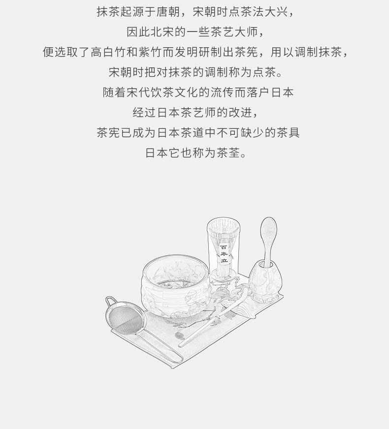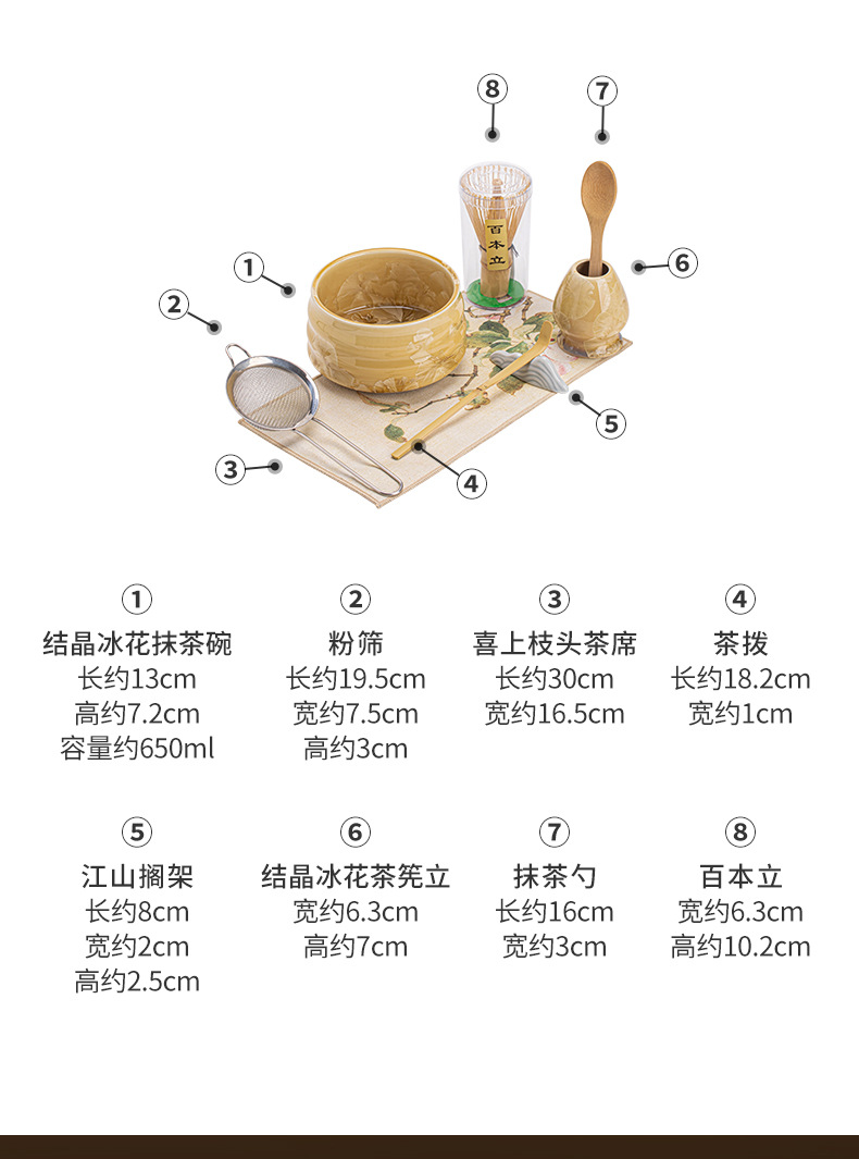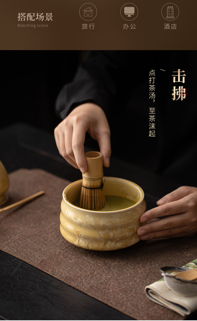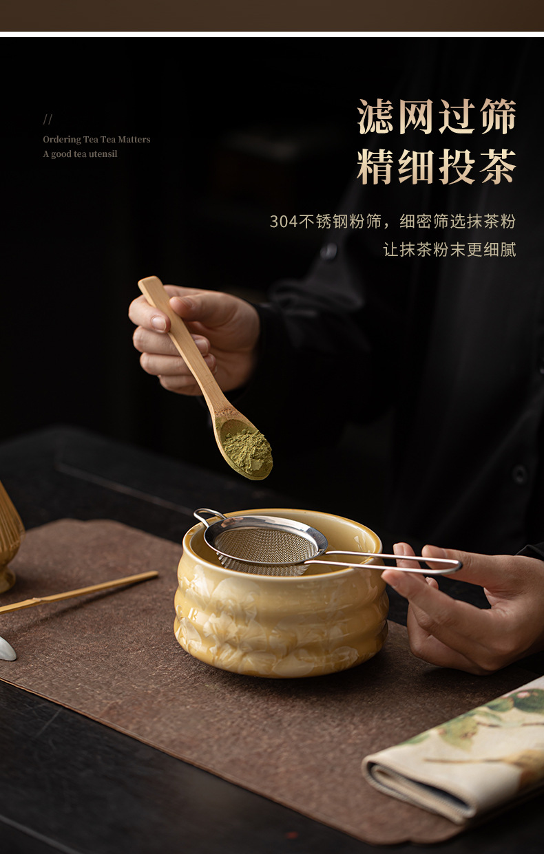 - Bộ bốn món gốm sứ trà đạo thời nhà Tống với men nung trong lò, matcha hoa băng, bát trà, máy đánh trà, bàn chải trà và thìa trà.