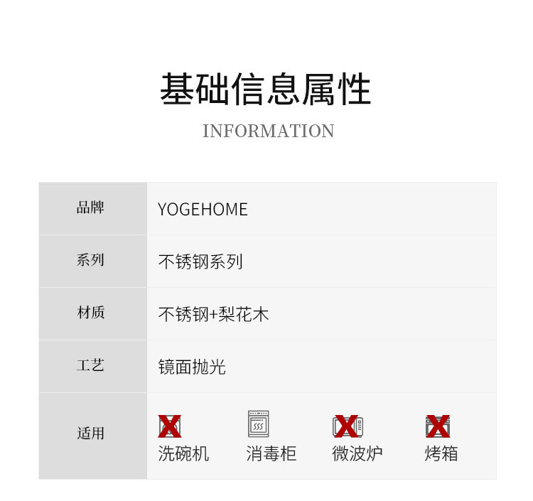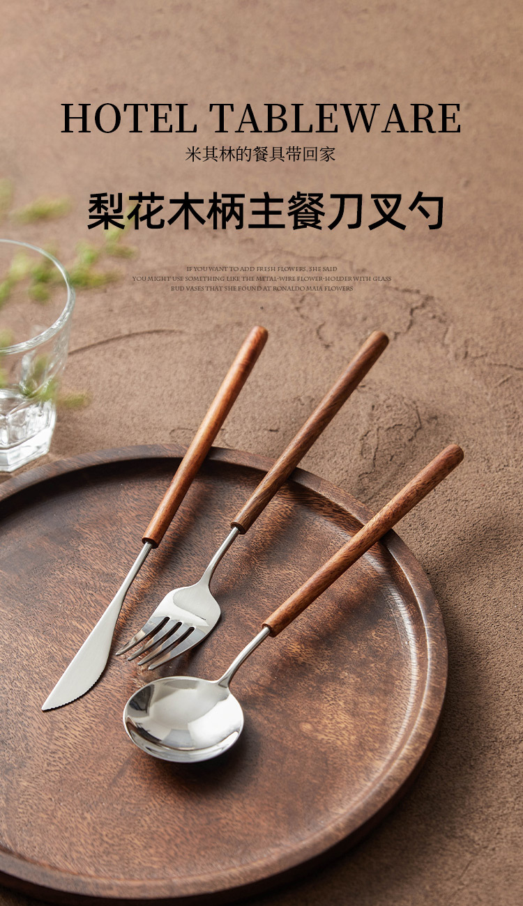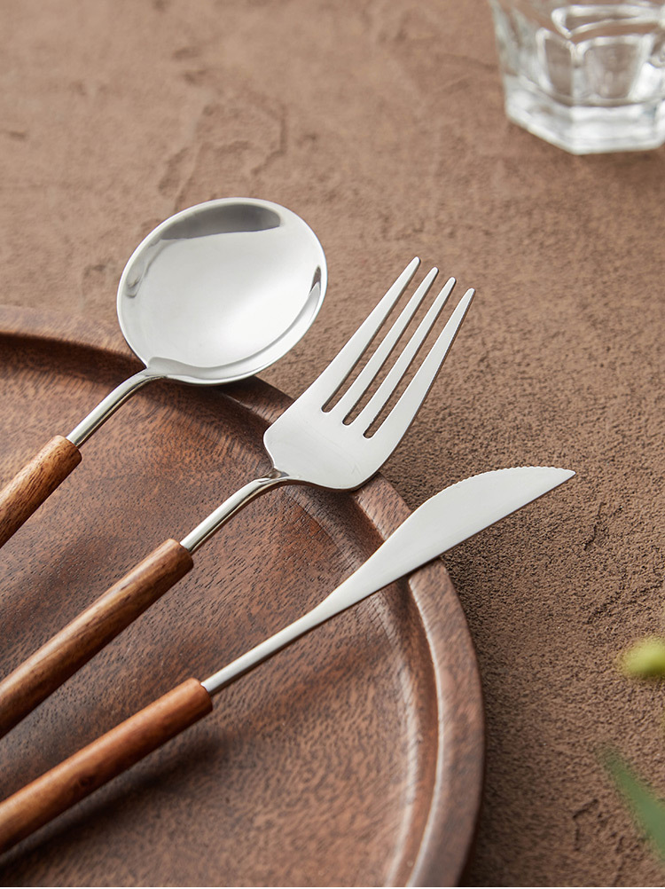 Bộ đồ ăn phương Tây tay cầm bằng gỗ hoa lê, dao, nĩa và thìa ba miếng, inox 304 thương mại, thìa tráng miệng bít tết