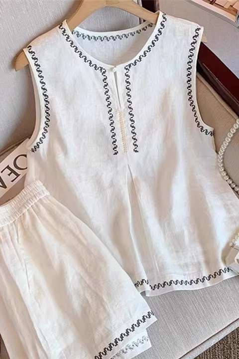 - Bộ đồ hè kiểu dáng cổ điển sang trọng thêu vải lanh thời trang cho bé gái, gồm áo vest và quần đùi hai mảnh