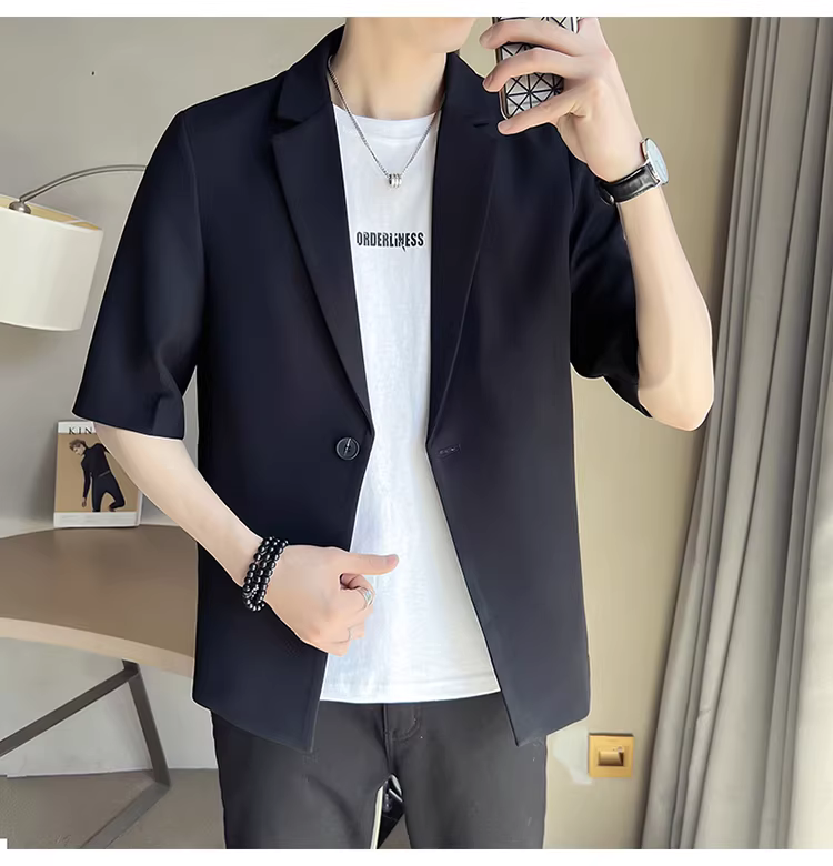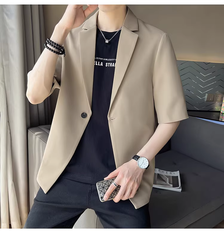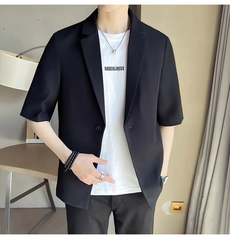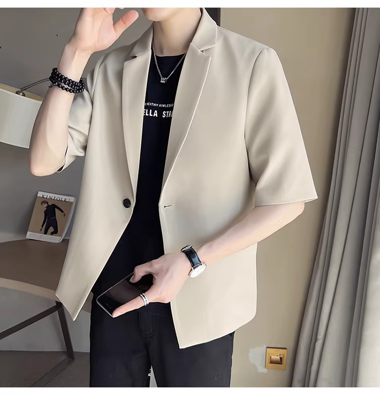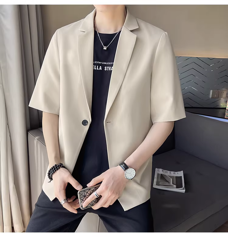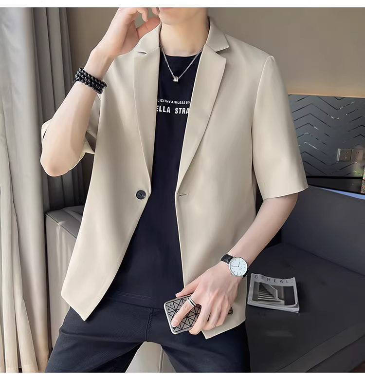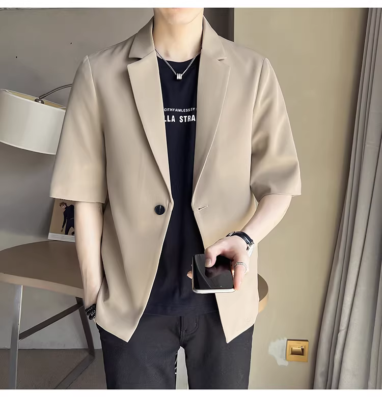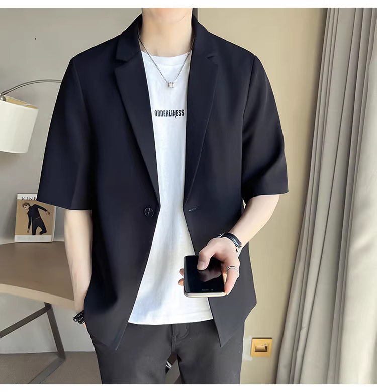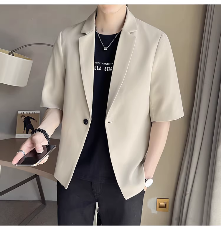 Bộ đồ lụa mỏng mùa hè dành cho nam, tay áo ba phần tư, áo khoác ngắn tay nam dáng rộng hợp thời trang, đa năng và phong cách.