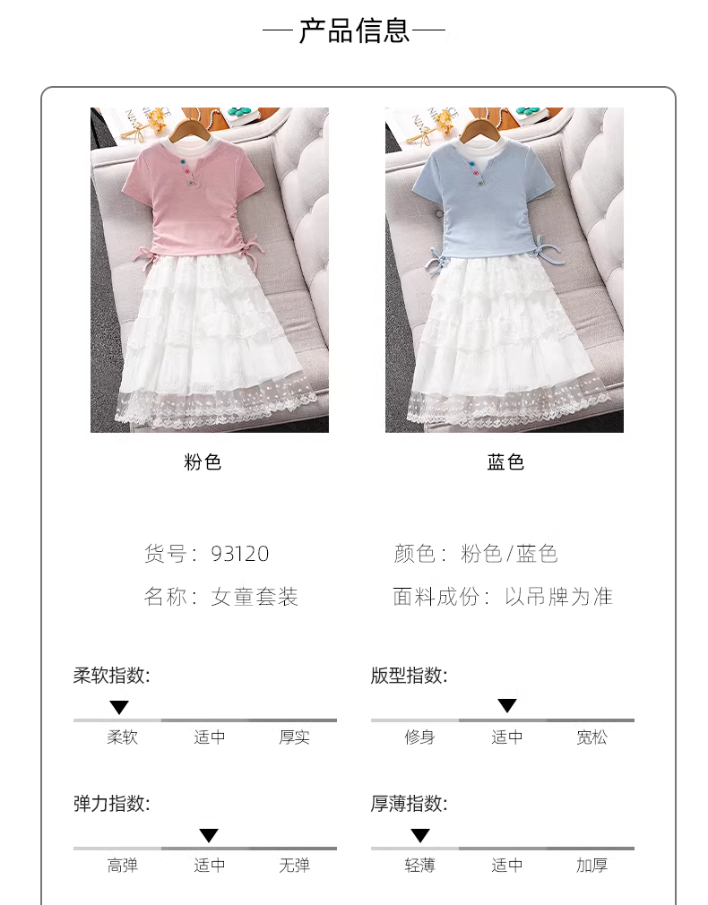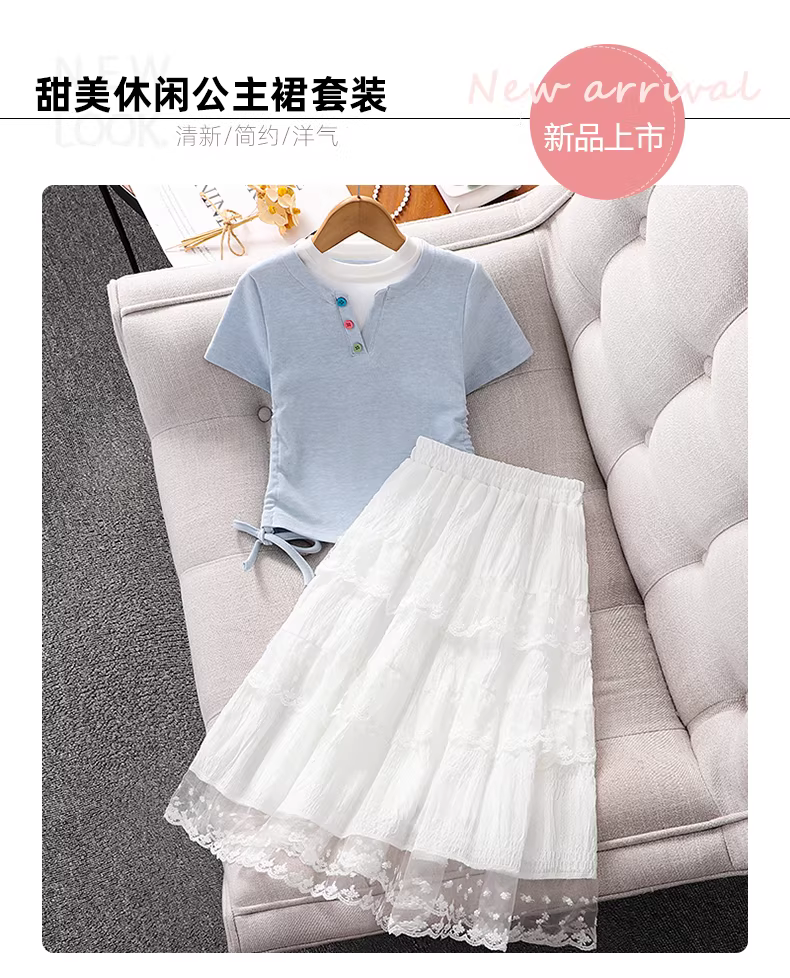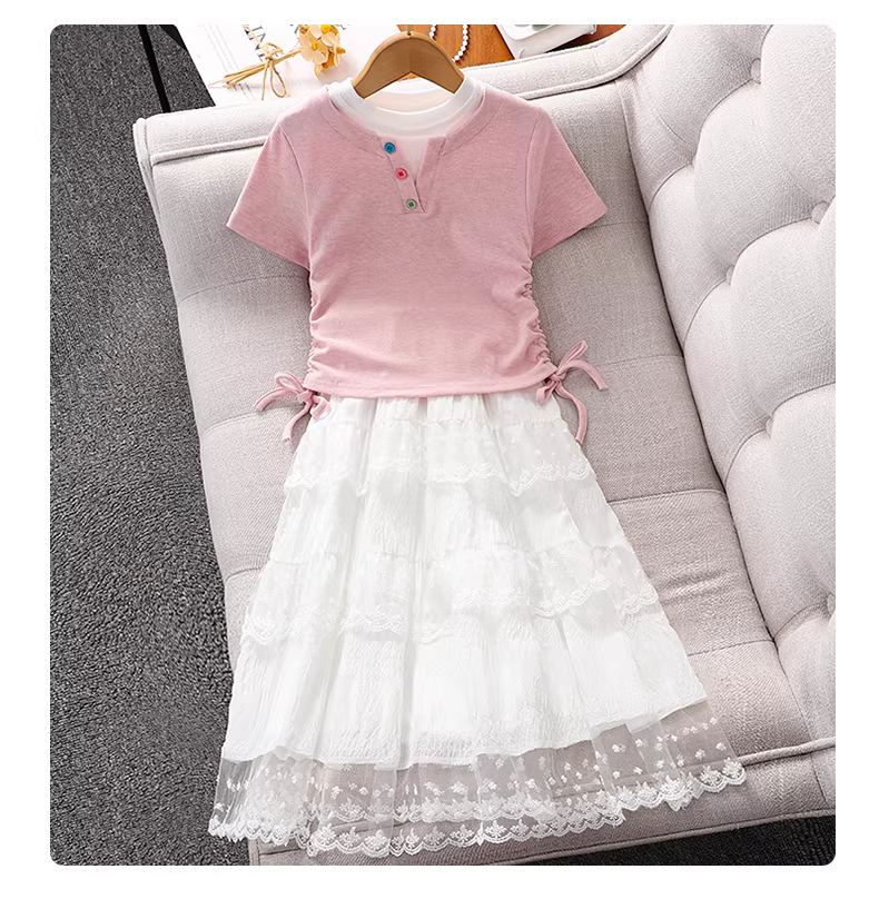 - Bộ đồ nữ bé gái hè 2025 kiểu mới, áo thun bé gái tay ngắn kiểu casual, váy bánh bèo ren, đầm hè