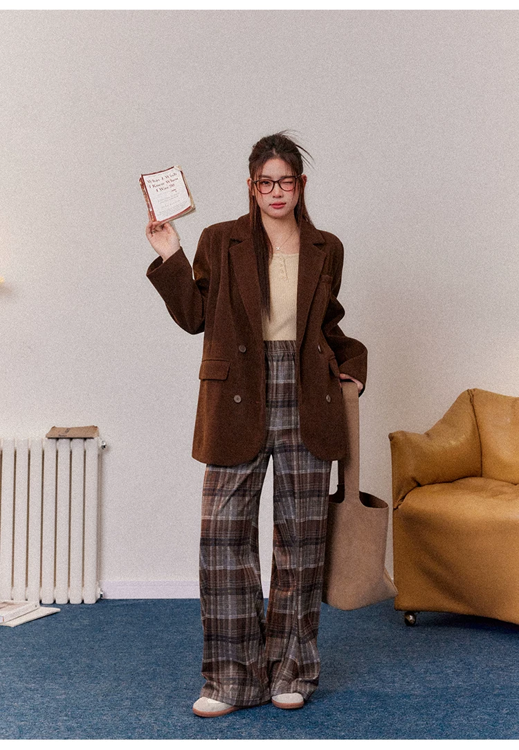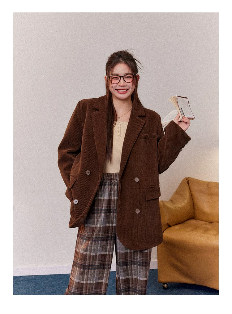 Bộ đồ nữ cỡ lớn kiểu retro, quần ống rộng kẻ ca rô màu nâu, áo khoác blazer chất liệu corduroy dành cho nữ